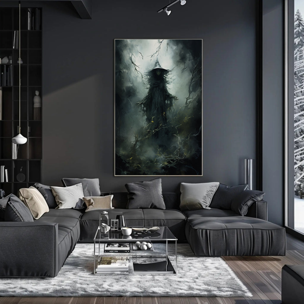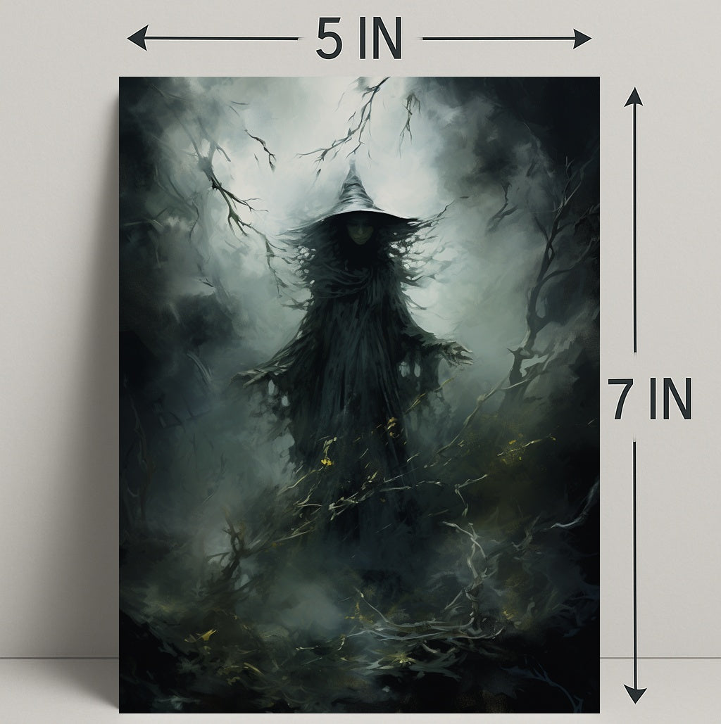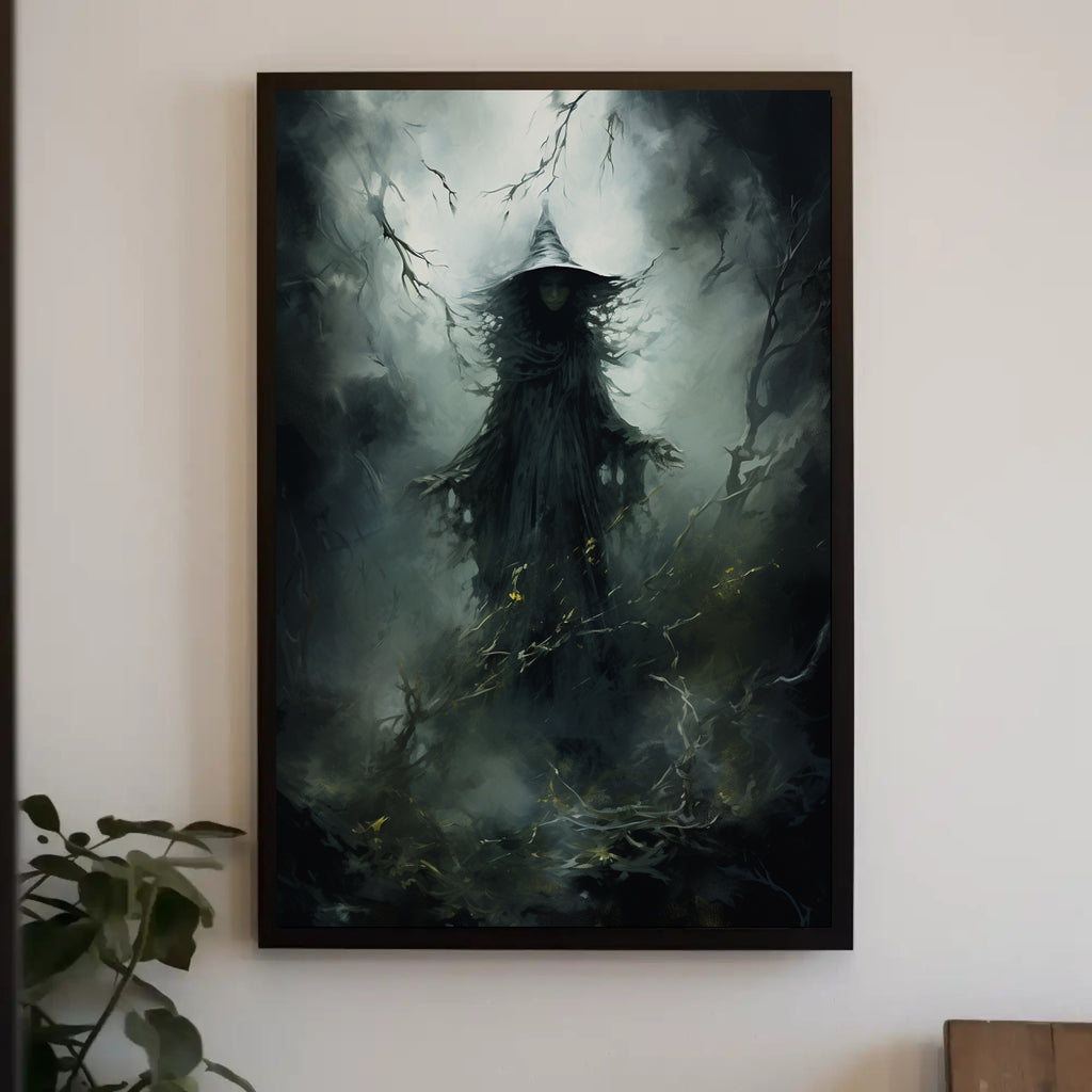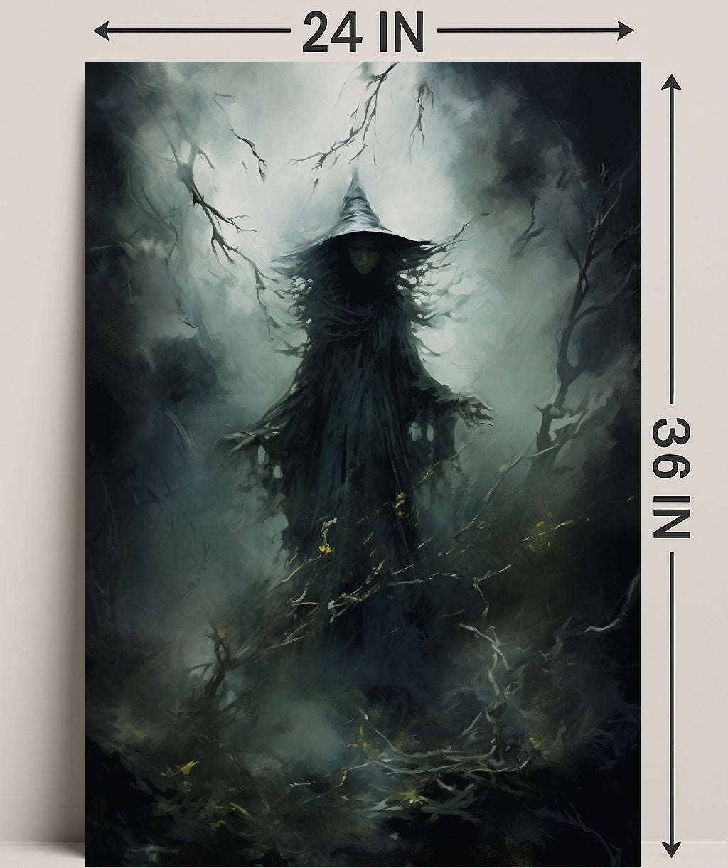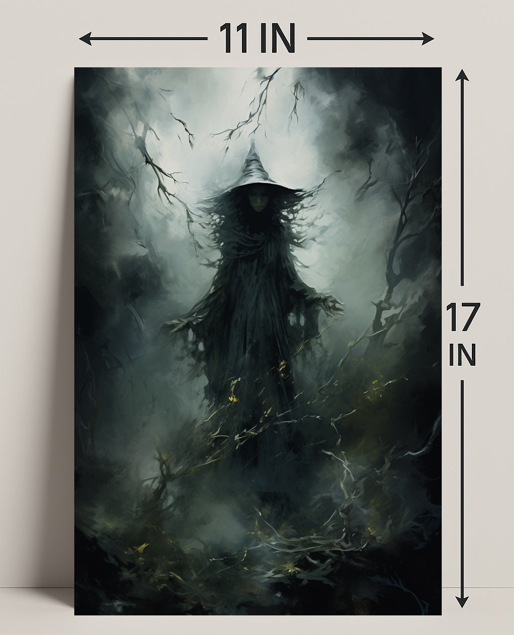 Invoke mystery and style with The Enigmatic Witch Poster from PosterGoat — a hauntingly beautiful art print that transforms any wall into a moody focal point. A cloaked figure emerges from swirling fog, framed by twisted branches and delicate gold flecks that catch the eye. This dramatic piece blends minimalist composition with rich, scenic atmosphere to create a timeless statement for living rooms, bedrooms, studios, or themed spaces.
