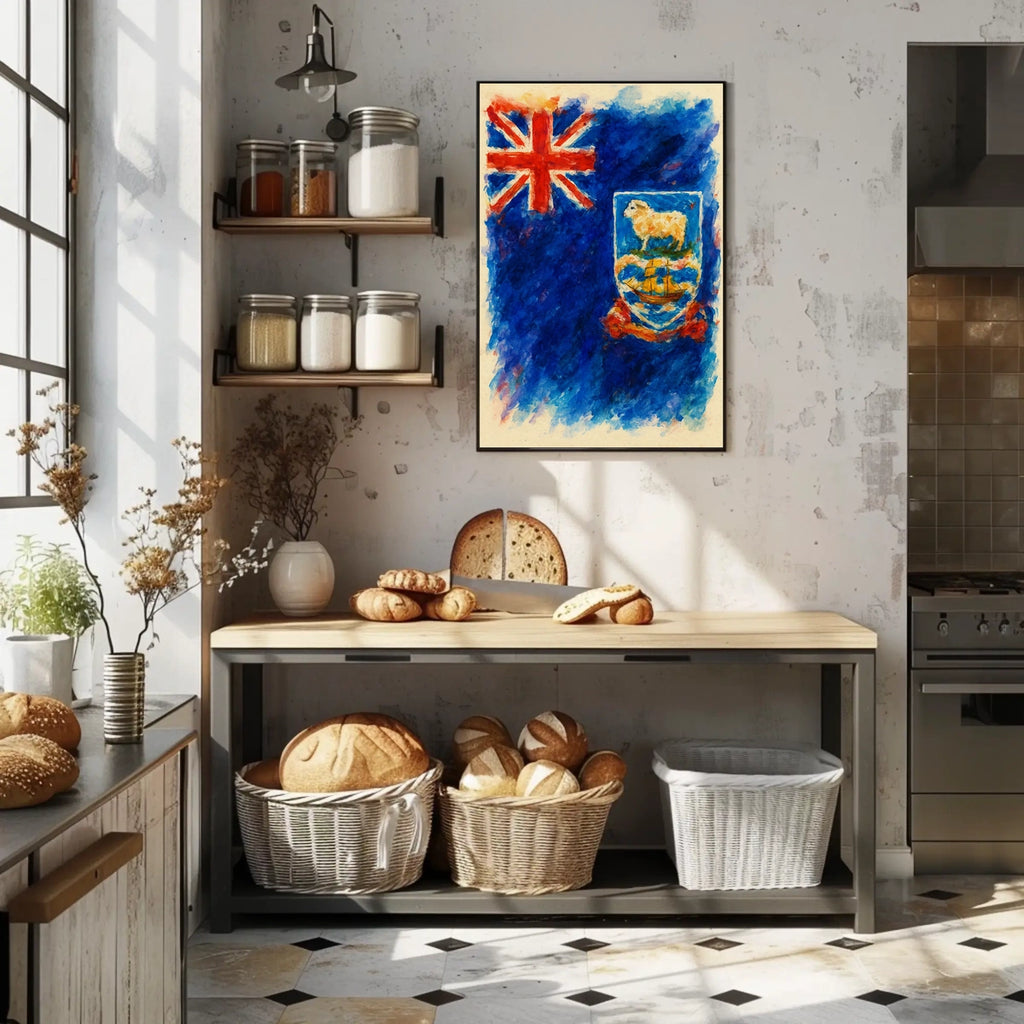 This poster captures the essence of The Falkland Islands Flag, blending bold color and coastal-inspired imagery to evoke wanderlust and national pride in any room.