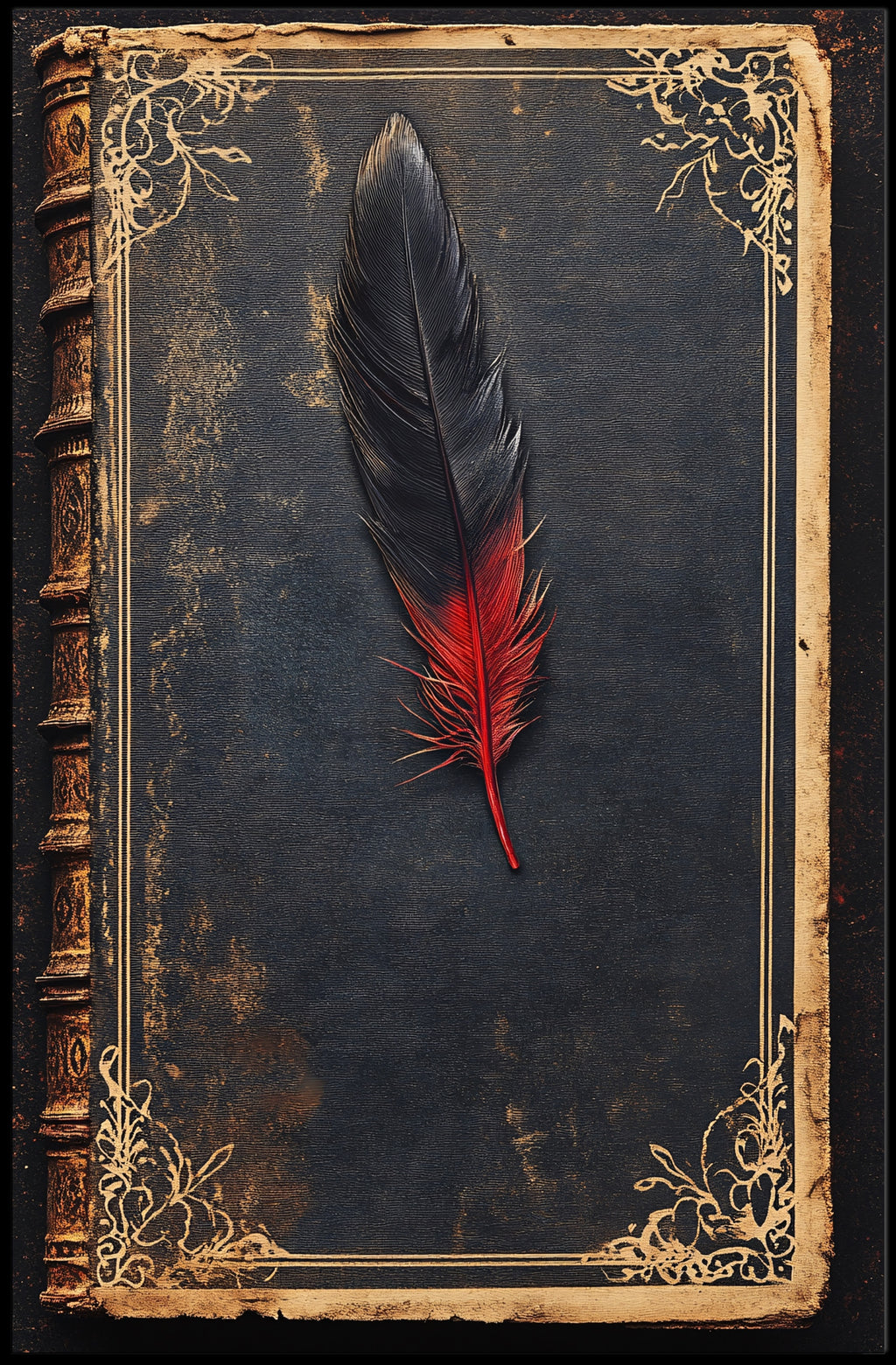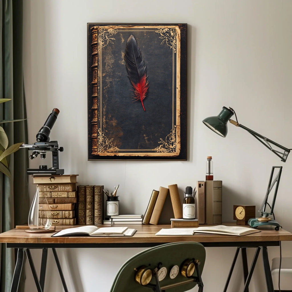 The Feathered Tome Poster from PosterGoat brings an intriguing blend of vintage storytelling and natural beauty to your walls. A single, elegantly detailed black-and-red feather rests on a textured, weathered book cover framed with ornate gold filigree—an image that evokes mystery, imagination, and a minimalist aesthetic perfect for modern interiors.