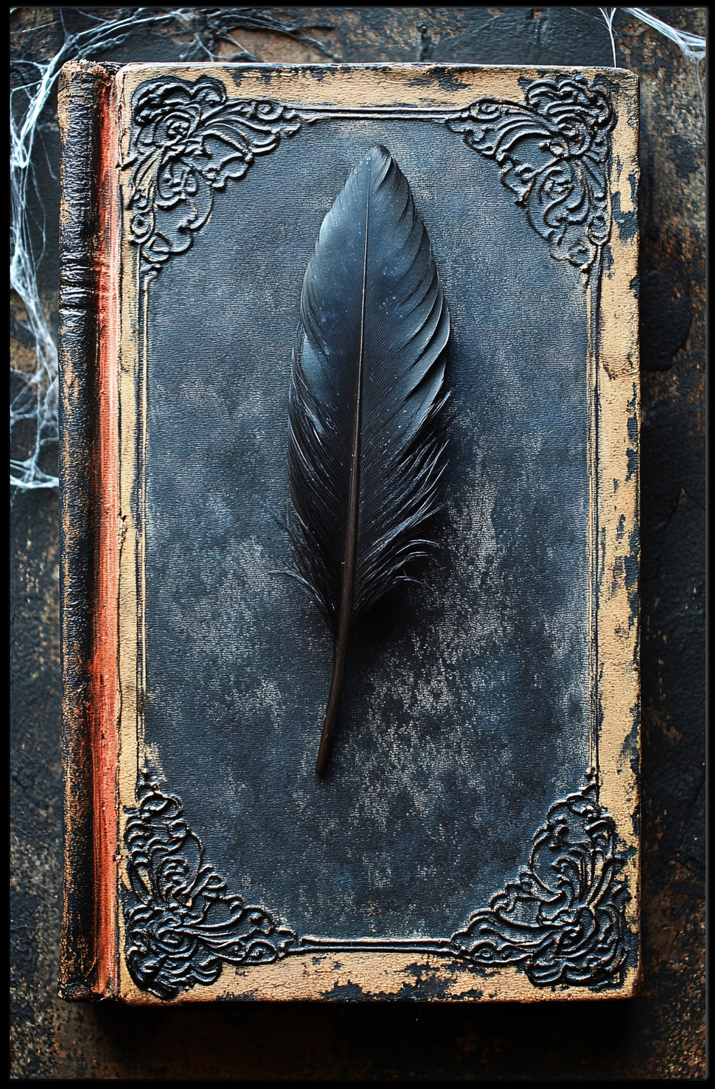 Distinctive design: High-contrast composition with a central black feather against a weathered, slate-like background and ornamental book corners for dramatic visual impact.