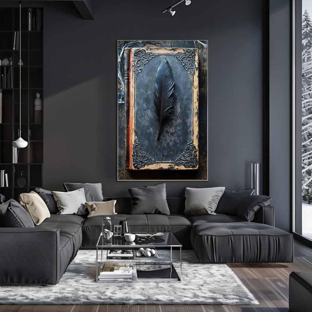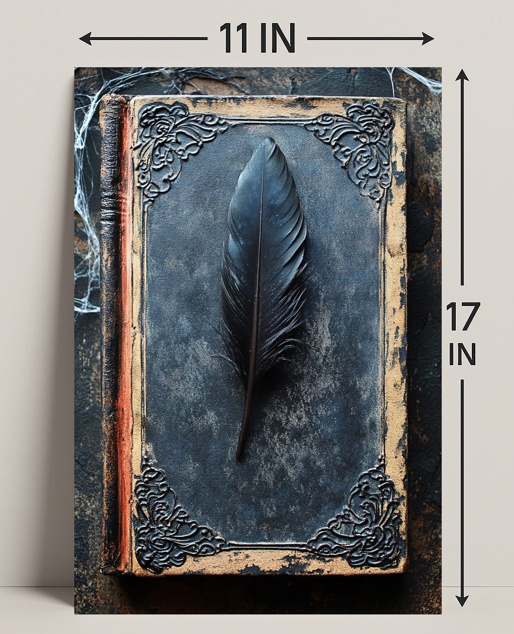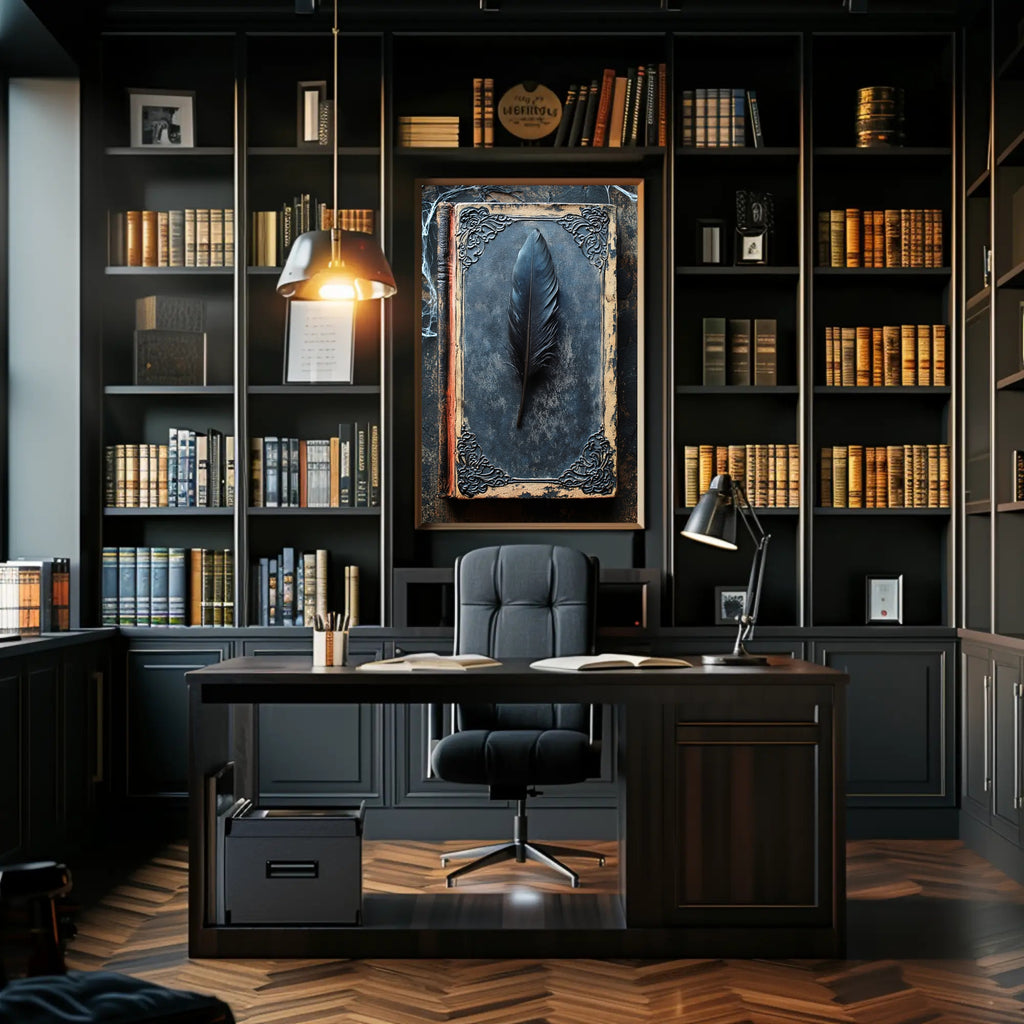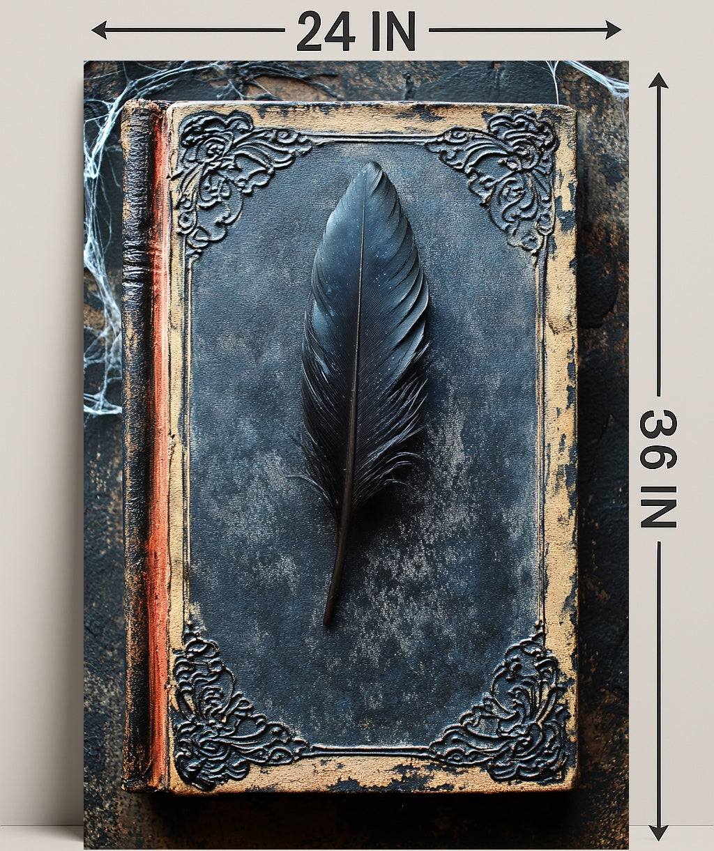 Bring a touch of mystery and timeless elegance to your walls with The Feathered Tome Poster from PosterGoat. This captivating art print features a single, glossy black feather centered on the embossed cover of an aged tome — rich textures, distressed gold edging, and ornate corner filigree combine to create a striking focal piece that works beautifully in modern, minimalist, and gothic-inspired interiors.