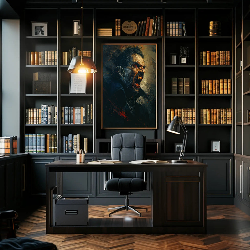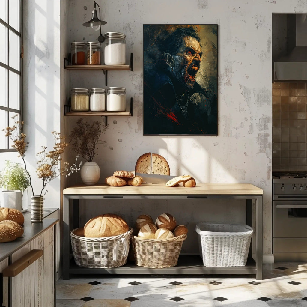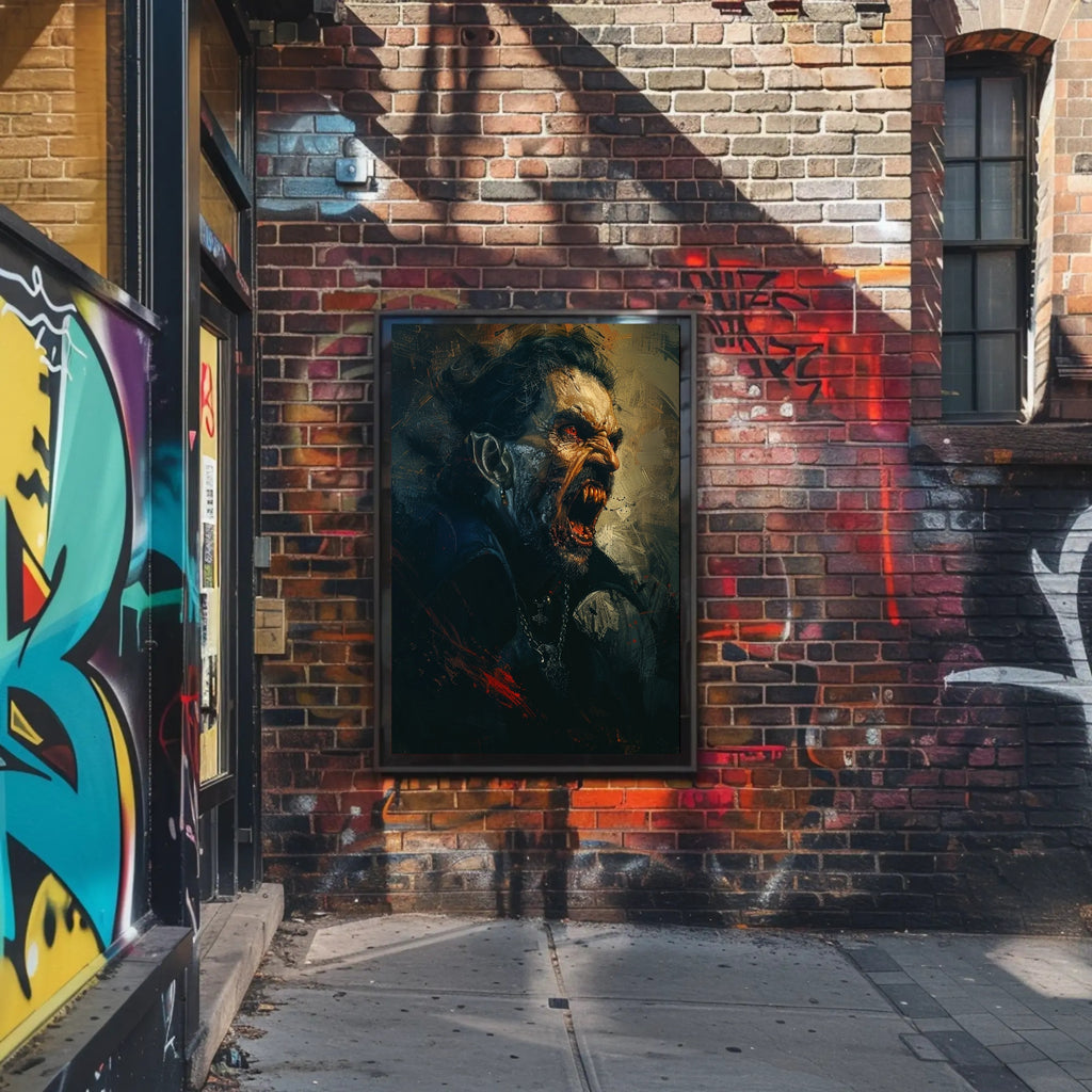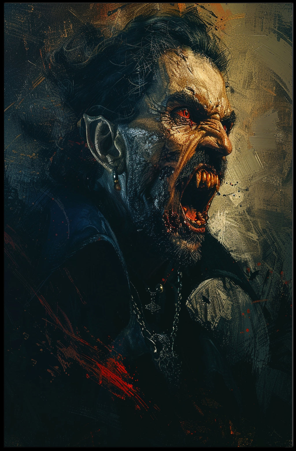 Every inch of this 18x24 poster captures dramatic detail: the razor‑sharp fangs, glowing red eyes, weathered skin, and metallic highlights on the earring and chained pendant. Brushstroke textures and splattered crimson create a gritty, scenic atmosphere that works equally well in gothic, horror, or modern eclectic décor.