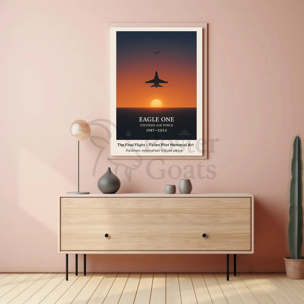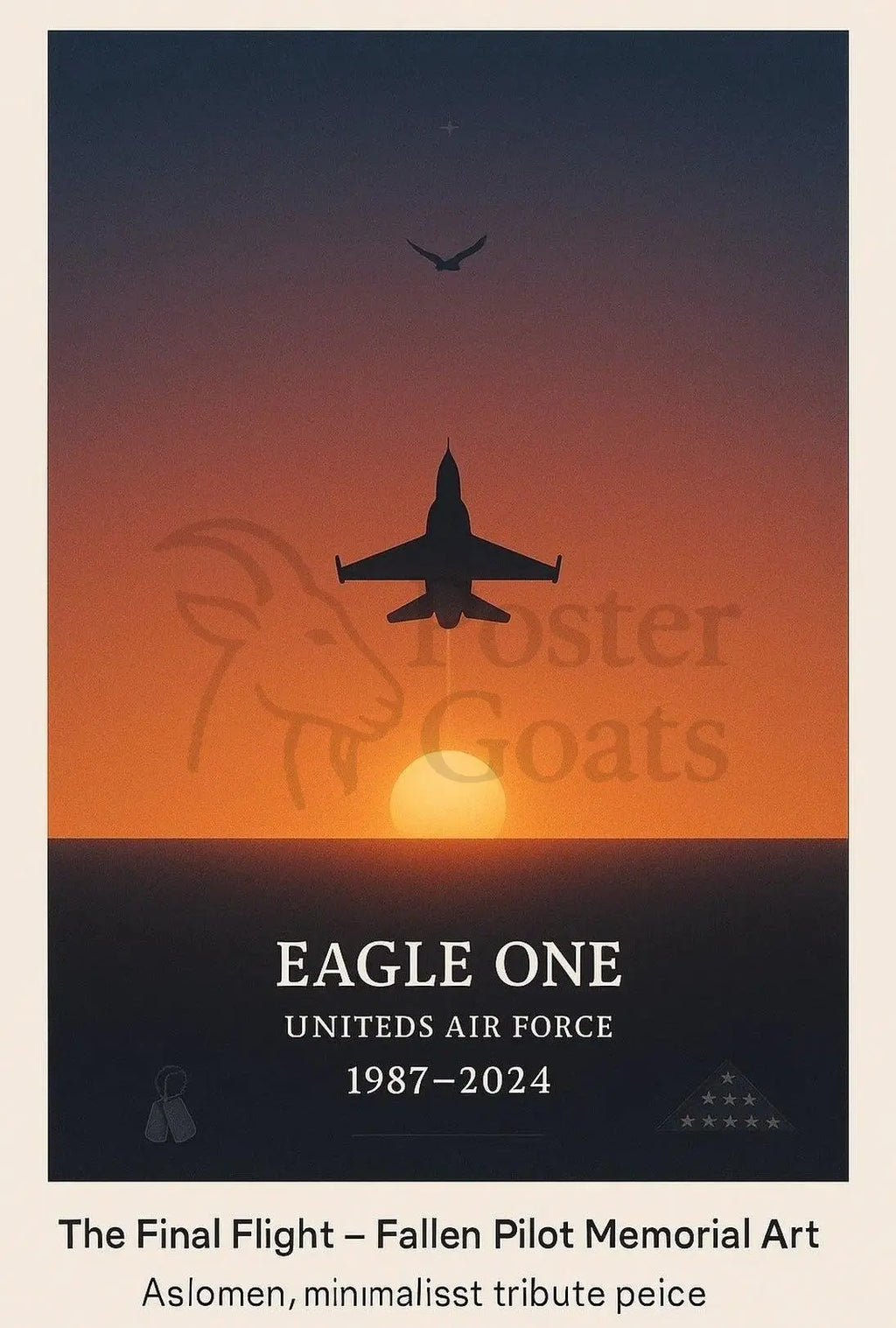 The Final Flight Memorial Military Tribute Poster from PosterGoat is a striking, minimalist memorial print that honors the sacrifice and valor of a fallen pilot with timeless dignity. A lone jet silhouette ascends into a warm, orange sunset while an eagle soars above — a powerful visual metaphor for courage, service, and final passage.