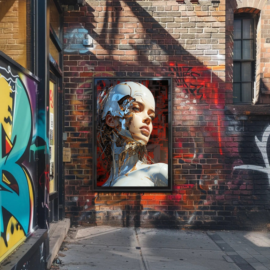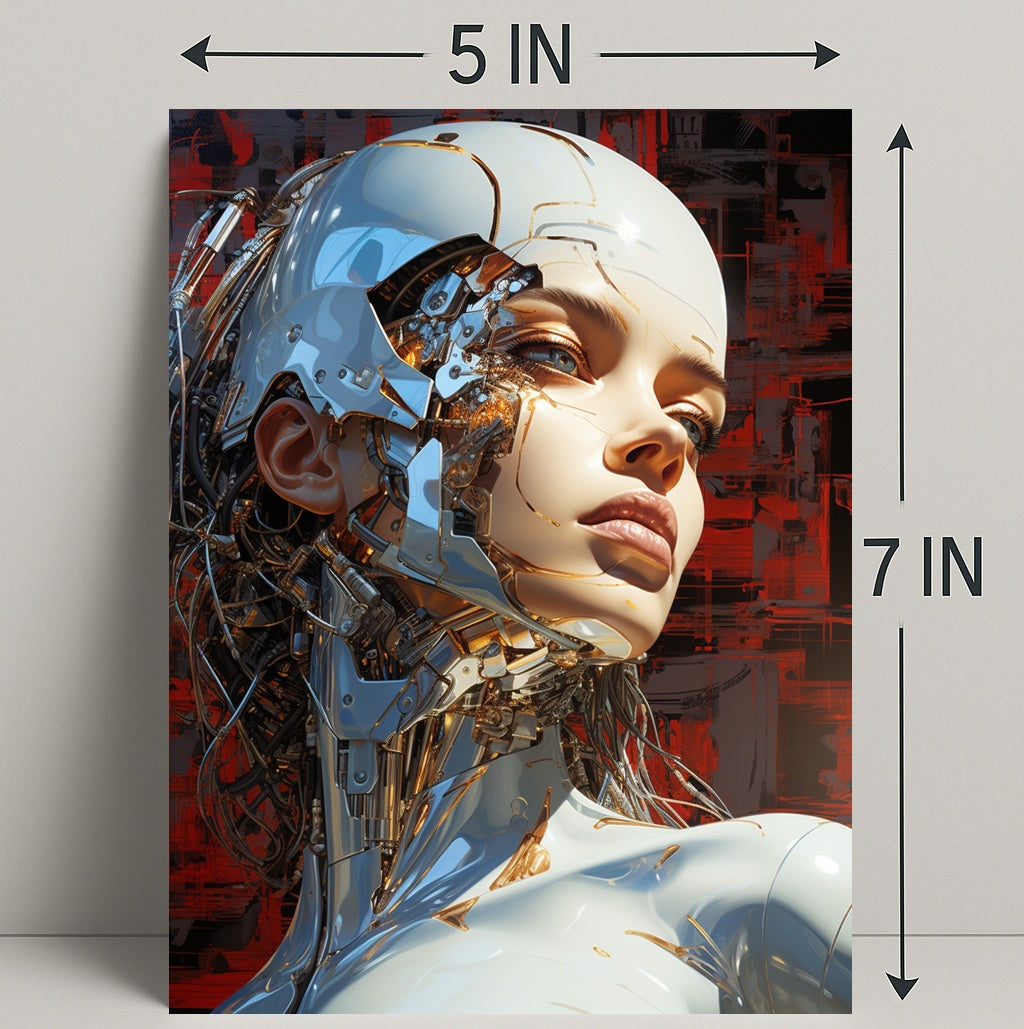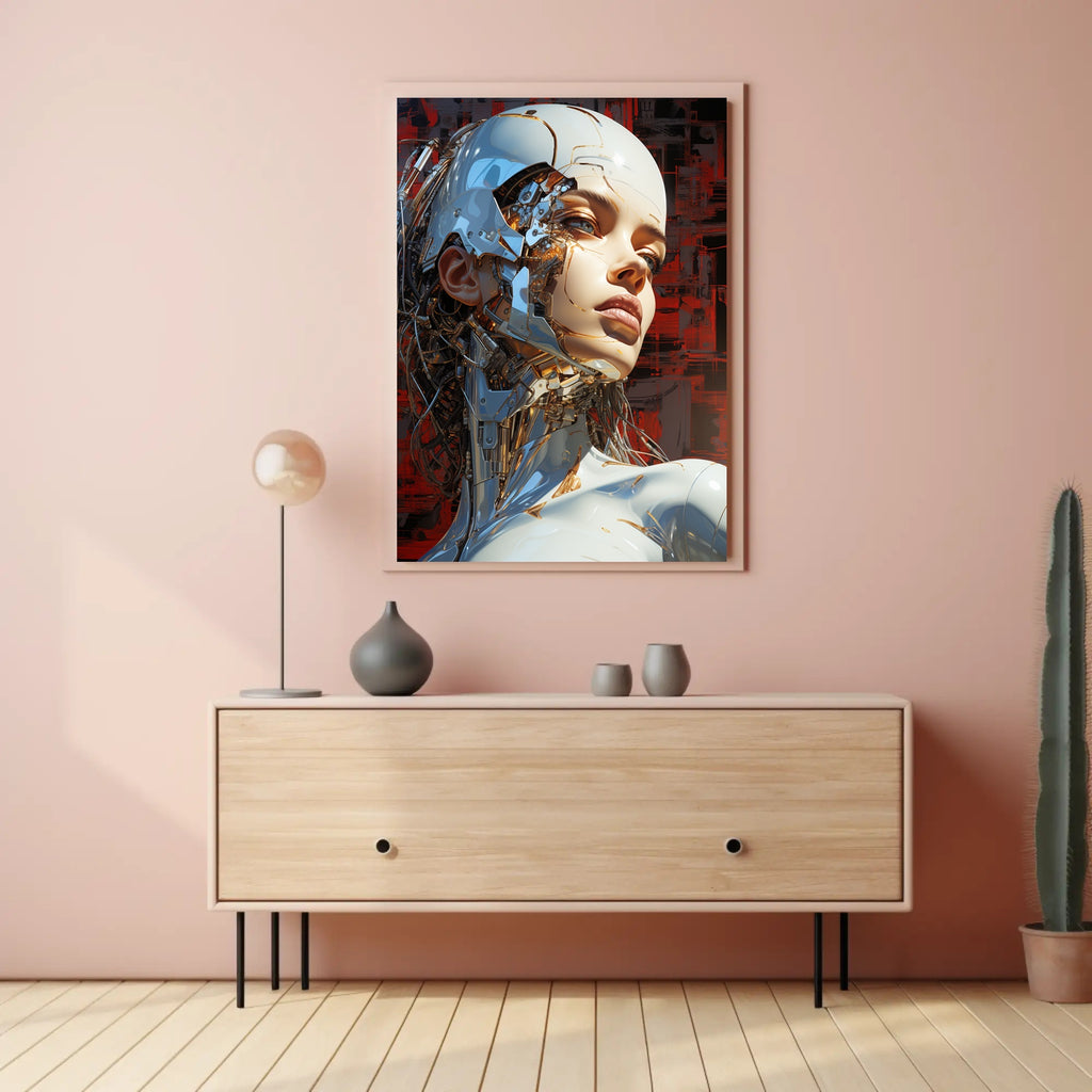 The Future Of Humanity Poster from PosterGoat is a striking fusion of human beauty and machine precision — a high-impact poster designed to ignite conversation and elevate modern interiors. Rendered in hyper-detailed, glossy finishes, this artwork captures a futuristic, near-human figure with exposed mechanical components, reflective chrome plating, and delicate golden highlights against a bold red abstract backdrop.