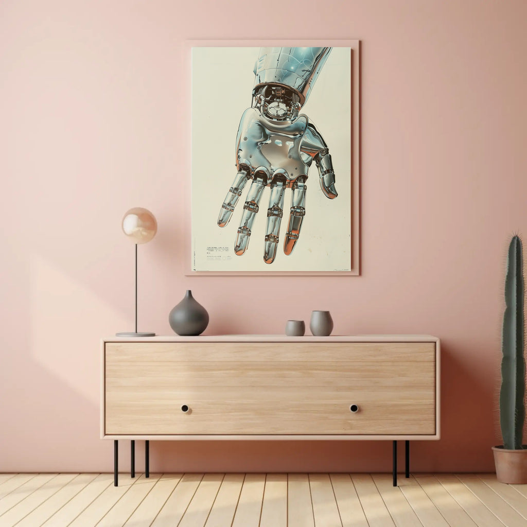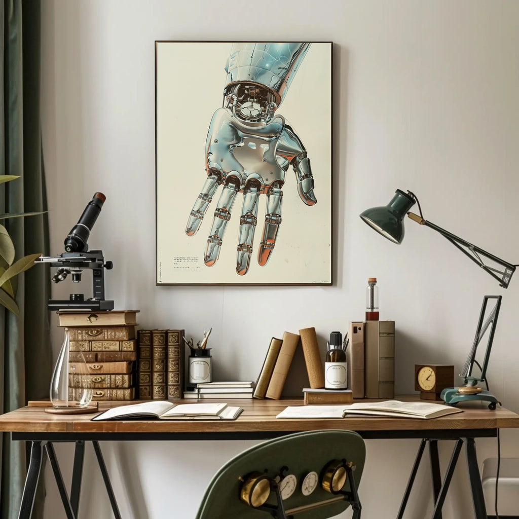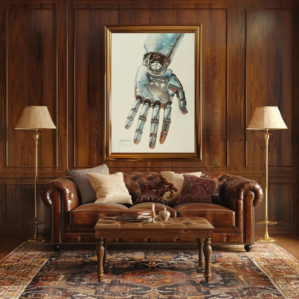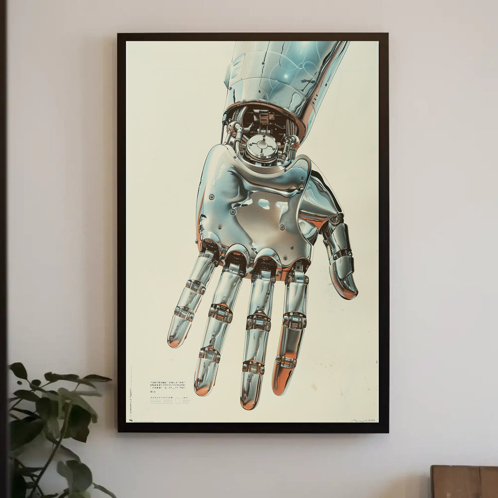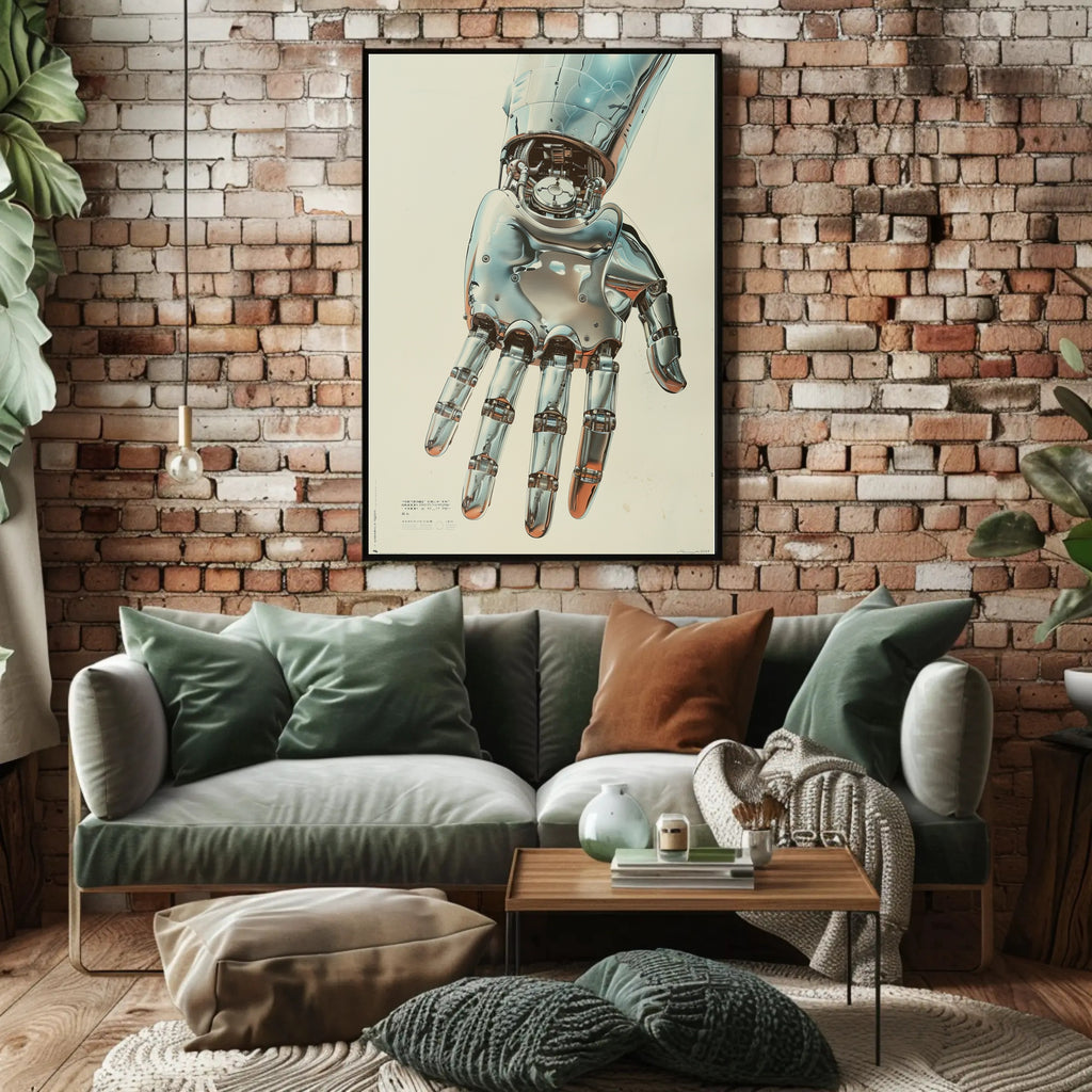 Introduce a striking focal point to your home with The Futuristic Hand Art Poster from PosterGoat — a high-impact, minimalist art print that merges technical precision with contemporary style. The chrome-like robotic hand, rendered in exquisite detail against a clean, neutral backdrop, creates a modern visual statement perfect for living rooms, offices, or creative studios.