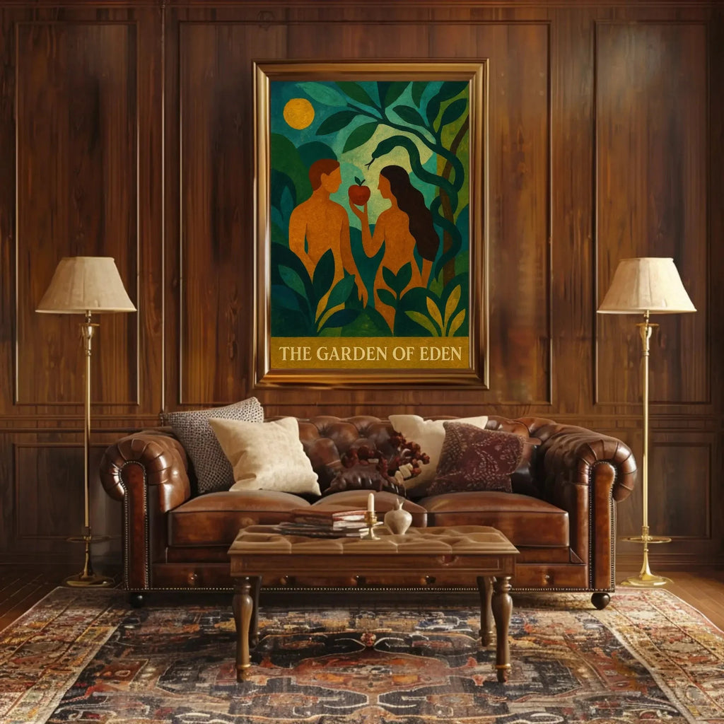 Graphic border and title: Classic lettering—"THE GARDEN OF EDEN"—anchors the artwork and gives it a vintage poster feel perfect for feature walls.