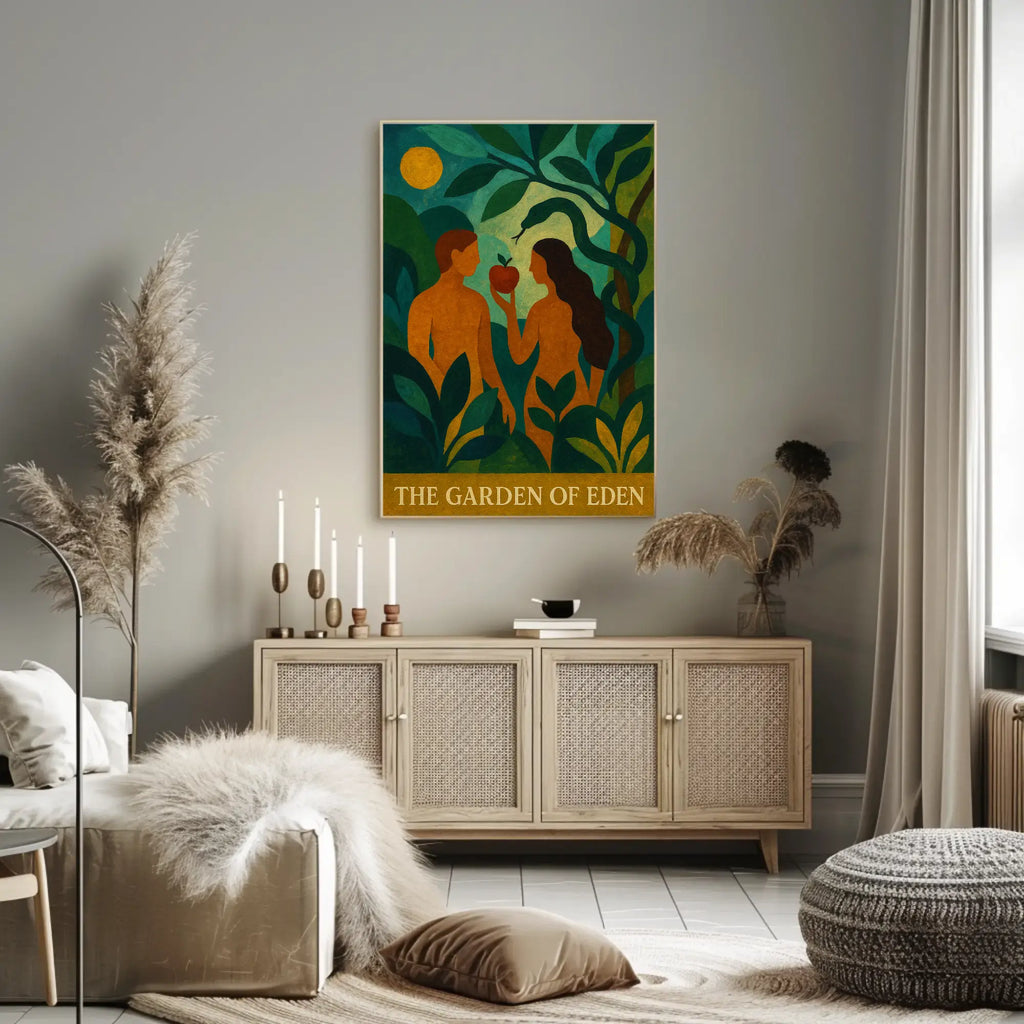 - Graphic border and title: Classic lettering—"THE GARDEN OF EDEN"—anchors the artwork and gives it a vintage poster feel perfect for feature walls.