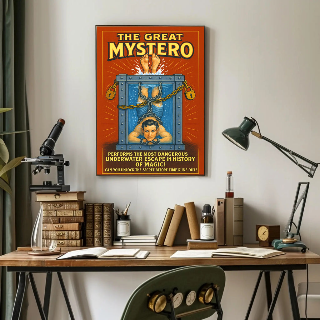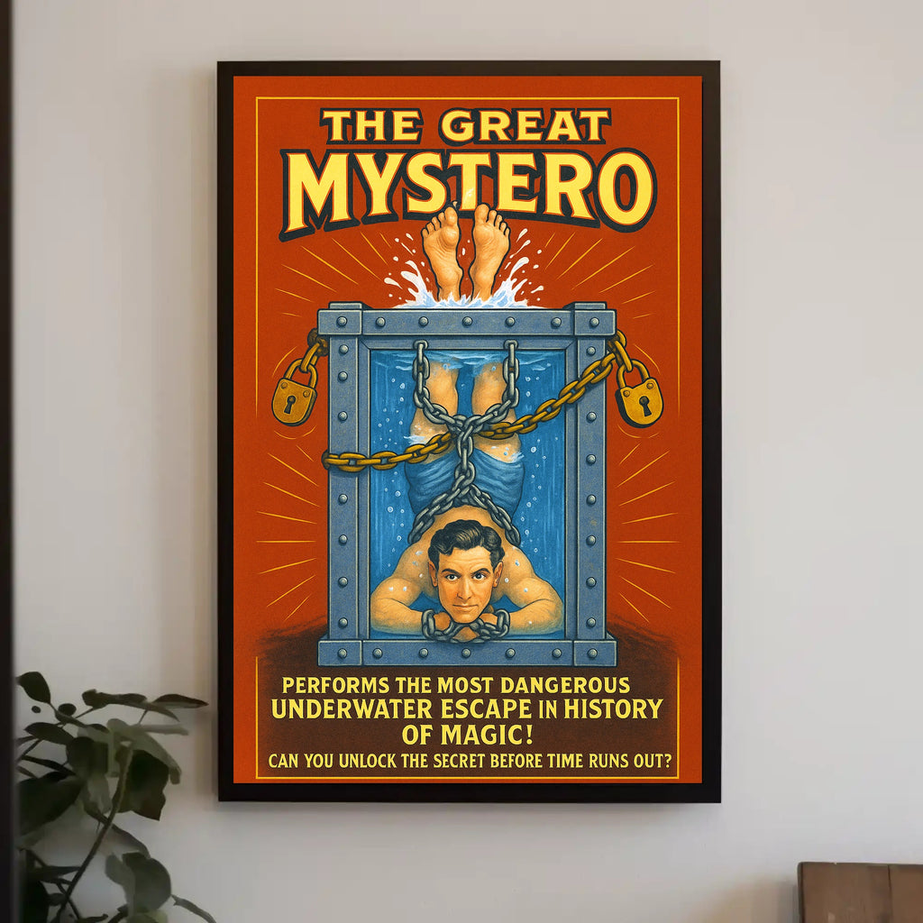 Bring mystery and vintage showmanship to your walls with The Great Mystero Underwater Escape Poster — a PosterGoat favorite for bold, story-driven decor. Order now to transform your space with a timeless piece of poster art.