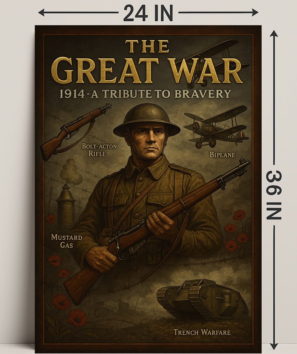 This striking artwork features a resolute soldier at its center, clutching a bolt-action rifle framed by barbed wire, drifting poppy blooms and the silhouettes of a biplane and early tank — all rendered in a warm, antique palette and finished with bold, gold-embossed lettering that reads “THE GREAT WAR — 1914: A TRIBUTE TO BRAVERY.” The composition balances historical accuracy with a minimalist, museum-quality aesthetic that complements modern interiors.