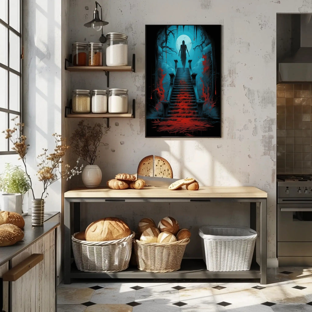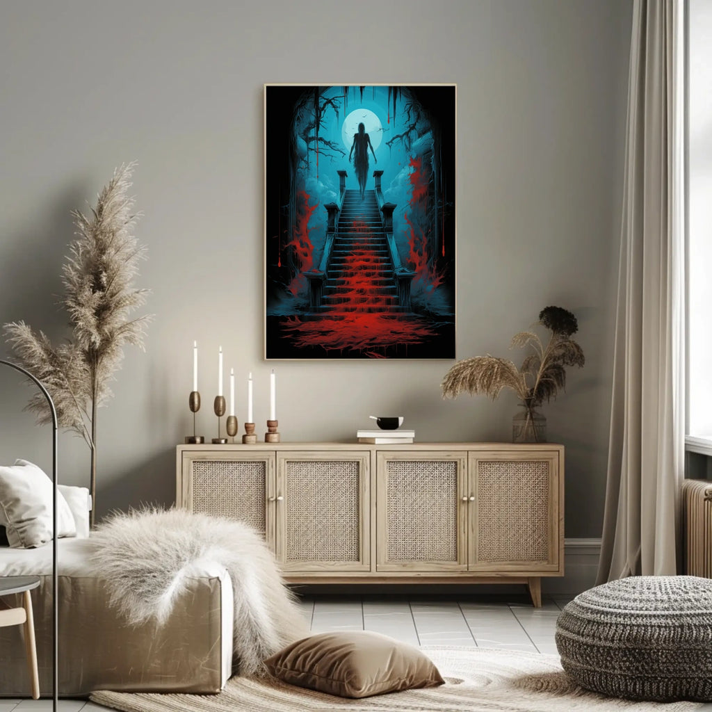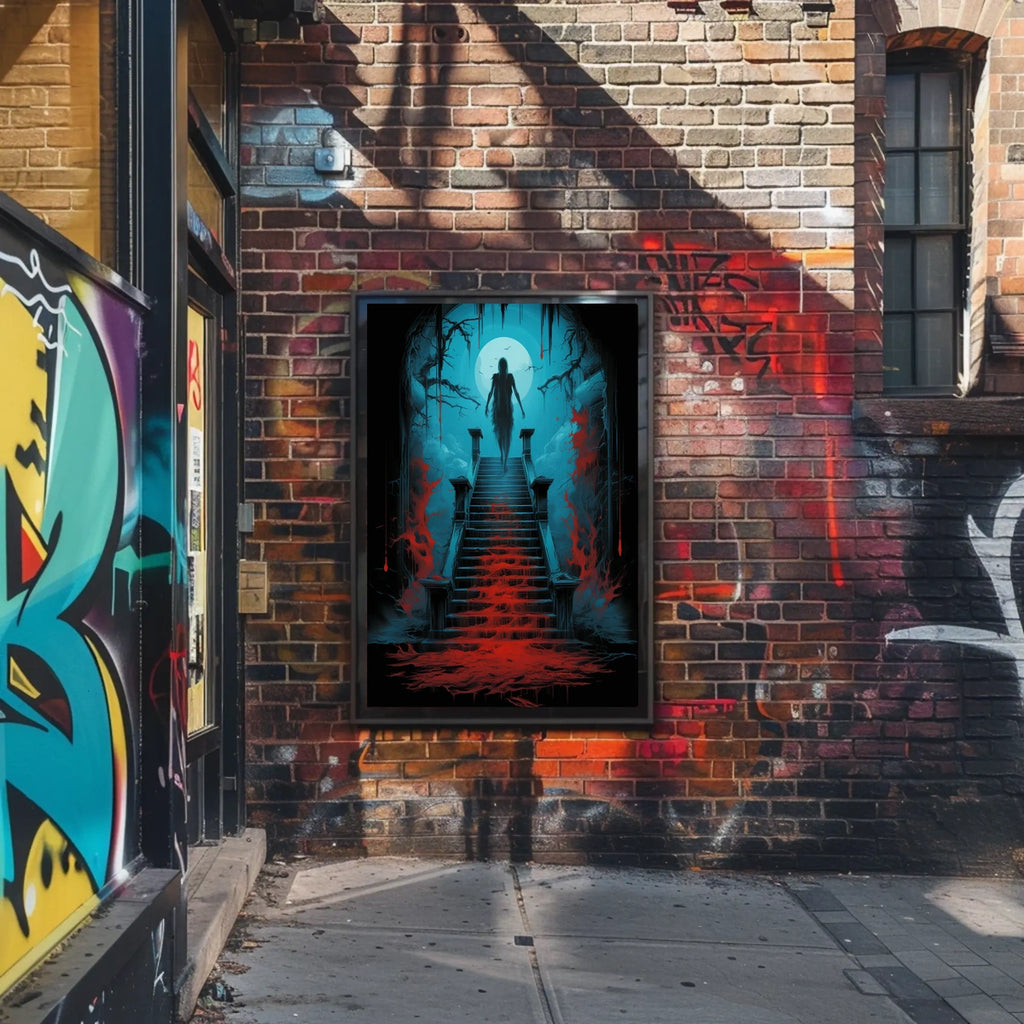 In the eerie glow of the full moon, The Haunting Ascent draws you into a chilling tableau: a shadowy figure climbs a crimson staircase, haunted by twisted trees and ominous clouds. This gothic artwork blends mystery and suspense, turning any wall into a narrative you can feel.