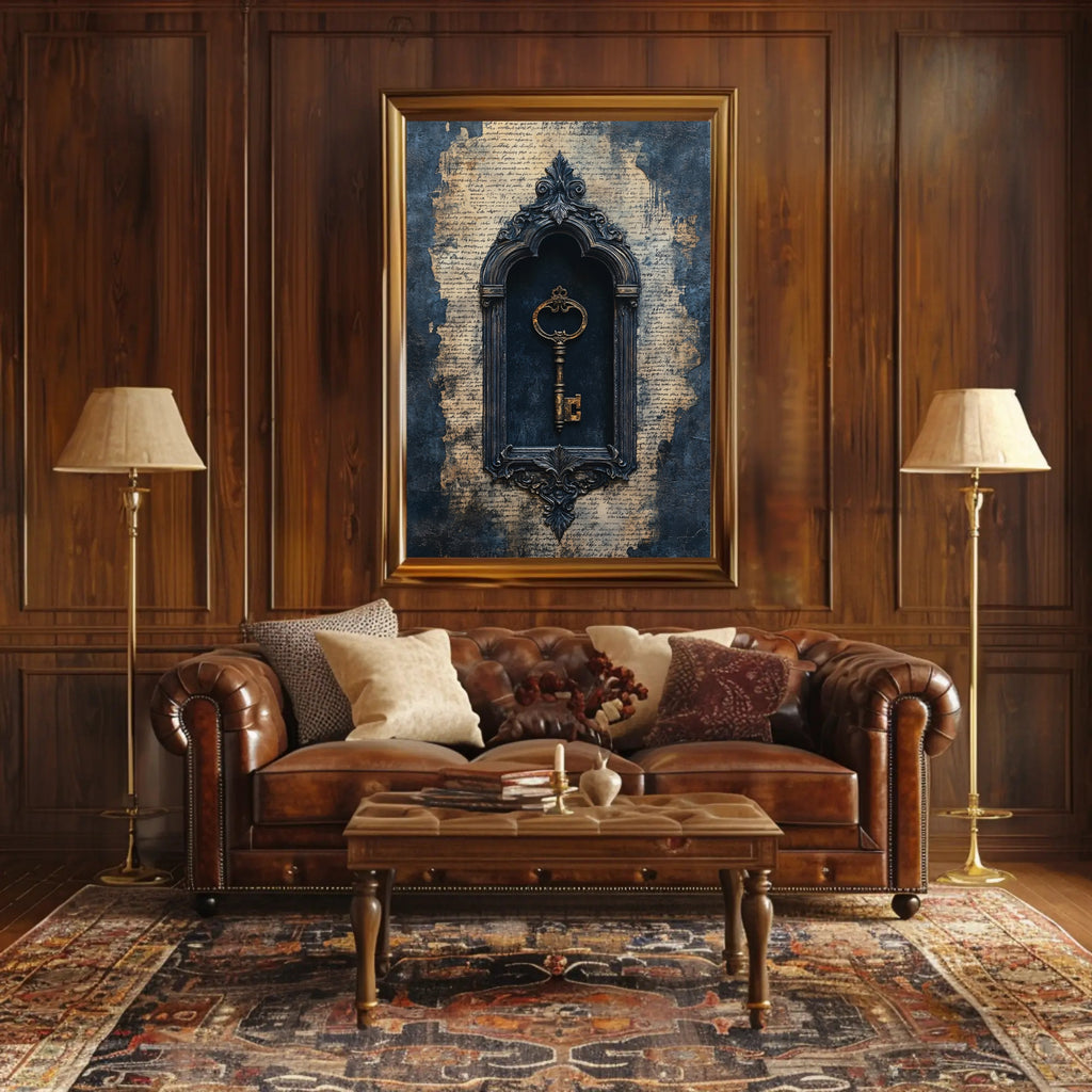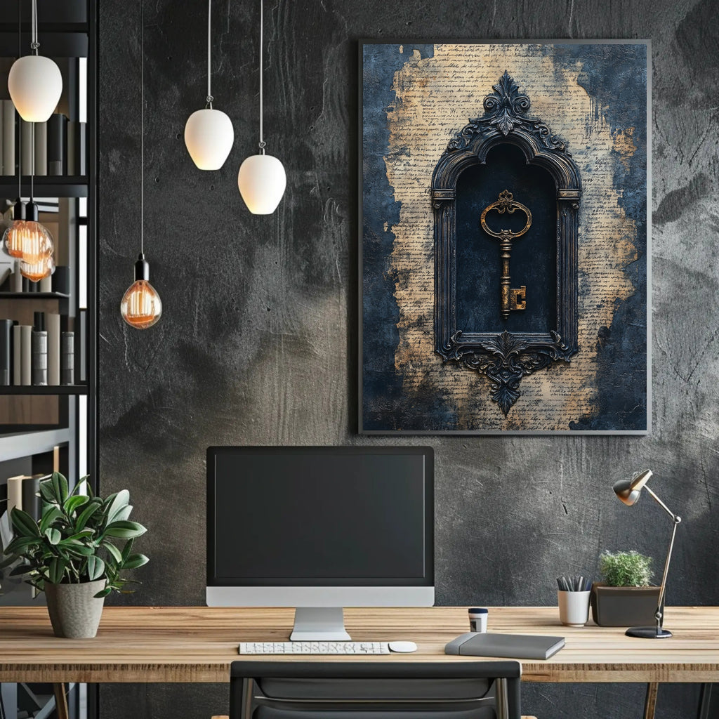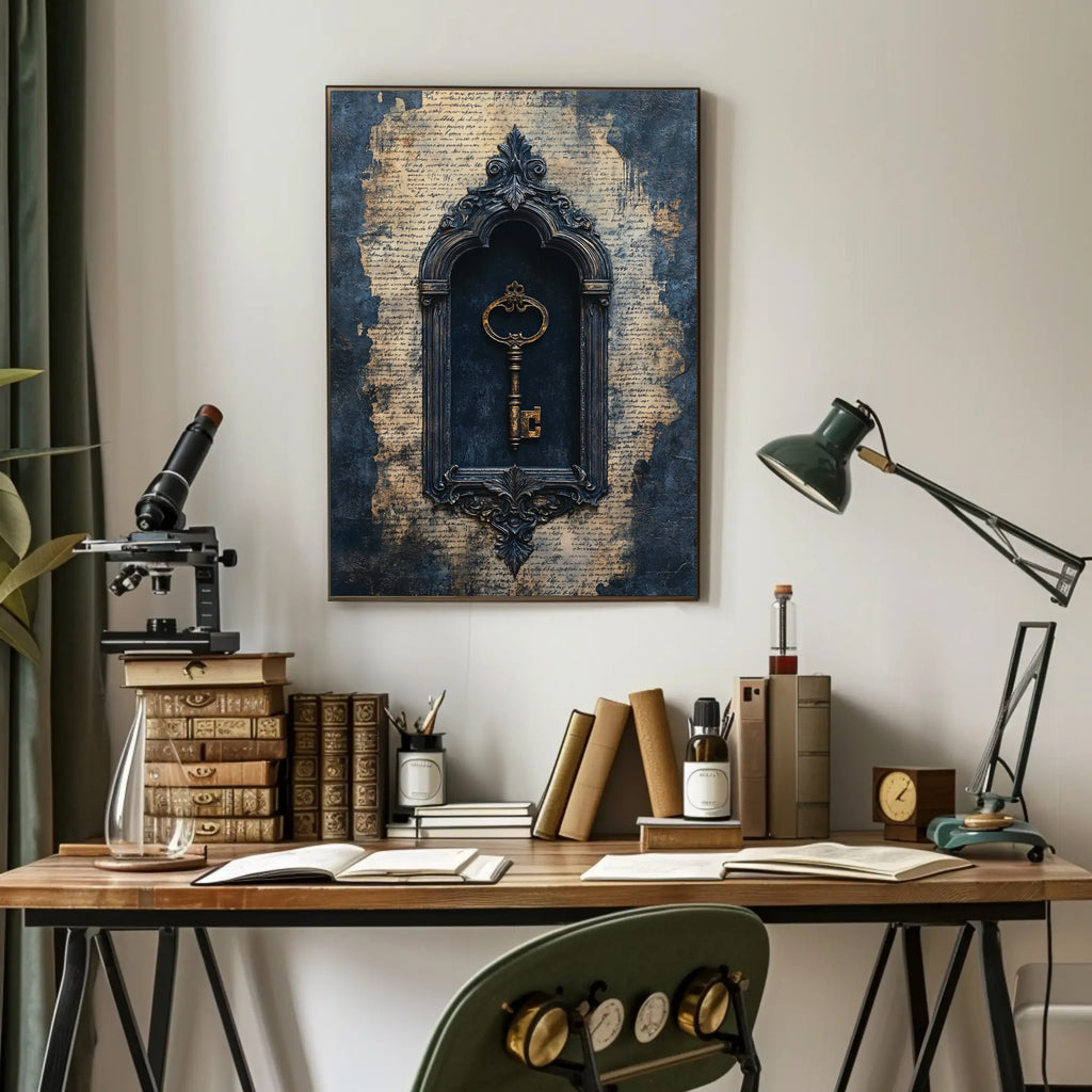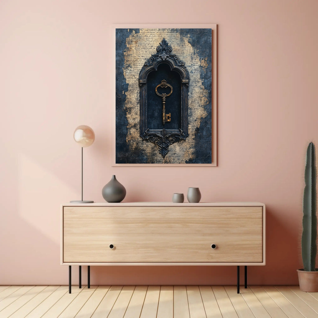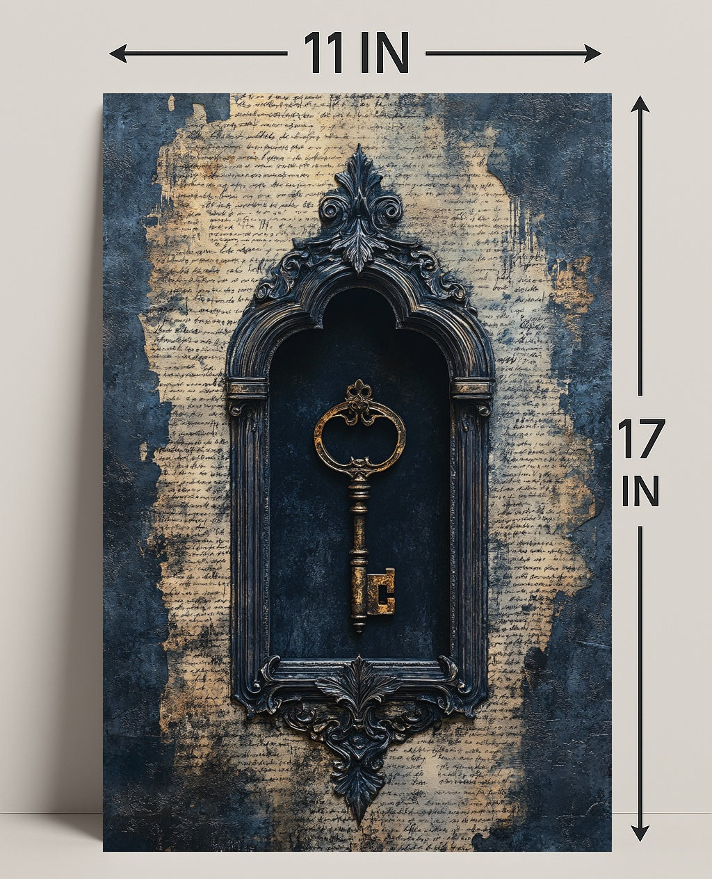 The Key To History Poster from PosterGoat transforms any wall into a story — an antique brass key suspended within an ornate, carved niche set against a distressed parchment of handwritten script. Rich navy textures, aged gold highlights and meticulous detailing create a dramatic focal point that blends minimalist composition with vintage character.