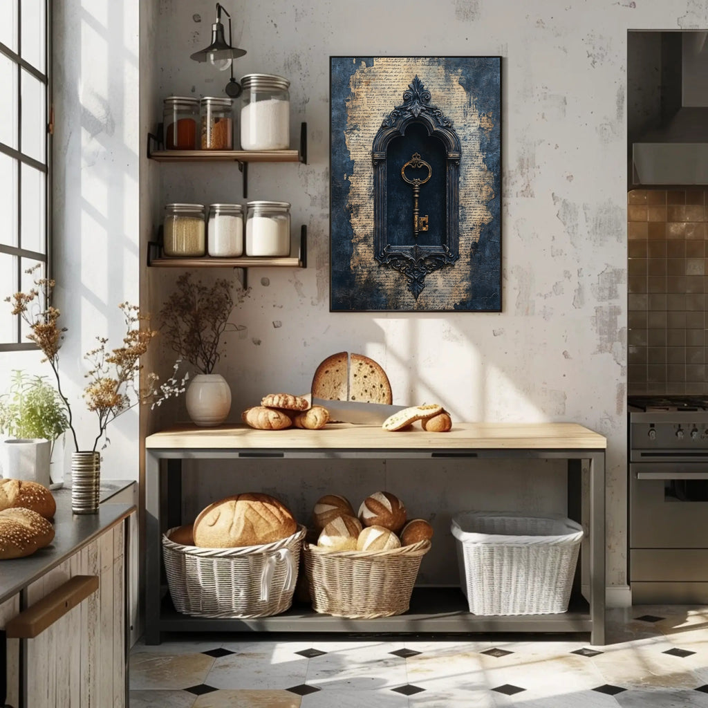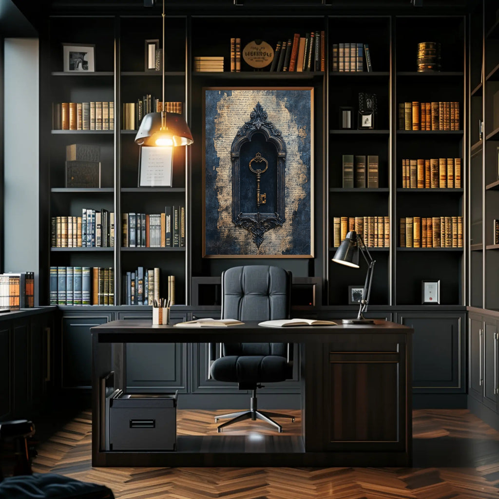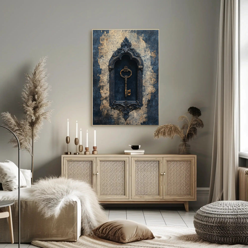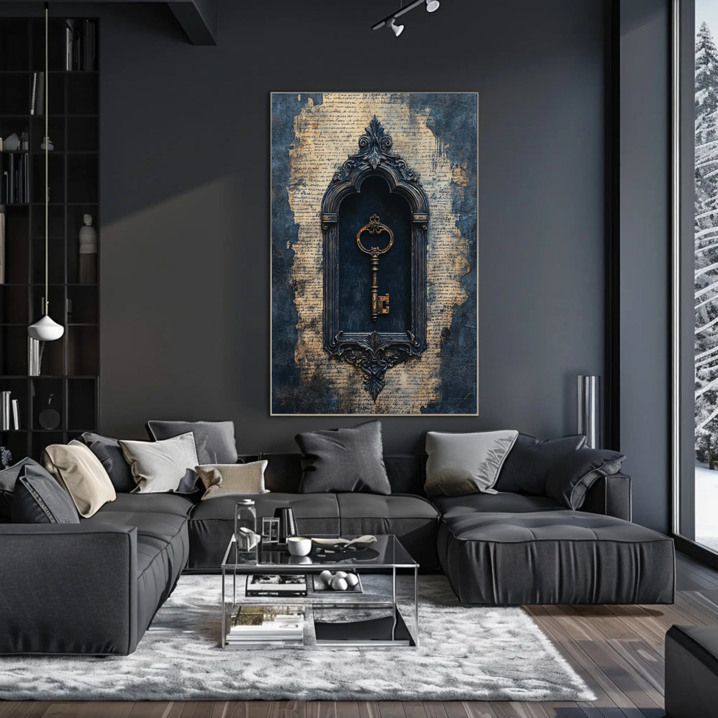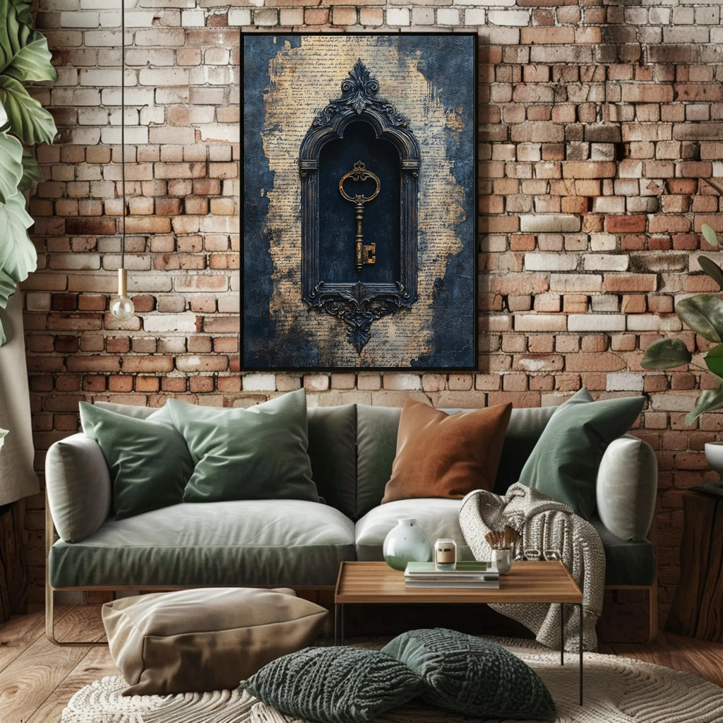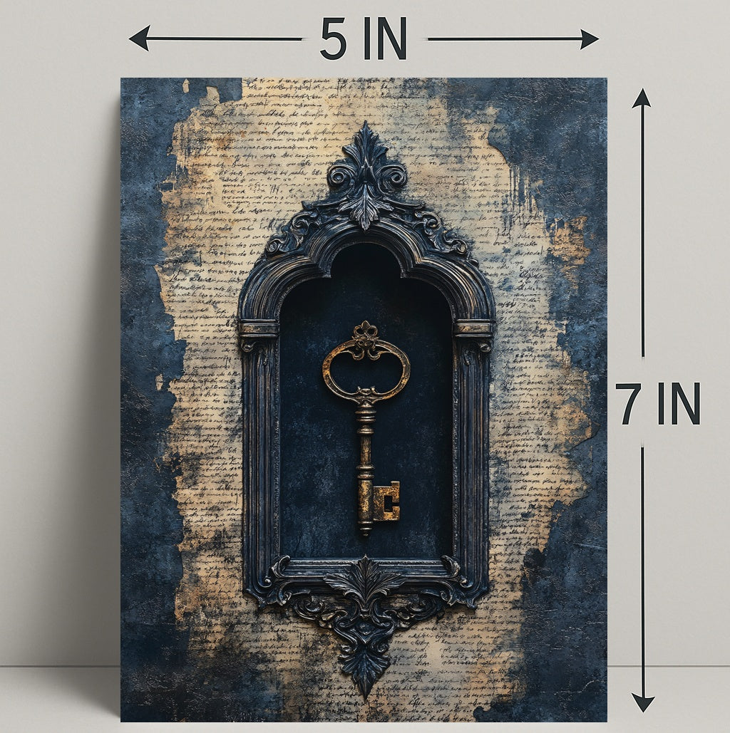 The Key To History Poster from PosterGoat transforms any wall into a story — an antique brass key suspended within an ornate, carved niche set against a distressed parchment of handwritten script. Rich navy textures, aged gold highlights and meticulous detailing create a dramatic focal point that blends minimalist composition with vintage character.