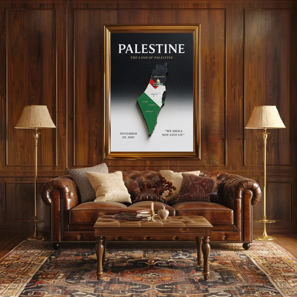 The Land of Palestine Poster from PosterGoat is a striking, minimalist art print that brings historic resonance and refined decor to any home. Centered on a textured, three-dimensional map silhouette, this poster highlights key cities like Jerusalem, Hebron, Gaza and Nablus with an elegant palette inspired by real-world scenery and the Palestinian flag. A delicate illustration of the Dome of the Rock and the printed date "November 29, 1947" pair with the inspirational quote, "We shall not give up.", for a piece that is both decorative and meaningful.
