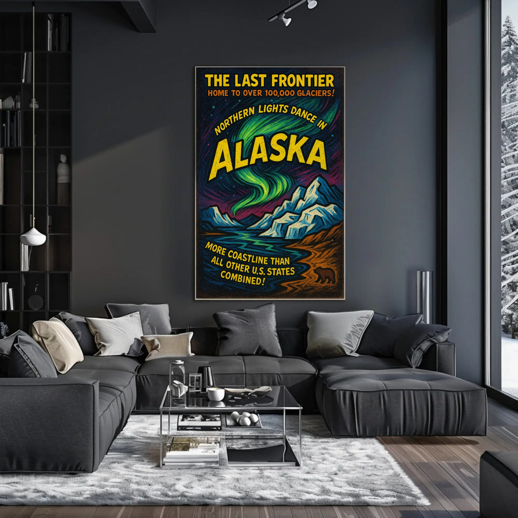 Immerse your space in the wild spirit of Alaska with the PosterGoat "The Last Frontier Alaska Poster" — a vintage-inspired art print that celebrates northern lights, towering glaciers, and rugged coastline in a bold, travel-poster style.