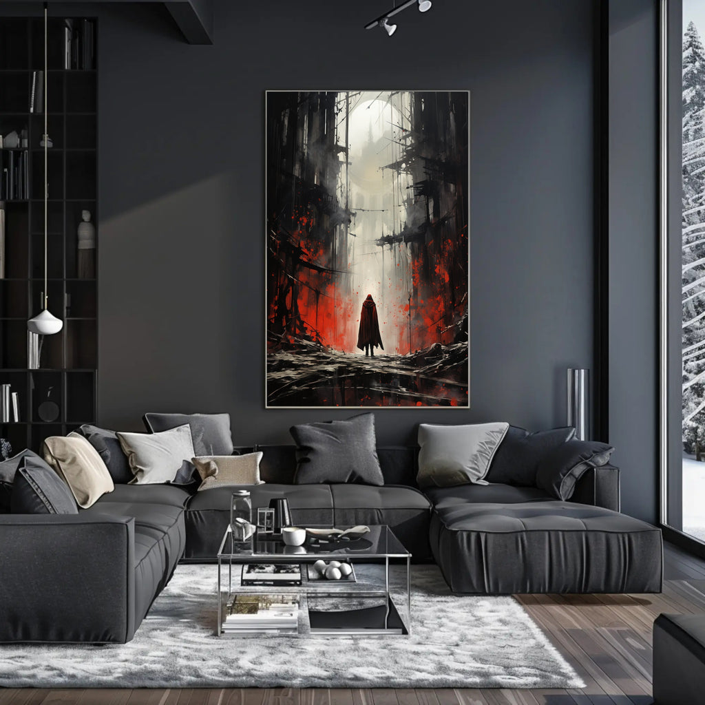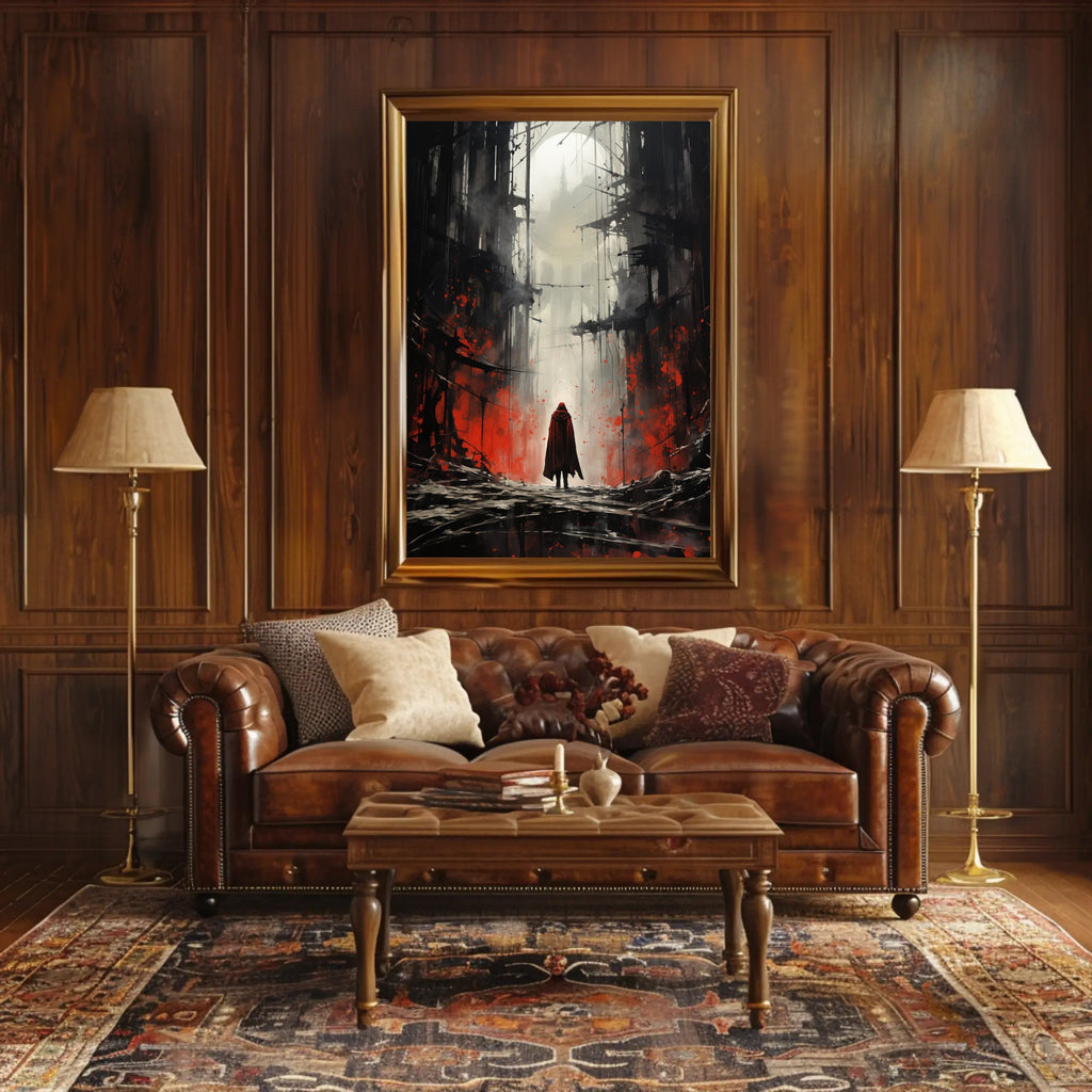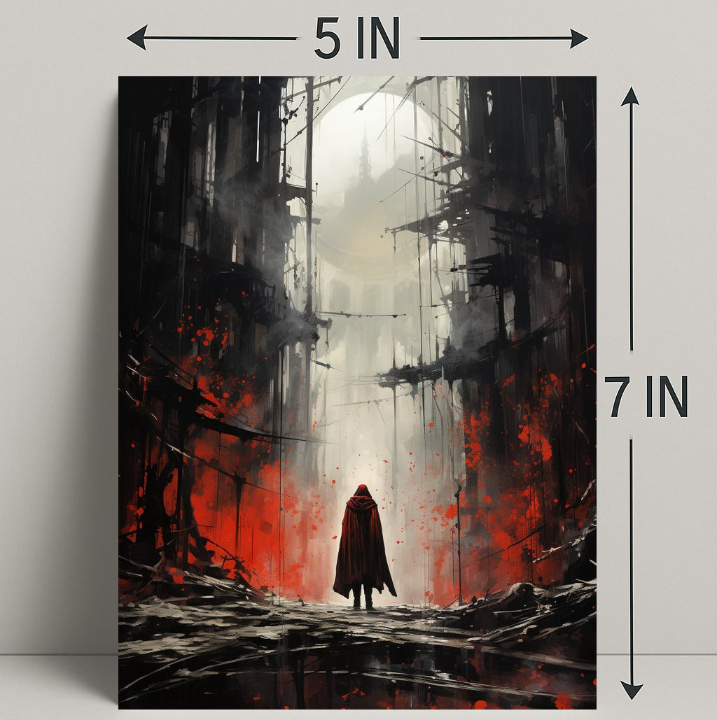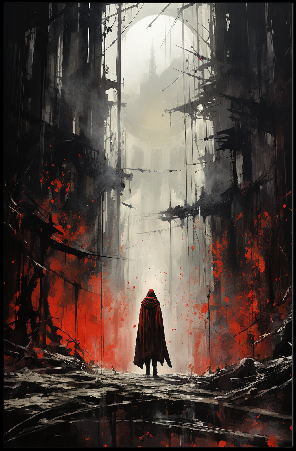Bring a story of solitude and discovery to your walls with The Lone Wanderer Poster from PosterGoat. This striking poster captures a single cloaked figure standing against a towering, ruined cityscape — a dramatic vertical composition that draws the eye upward into misty arches and shadowed spires. Bold splashes of red contrast with deep charcoal and soft light, creating an evocative focal piece for any room.