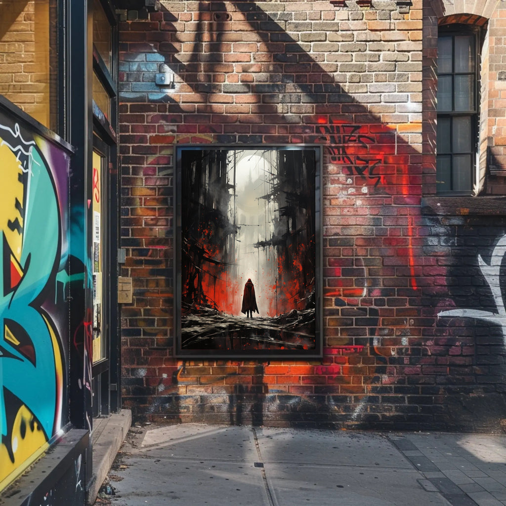 Designed for fans of scenic, minimalist artwork and travel-inspired decor, this print blends fine-art atmosphere with modern poster aesthetics. The lone silhouette evokes wanderlust and mystery, while the textured brushwork and splattered red accents add cinematic depth and movement to living rooms, offices, or hallways.