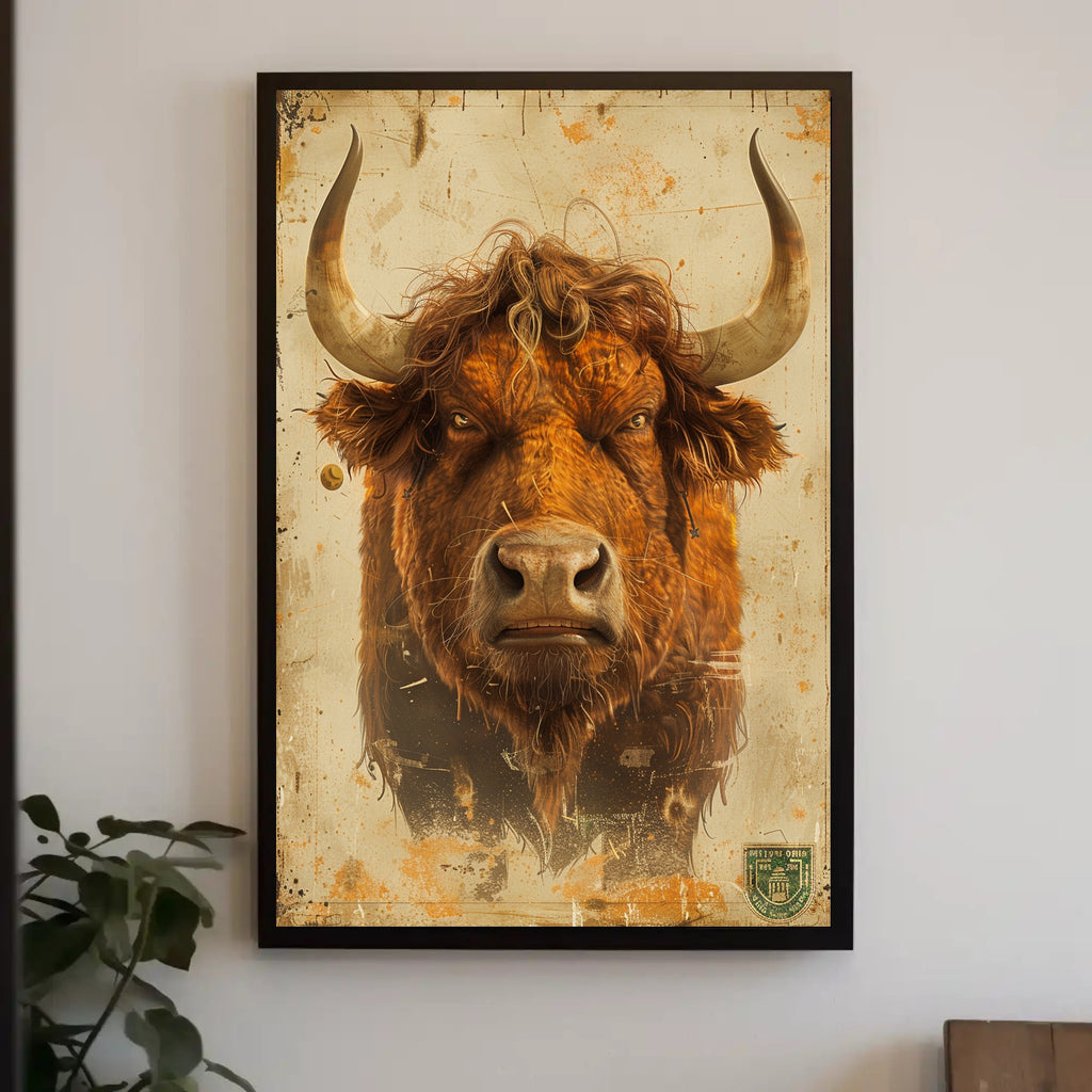 The Majestic Bull Poster from PosterGoat brings commanding wildlife energy and rustic charm to any room. This striking 18x24 poster features an up-close, hyper-detailed illustration of a bull’s face — warm, earthy tones and lifelike fur contrasted against a grungy, textured background for a vintage-meets-modern look.