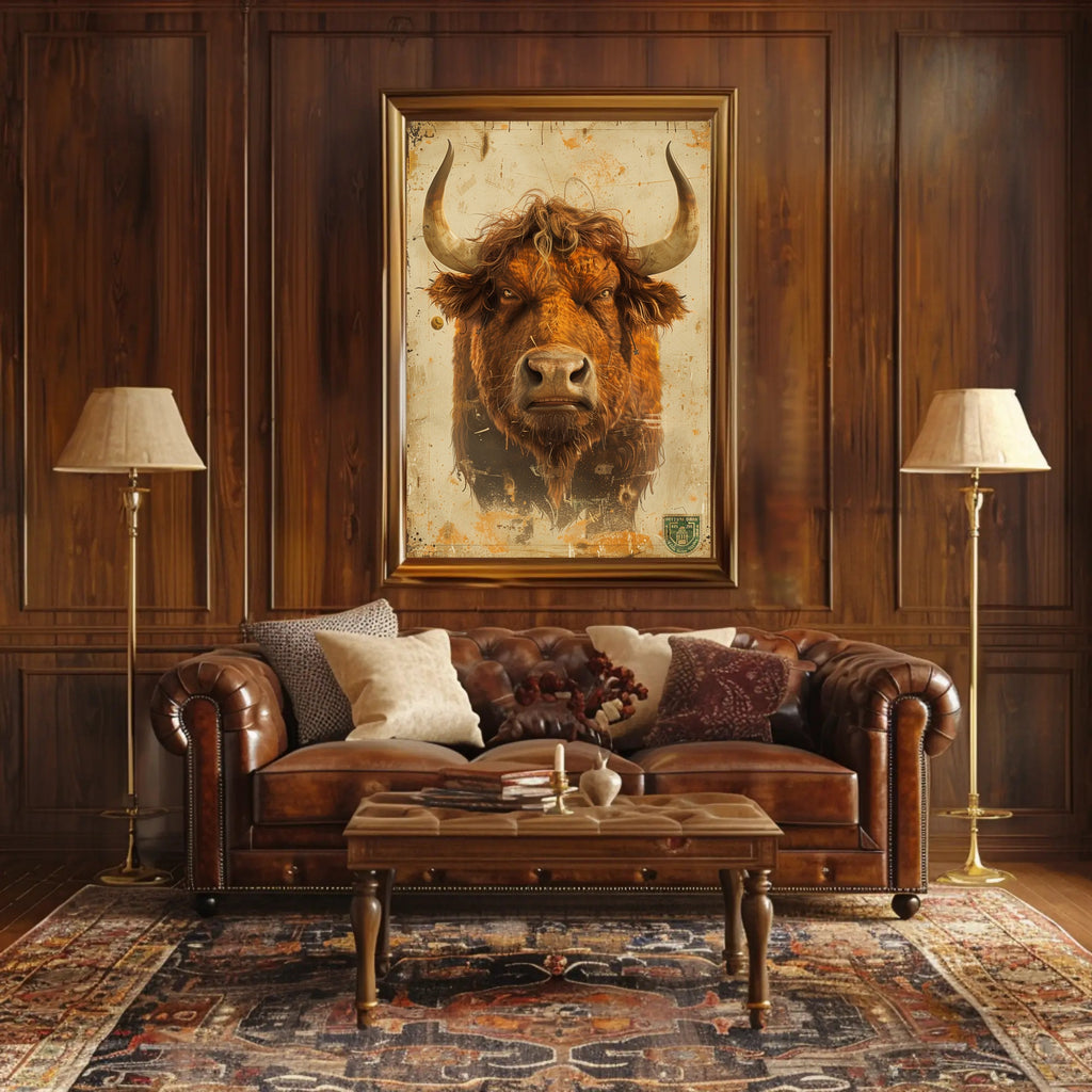 Impressive visual impact: A close-up composition emphasizes the bull’s intense gaze, sculpted horns, and finely rendered whiskers — designed to command attention on any wall.