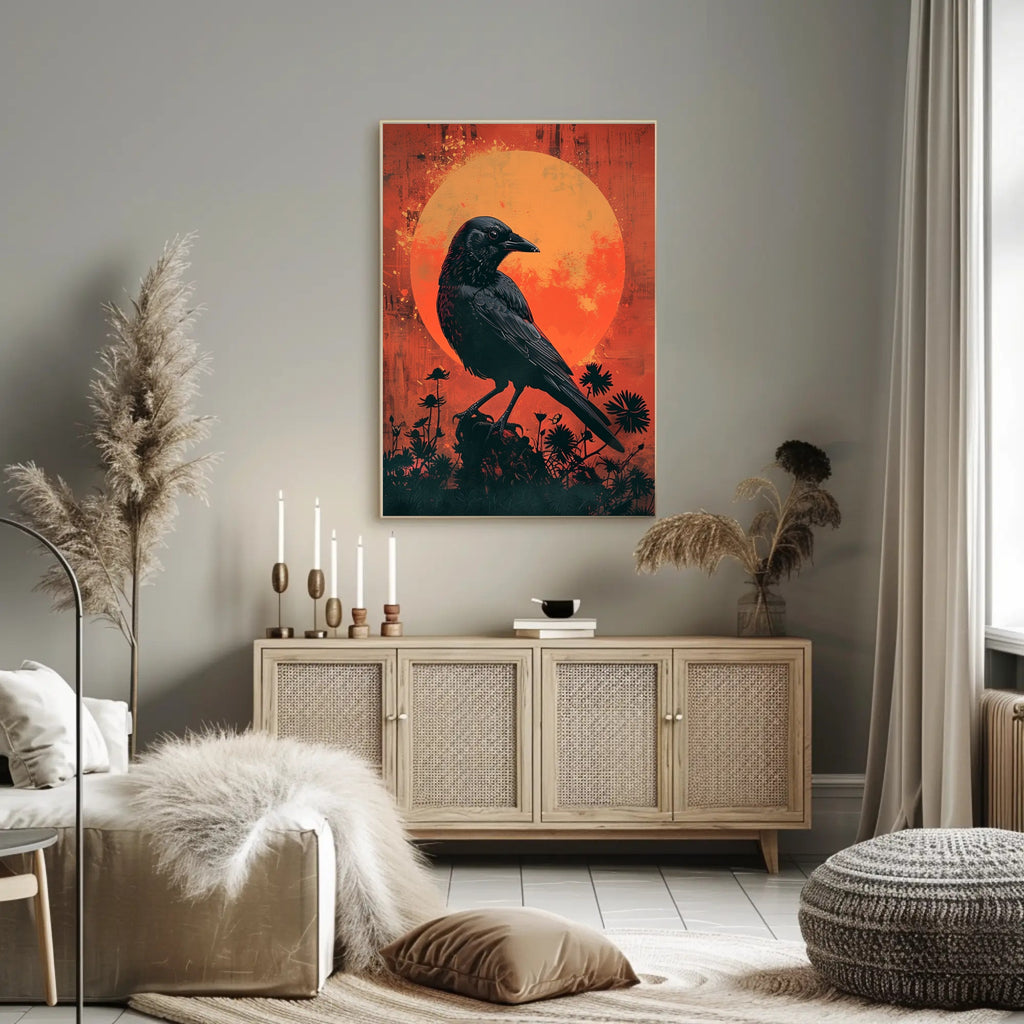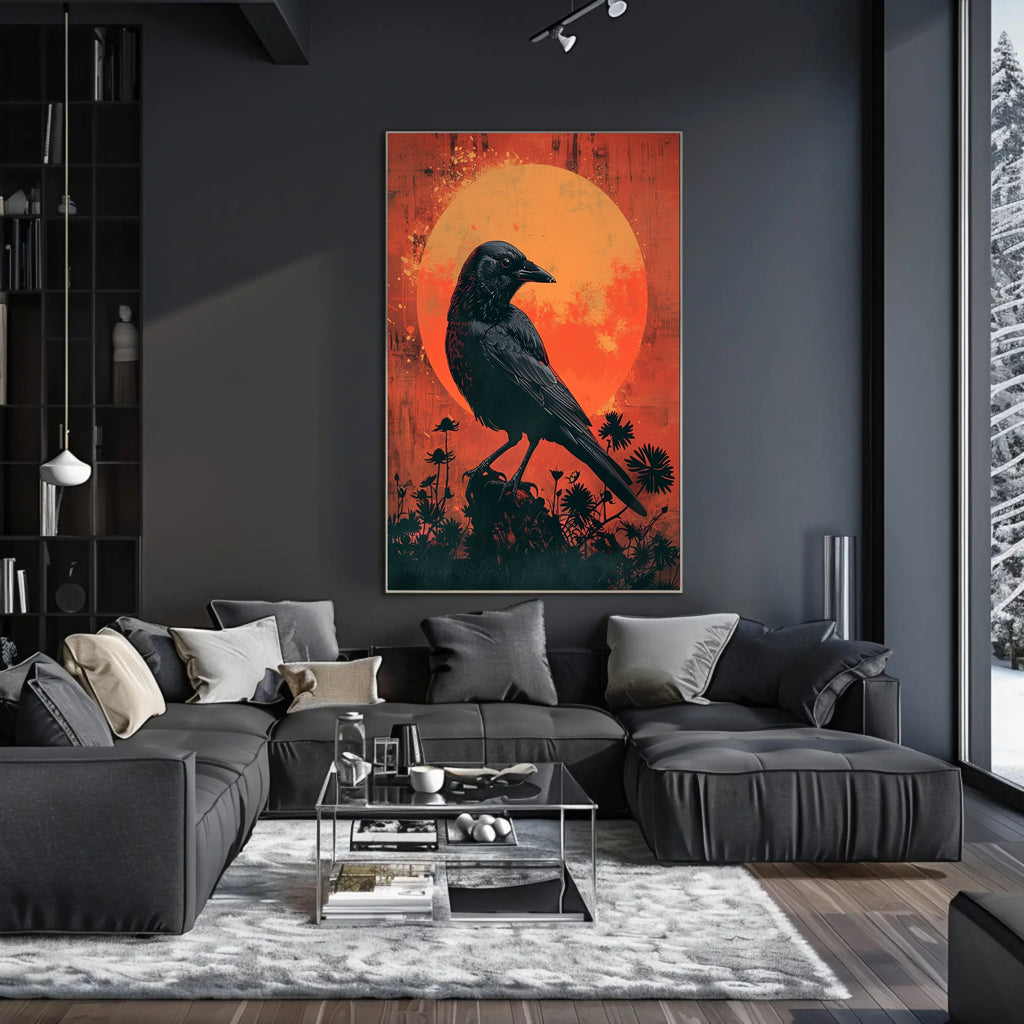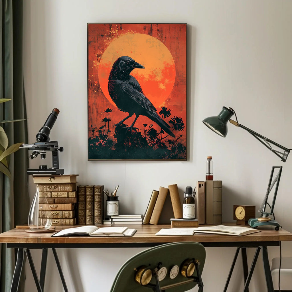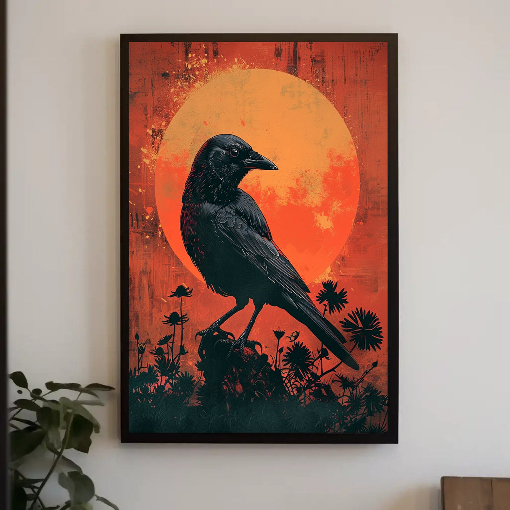The Majestic Crow Art Print Poster from PosterGoat brings a bold, nature-inspired statement piece to your home decor. This portrait-oriented art print pairs a finely detailed crow illustration with a glowing orange sun backdrop and silhouetted wildflowers, creating a dramatic focal point for living rooms, bedrooms, offices, or gallery walls.