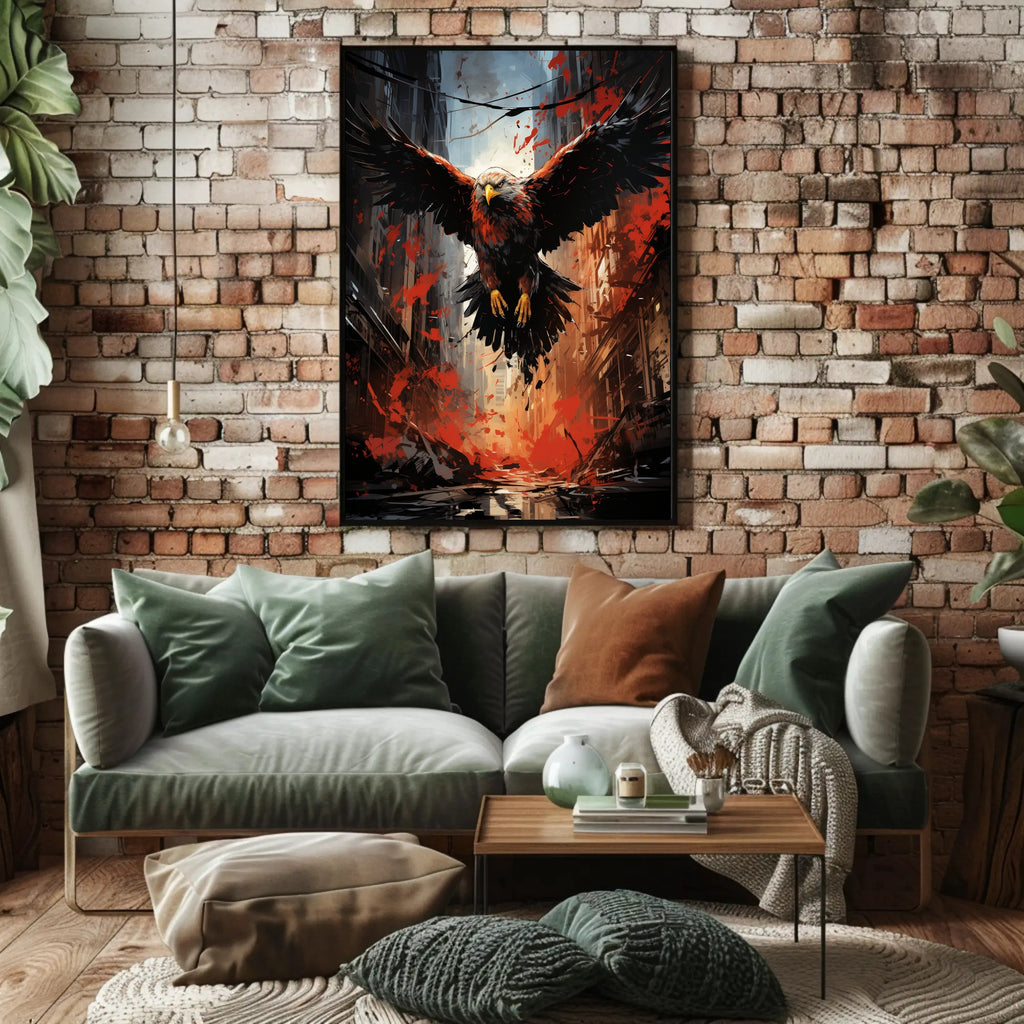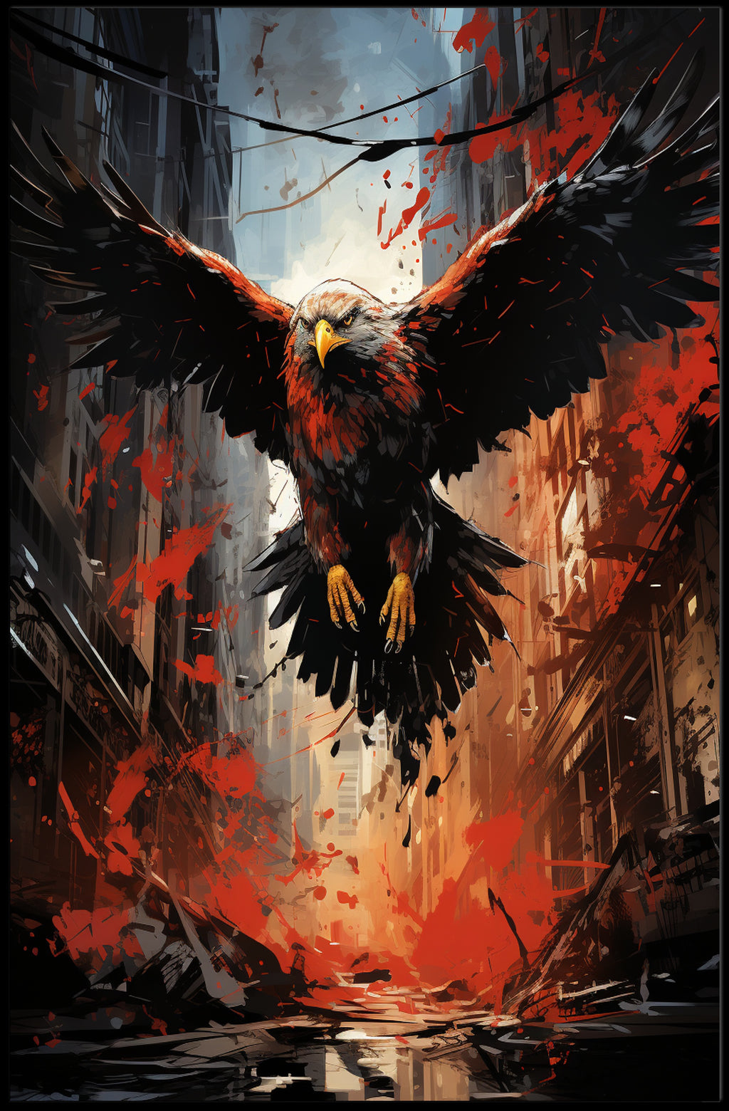 Rendered with high-contrast lighting and dynamic brushstrokes, this poster features a commanding eagle descending through a narrow urban canyon. Its outstretched wings slice across a sky of cool blues while vibrant splashes of red erupt below, creating motion and tension that draws the eye. Rich blacks, warm ambers, and painterly textures give the composition depth and a gallery-quality feel perfect for modern decor.