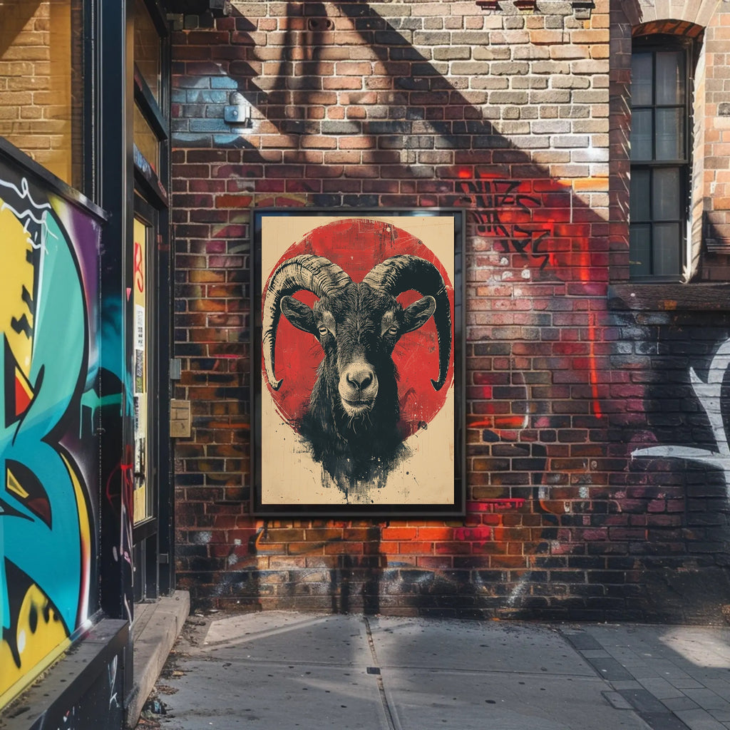 Bring bold, nature-inspired character to your walls with the Majestic Ram Art Print Poster from PosterGoat. This striking minimalist poster features a finely detailed ram portrait rendered in inky black strokes set against a distressed red circular backdrop and vintage parchment tones — a dramatic focal point that blends rustic charm with modern art & aesthetic sensibilities.