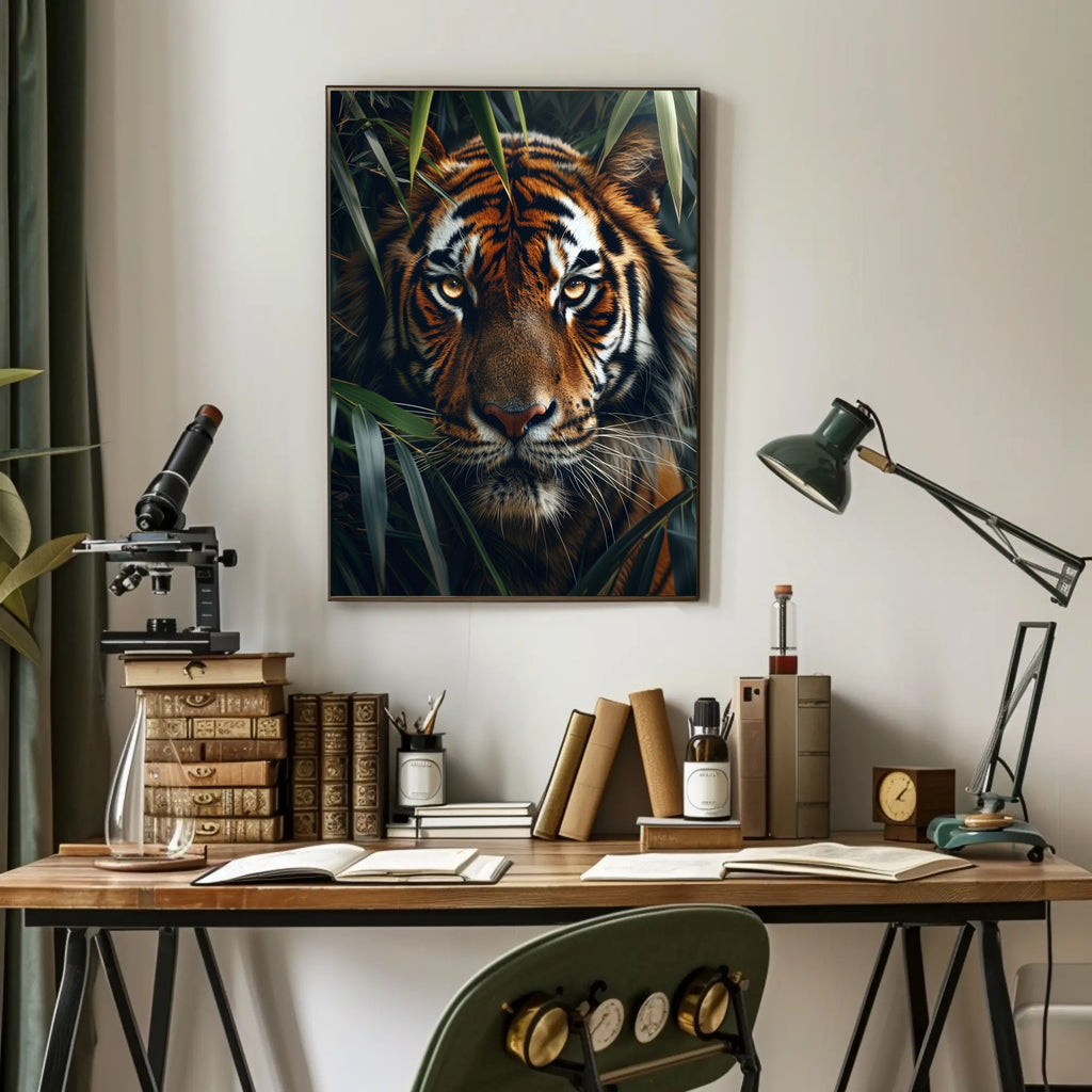 Why it stands out: the photo-realistic rendering and minimalist composition emphasize the tiger's regal presence while complementing contemporary and nature-inspired interiors. The dramatic contrast between the animal's vibrant coat and the deep green leaves creates depth that draws the viewer in from every angle.