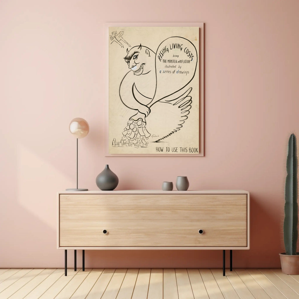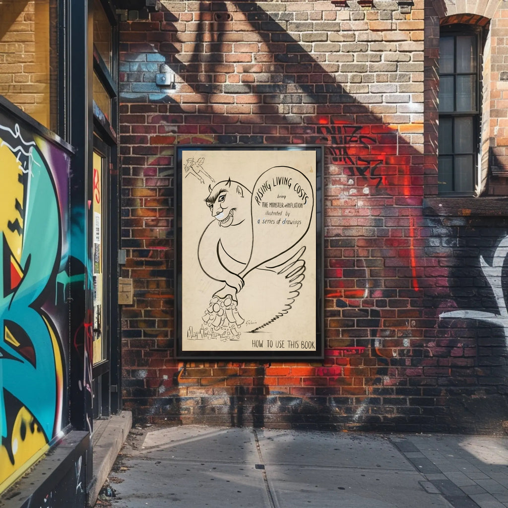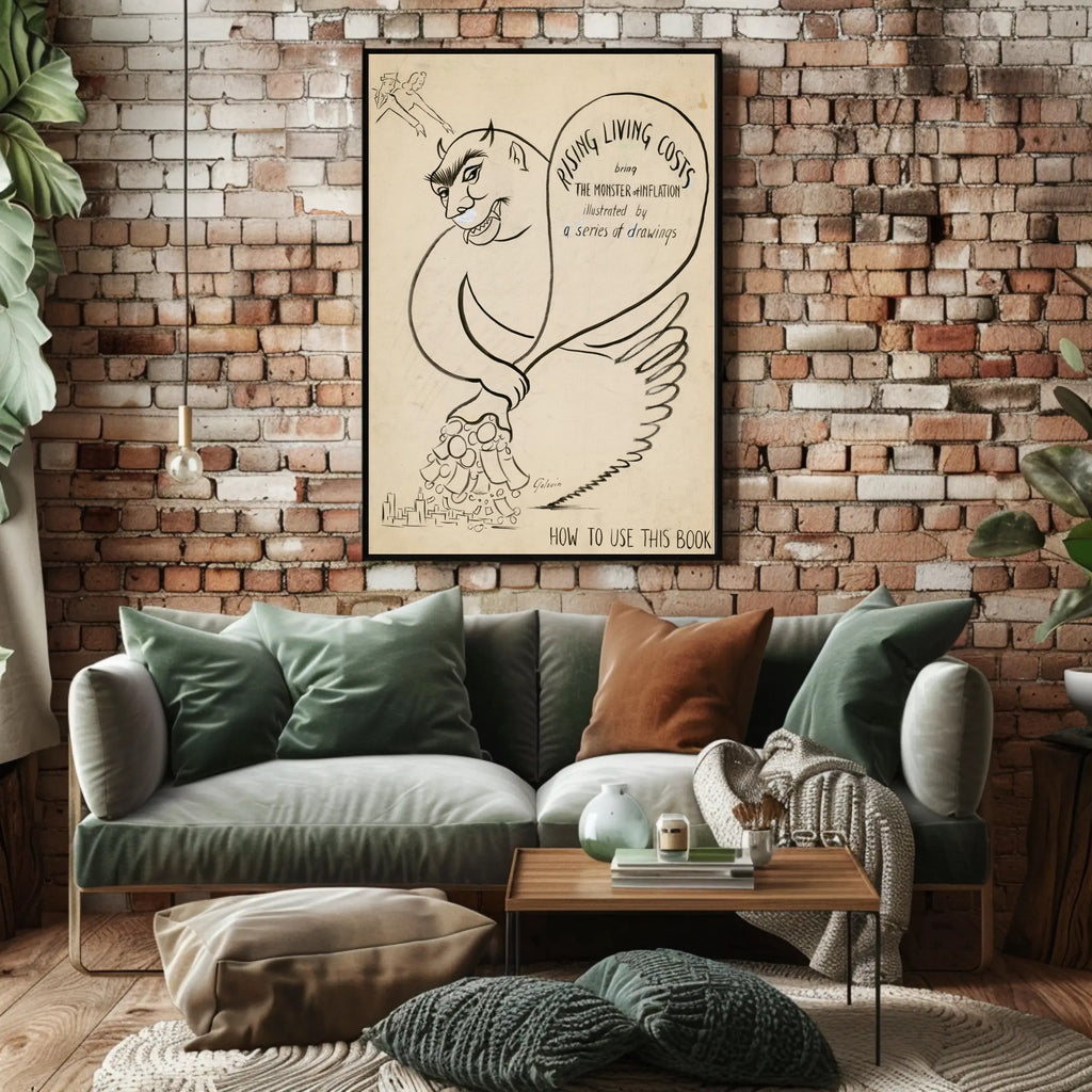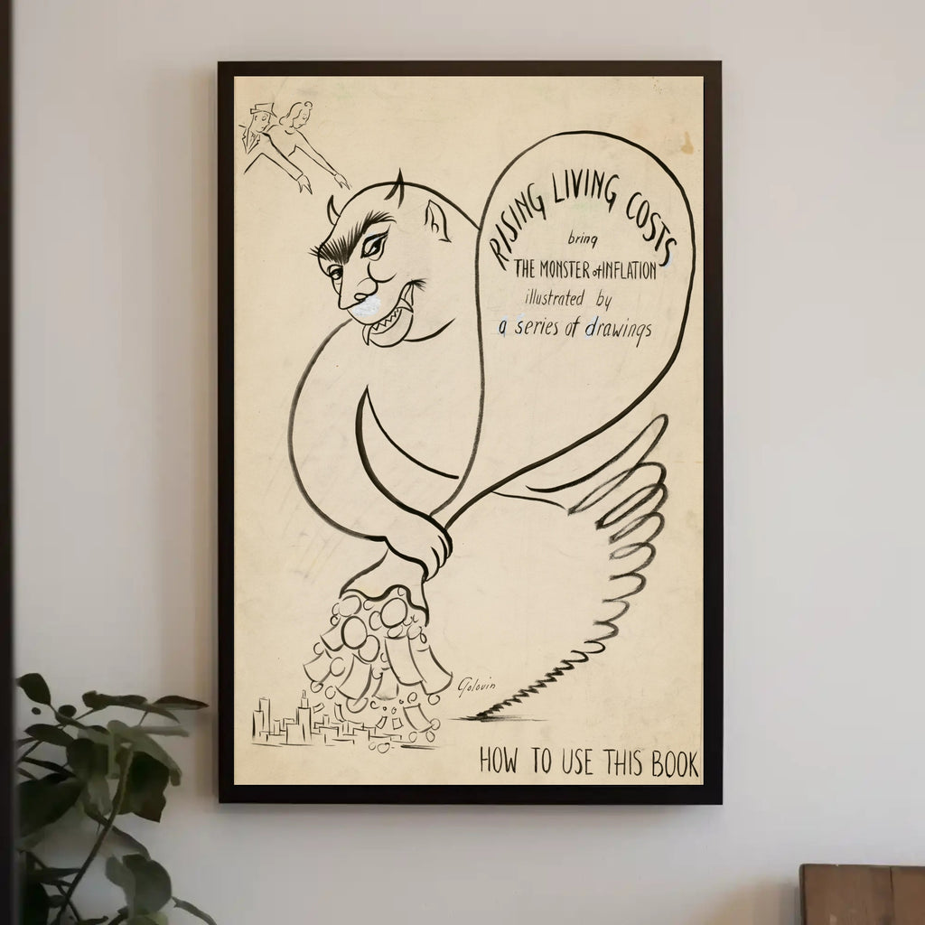 Bring a piece of provocative vintage-inspired art into your home with "The Monster of Inflation Poster" by PosterGoat. This striking, hand-drawn print captures a mischievous, horned creature clutching cascading coins over a miniature city — an evocative commentary on rising living costs rendered in bold, fluid ink strokes on aged, textured paper.