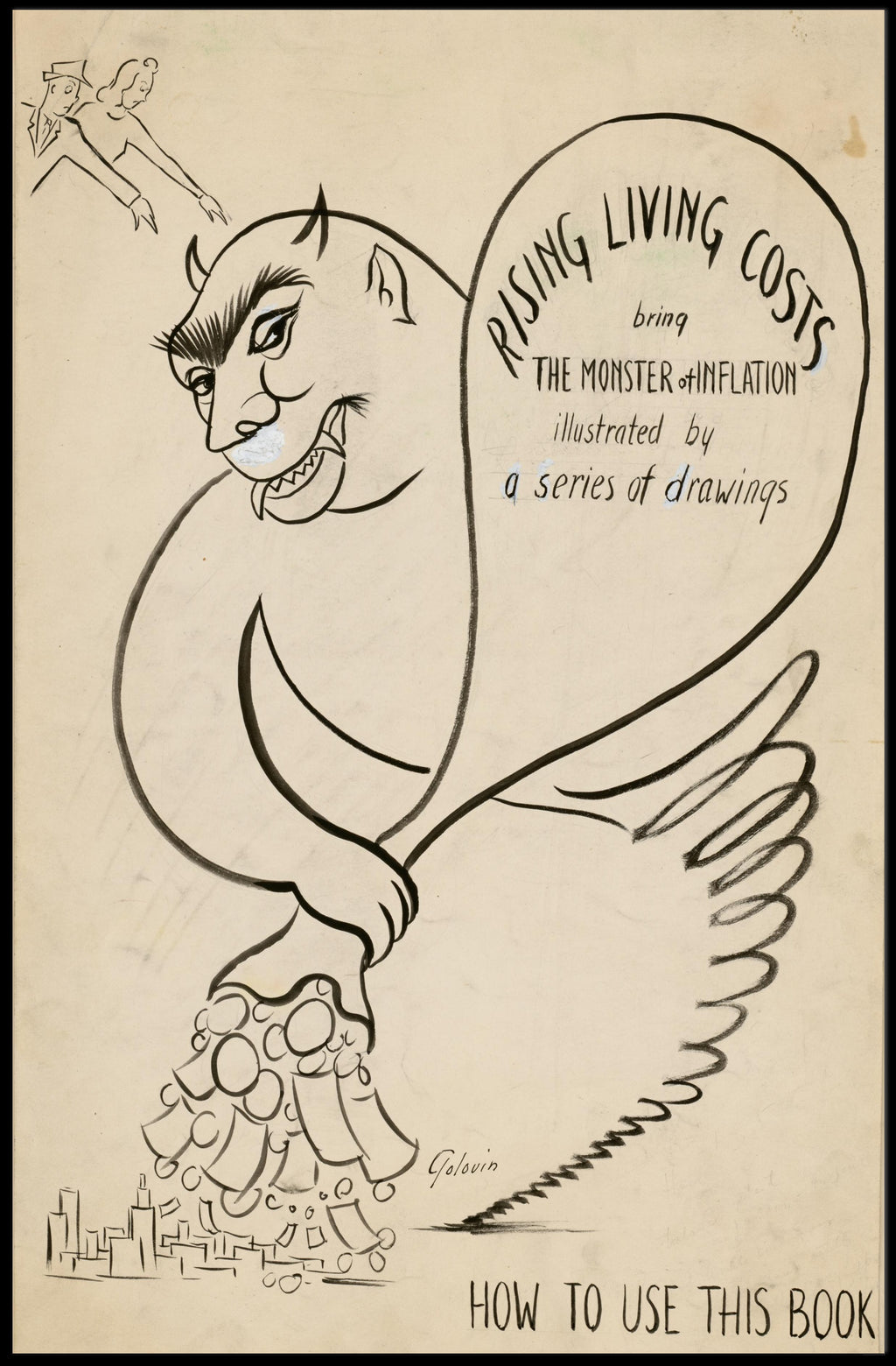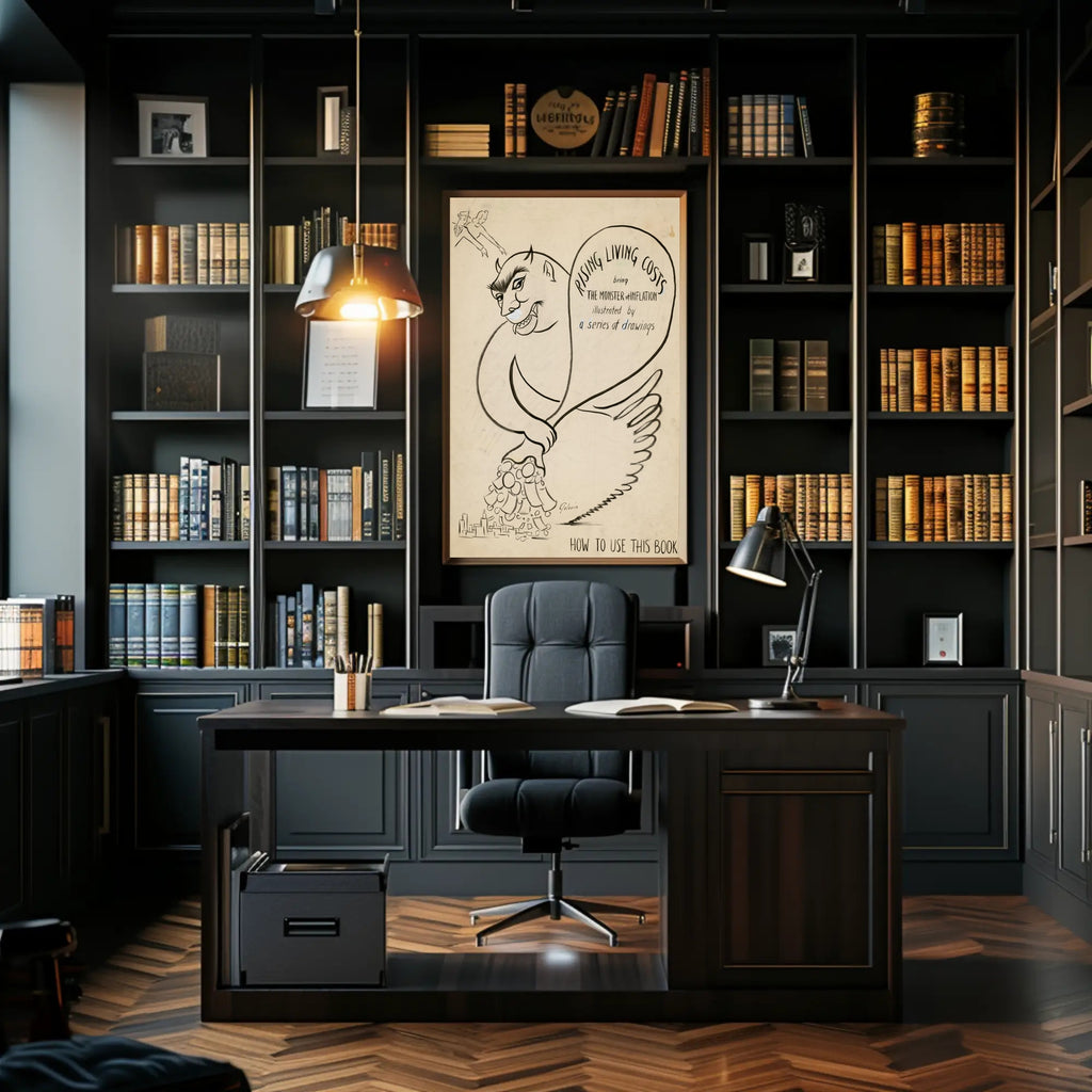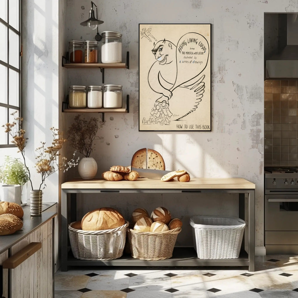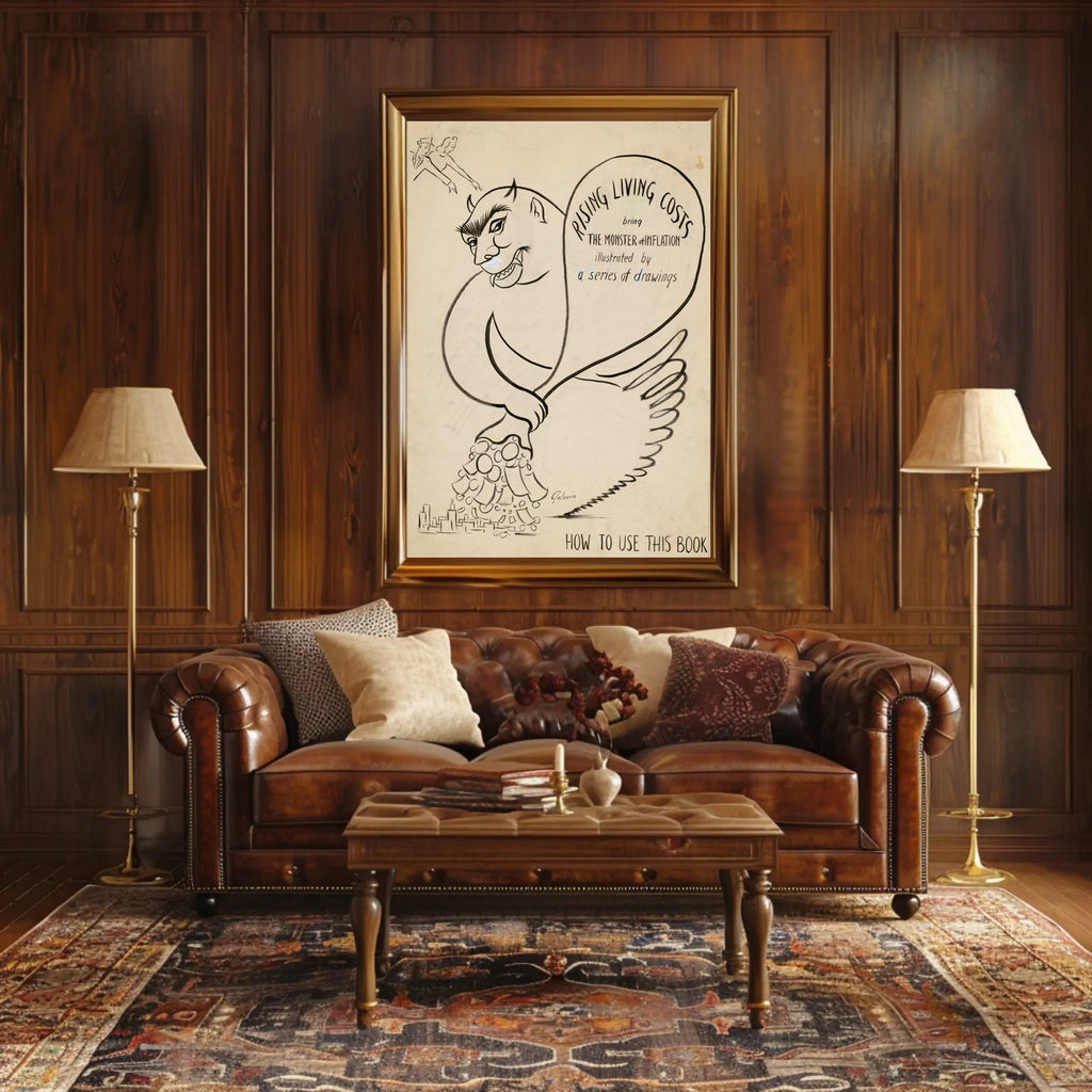 Bring a piece of provocative vintage-inspired art into your home with "The Monster of Inflation Poster" by PosterGoat. This striking, hand-drawn print captures a mischievous, horned creature clutching cascading coins over a miniature city — an evocative commentary on rising living costs rendered in bold, fluid ink strokes on aged, textured paper.