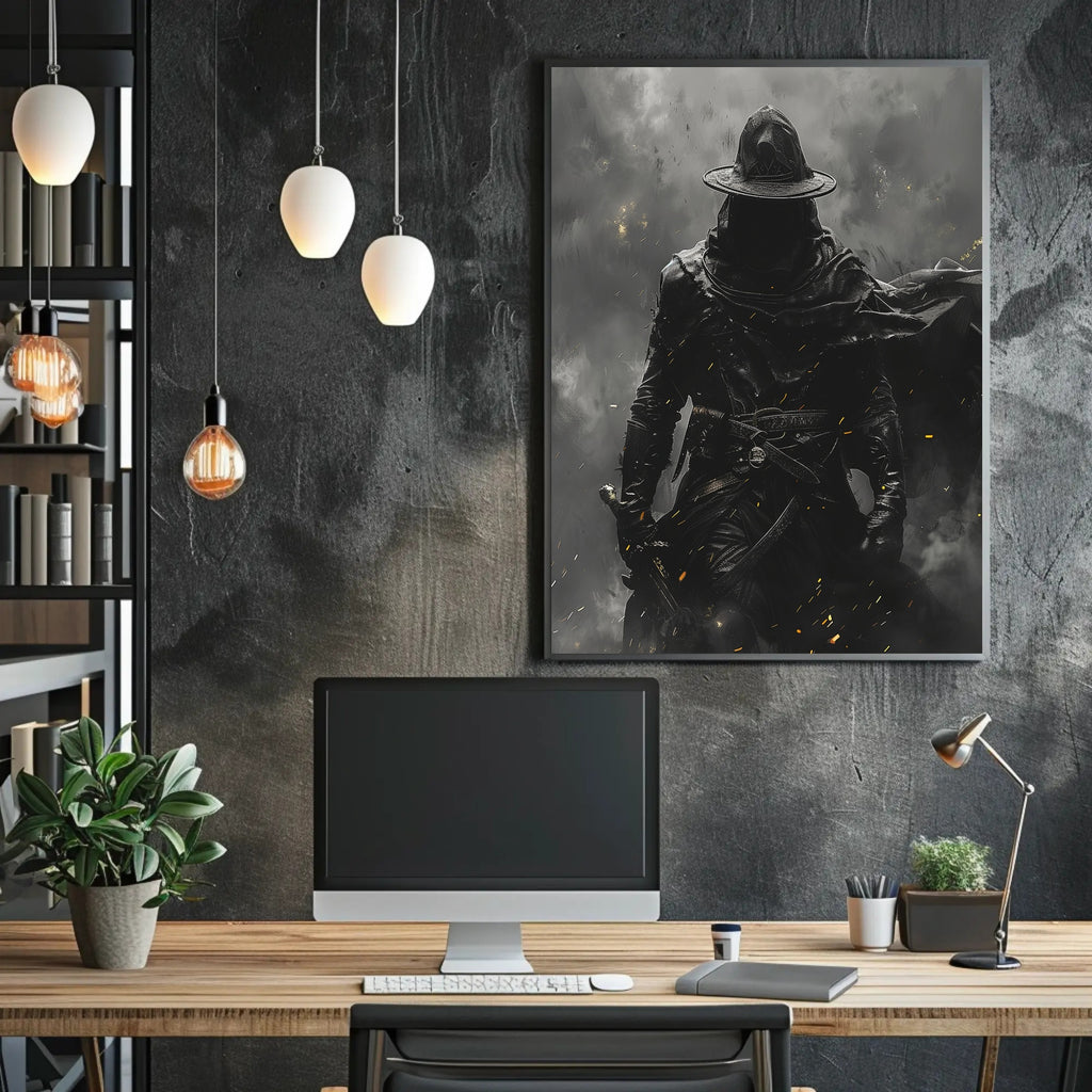 The Mysterious Wanderer Art Print Poster from PosterGoat brings an aura of adventure and intrigue to any room. This striking, minimalist poster features a cloaked figure in a wide-brimmed hat emerging from smoke and embers — a dramatic scenic composition that captures the spirit of wanderlust and mystery. Its moody grayscale palette contrasted with flickers of warm sparks makes it a captivating focal point for living rooms, home offices, or travel-inspired galleries.