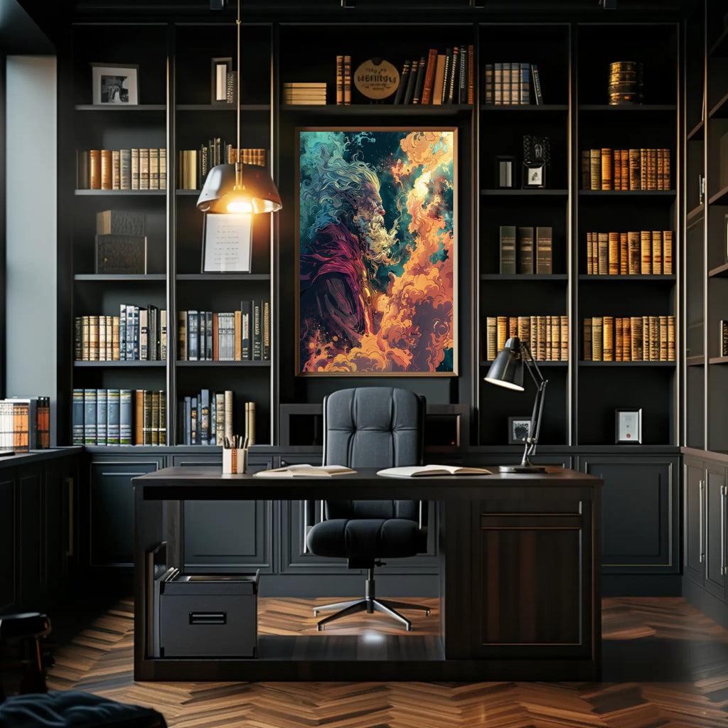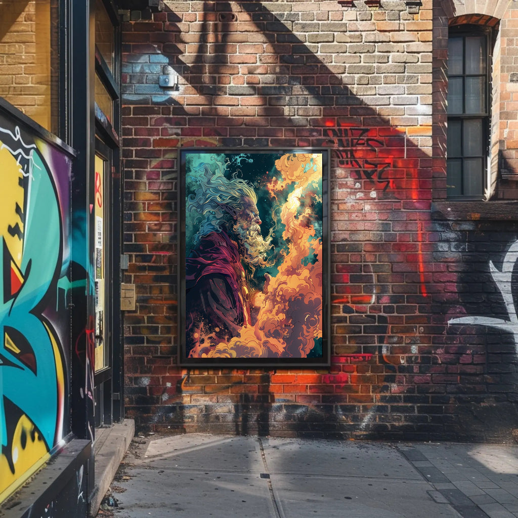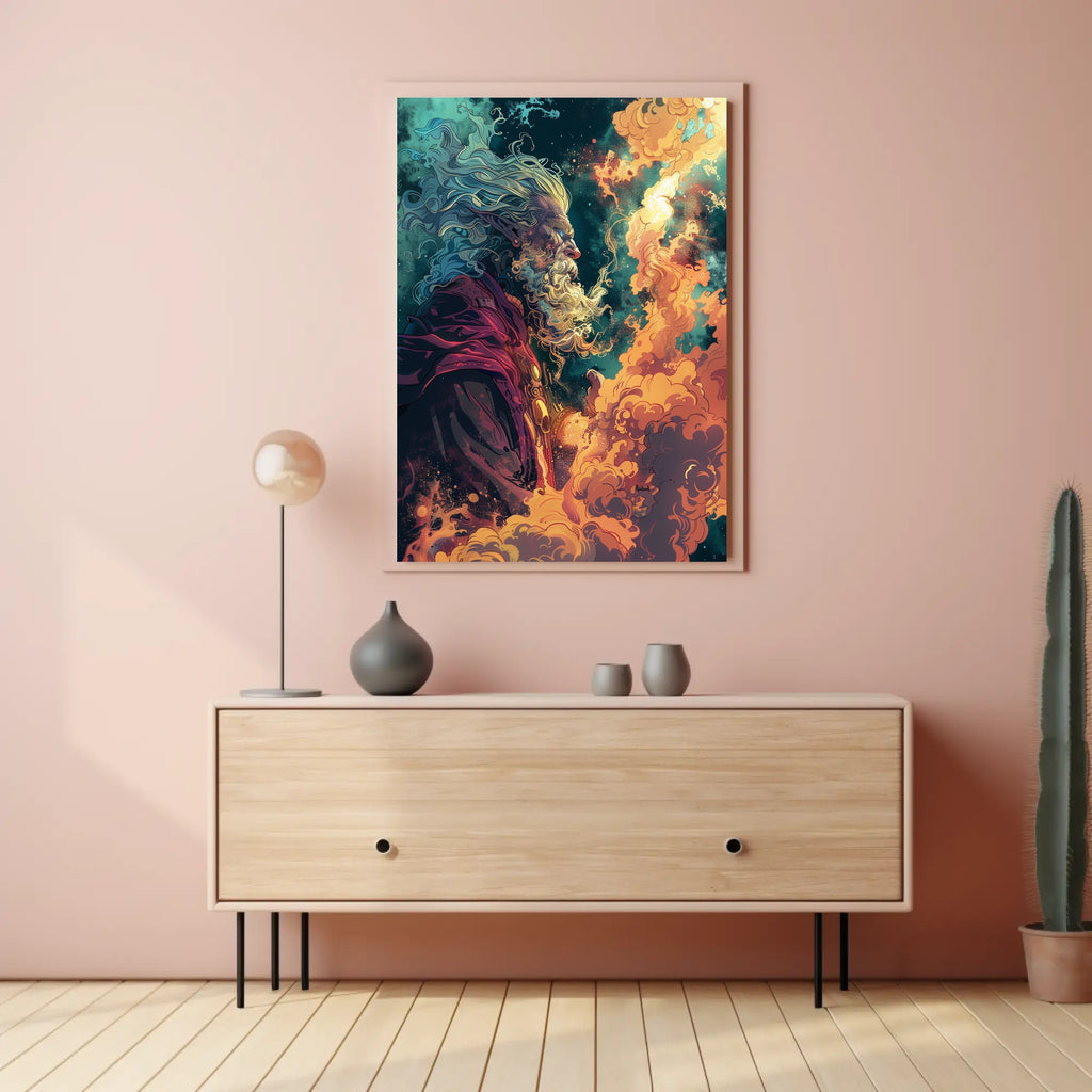 The Mystical Elder Poster from PosterGoat brings a spellbinding centerpiece to your walls — an intricate, vibrant art print that merges mythic storytelling with modern minimalist design. Rich teal backdrops, a windswept elder with flowing silver hair and a braided beard, and curling clouds of molten orange smoke combine to create a cinematic, atmospheric scene that draws the eye and sparks imagination.