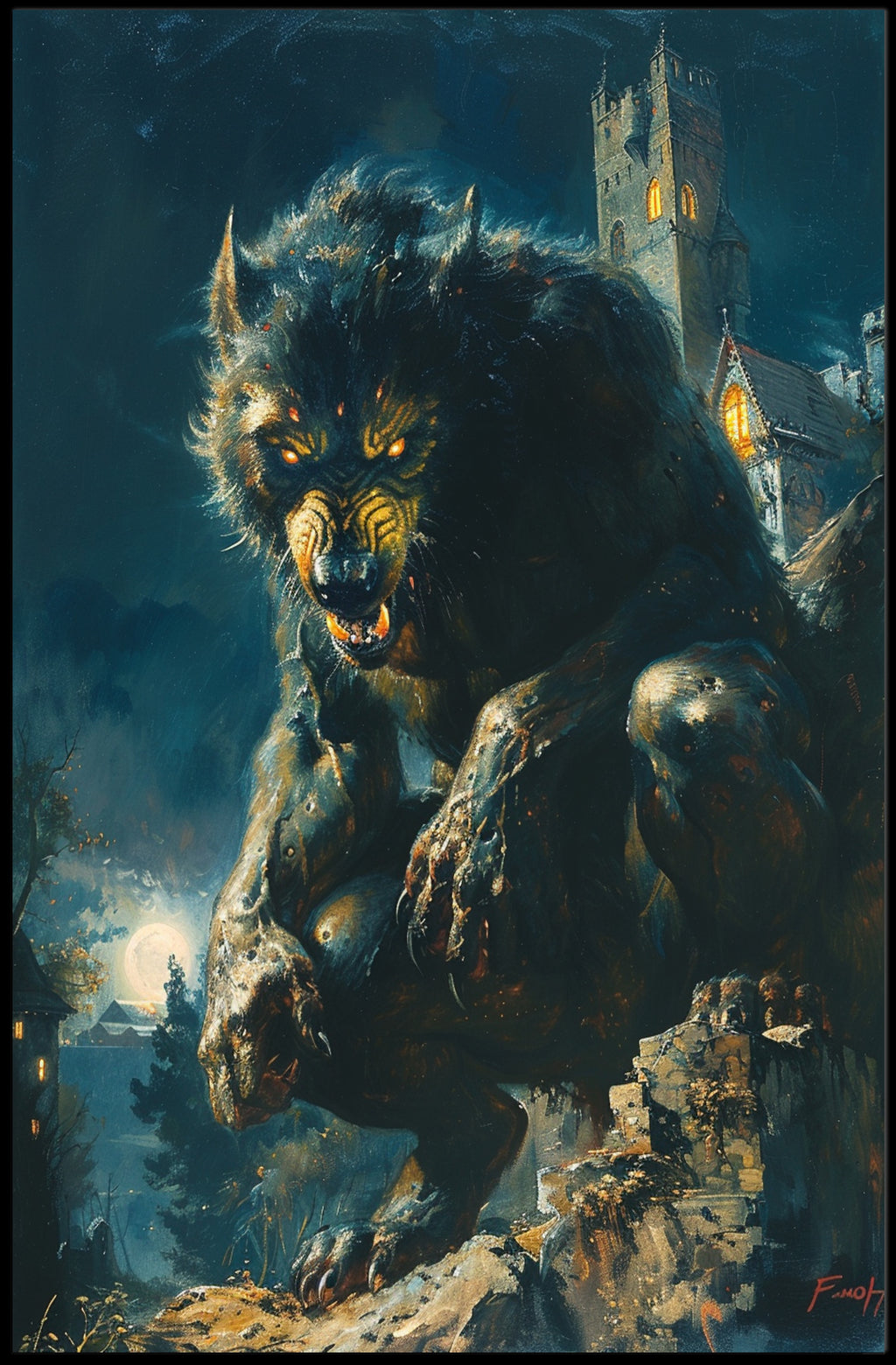 Bring the wild into your living space with The Nocturnal Beast Art Poster from PosterGoat — a striking wall art piece that fuses Pop Art energy with dark, scenic storytelling. This dramatic print depicts a colossal, snarling beast perched on rocky ruins beneath a luminous full moon, with a distant castle and warm, glowing windows adding cinematic depth. Rich navy tones, gold highlights and textured brushwork create a haunting focal point that commands attention and sparks conversation.