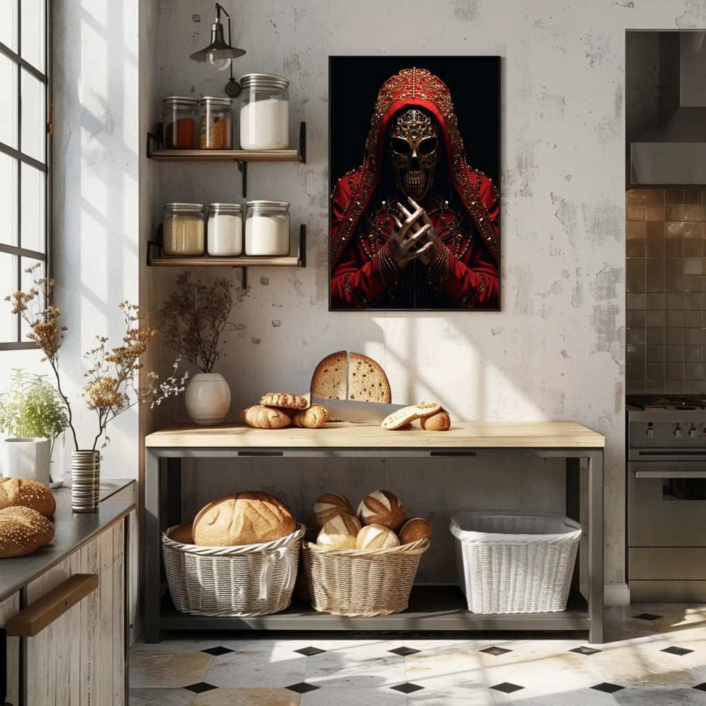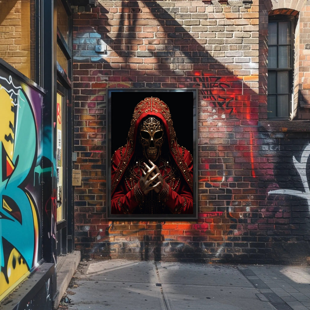 Why collectors choose The Ornate Enigma: The composition balances mystery and opulence — the ornate hood, jewel-like accents and skeletal mask combine storytelling and style, making this poster a memorable gift or centerpiece. Its dramatic palette complements minimalist, industrial and eclectic interiors.