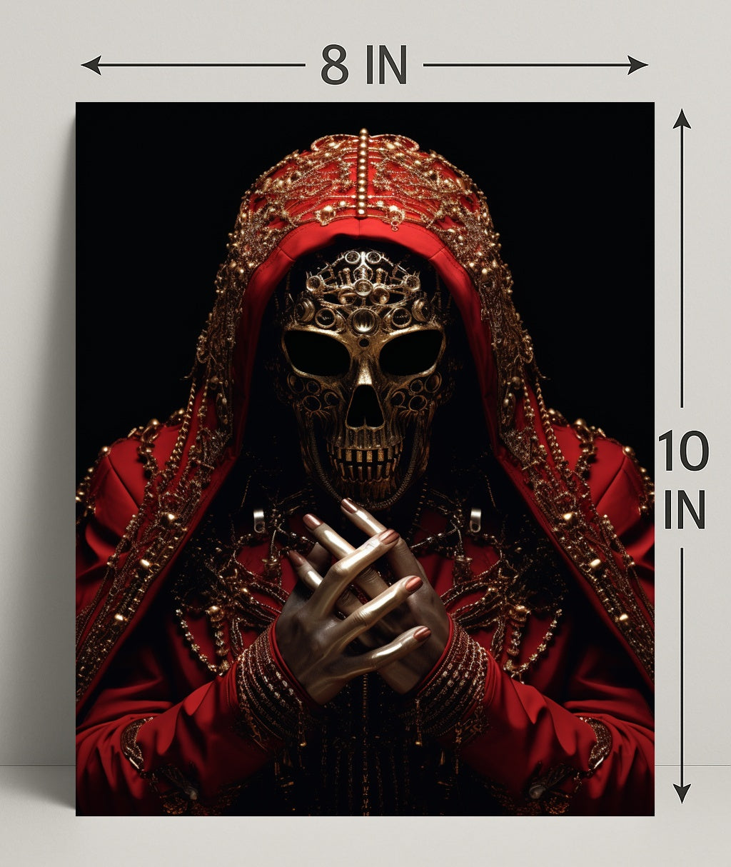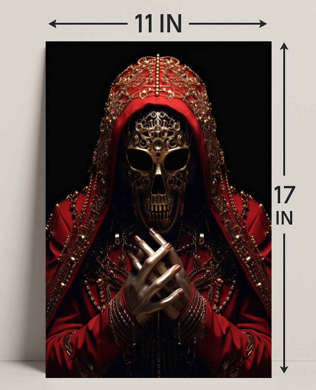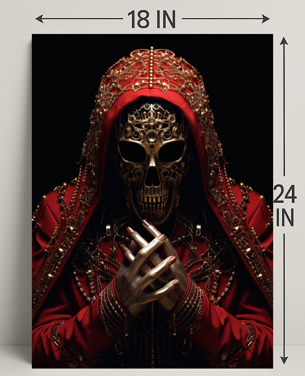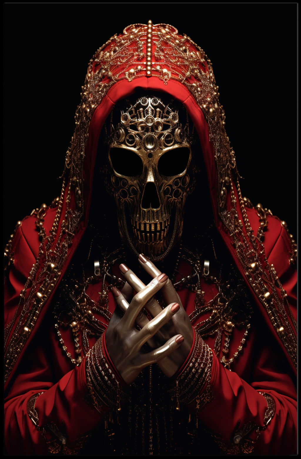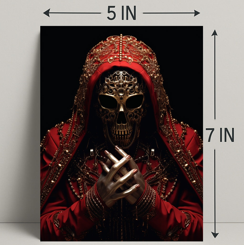Elevate your walls with The Ornate Enigma Poster from PosterGoat — a photorealistic, museum-quality art print that fuses intricate ornamentation with a mysterious, cinematic presence. This striking poster features a gilded skull mask framed by a richly embroidered red hood, layered chains and filigree, and lifelike metallic hands clasped in the foreground — a dramatic focal point that transforms any room into a conversation starter.