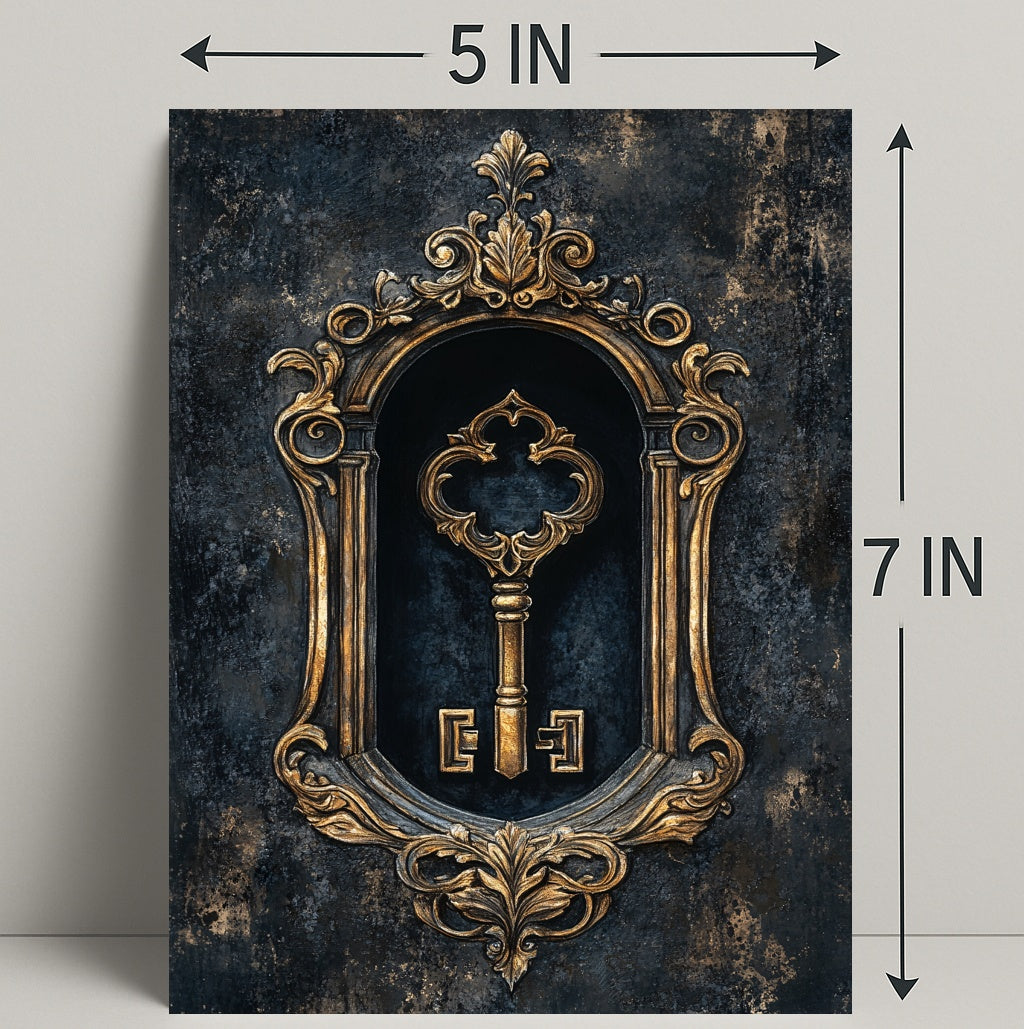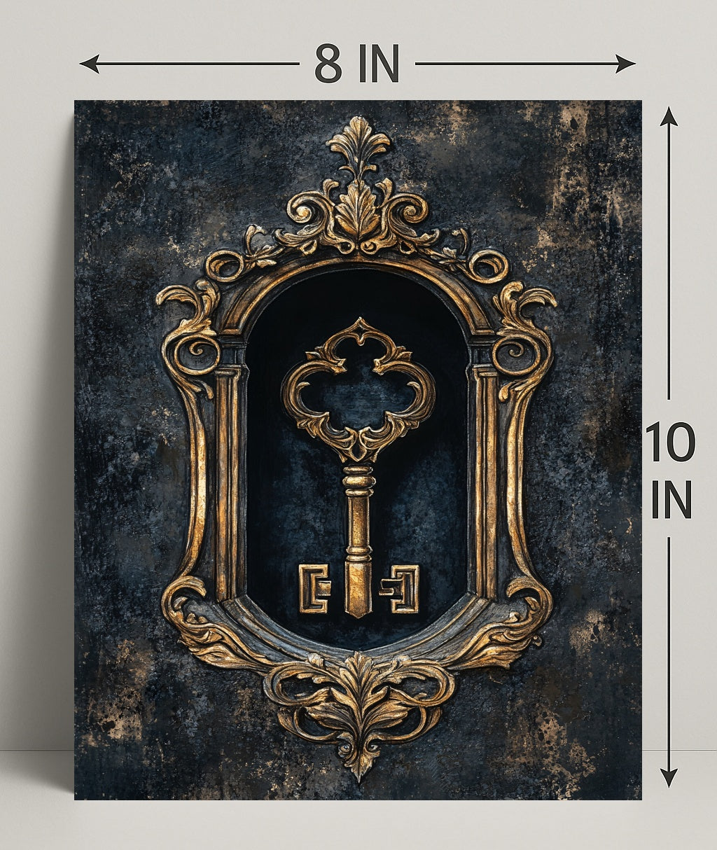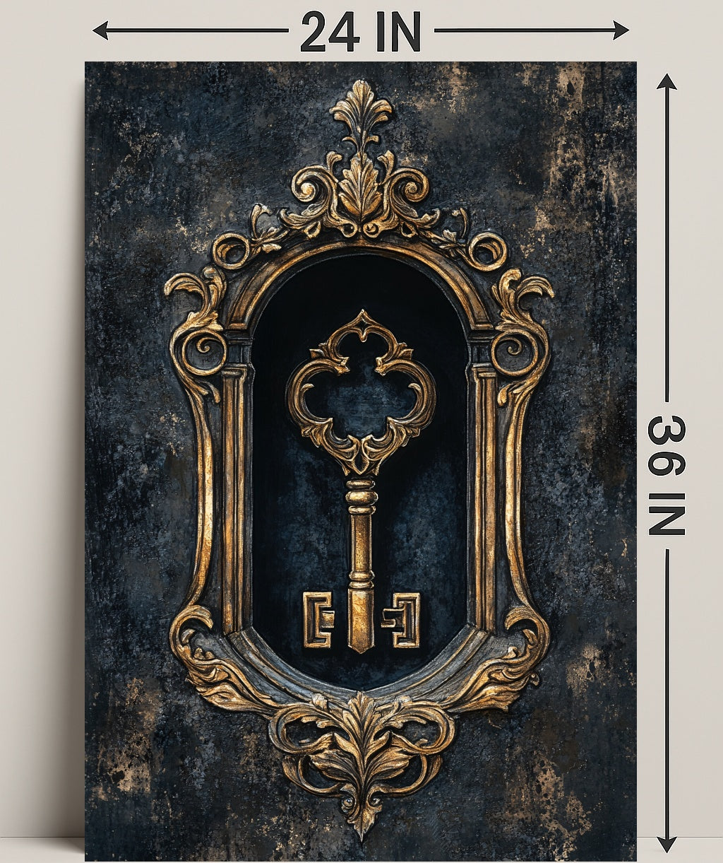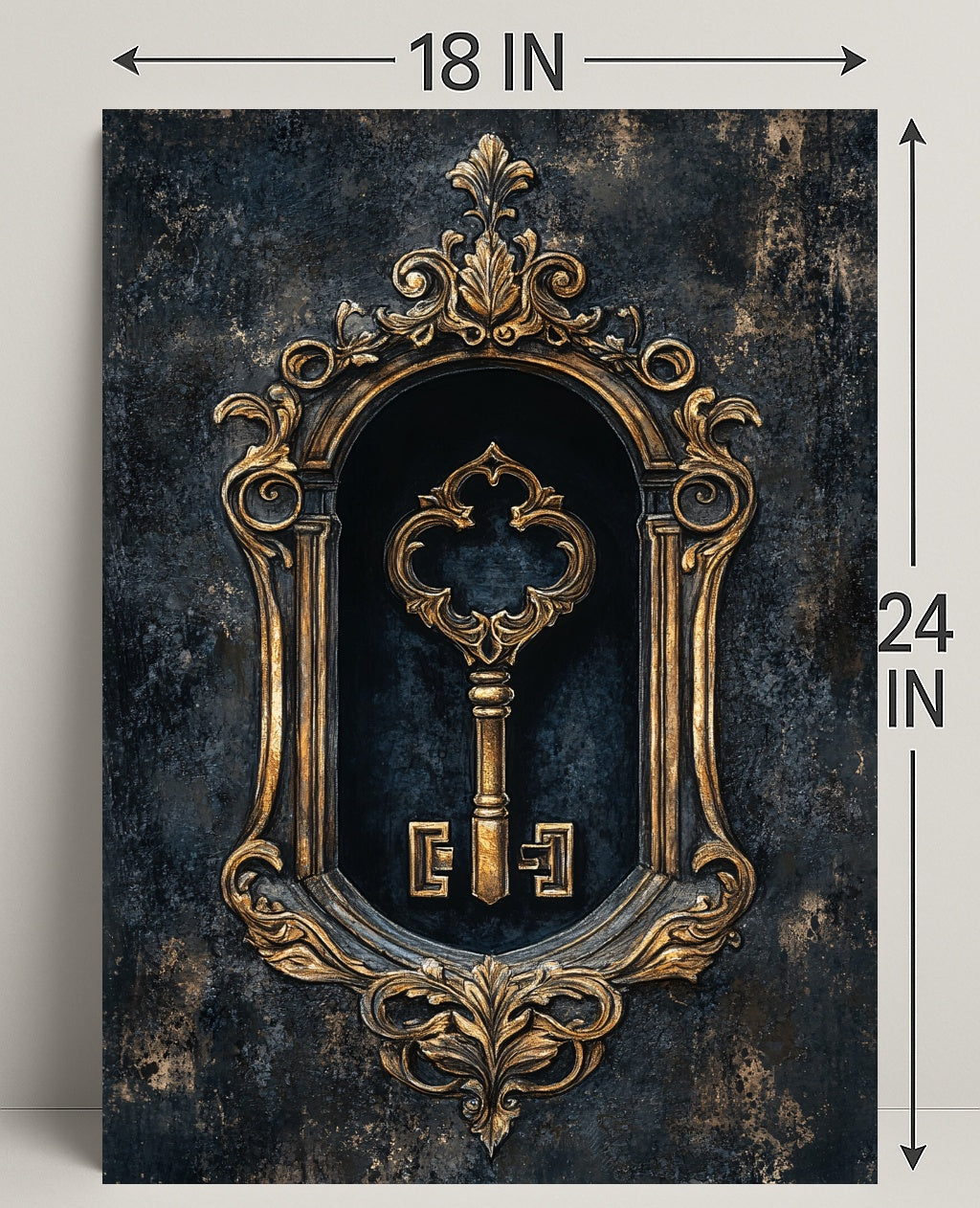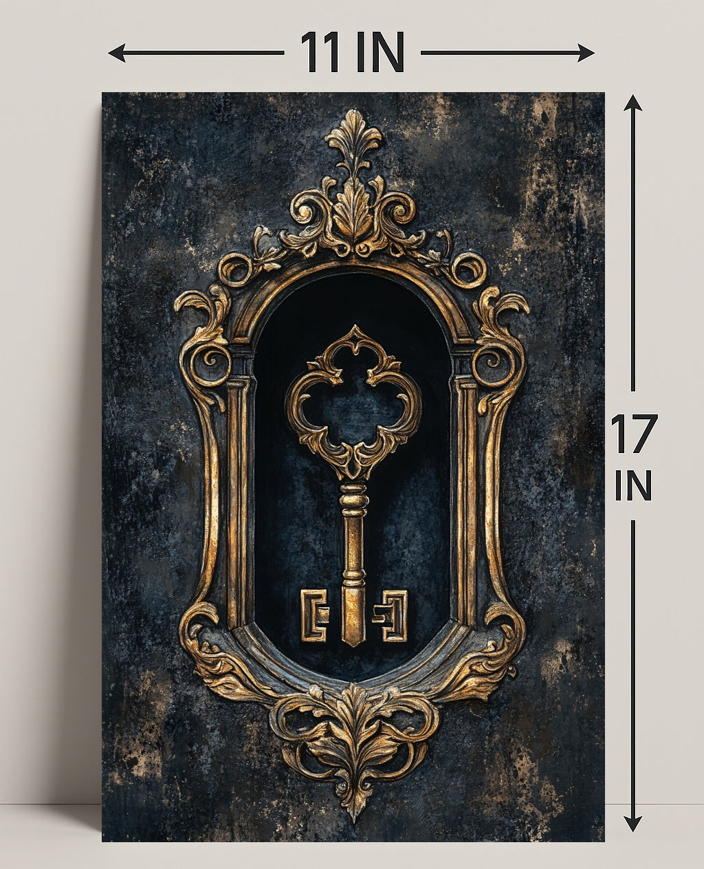 Elevate your walls with The Ornate Key Poster from PosterGoat — a photorealistic poster that marries antique charm with contemporary dark aesthetics. A richly detailed golden key sits framed in an ornate Baroque-style surround against a textured, moody backdrop, creating a striking focal point that invites curiosity and imagination.