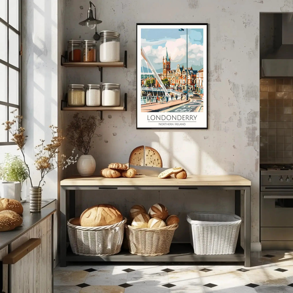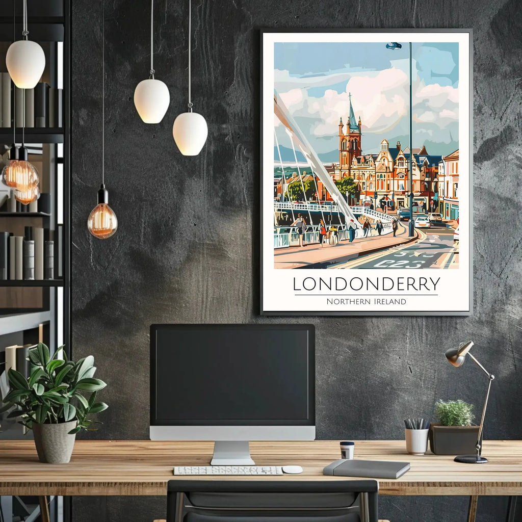 Bring the spirit of Londonderry, Northern Ireland into your home with this vibrant travel poster from PosterGoat. Featuring a striking cityscape view of the riverside bridge, historic Victorian architecture and bustling waterfront streets, this print turns any wall into a window onto one of Northern Ireland’s most photogenic towns.