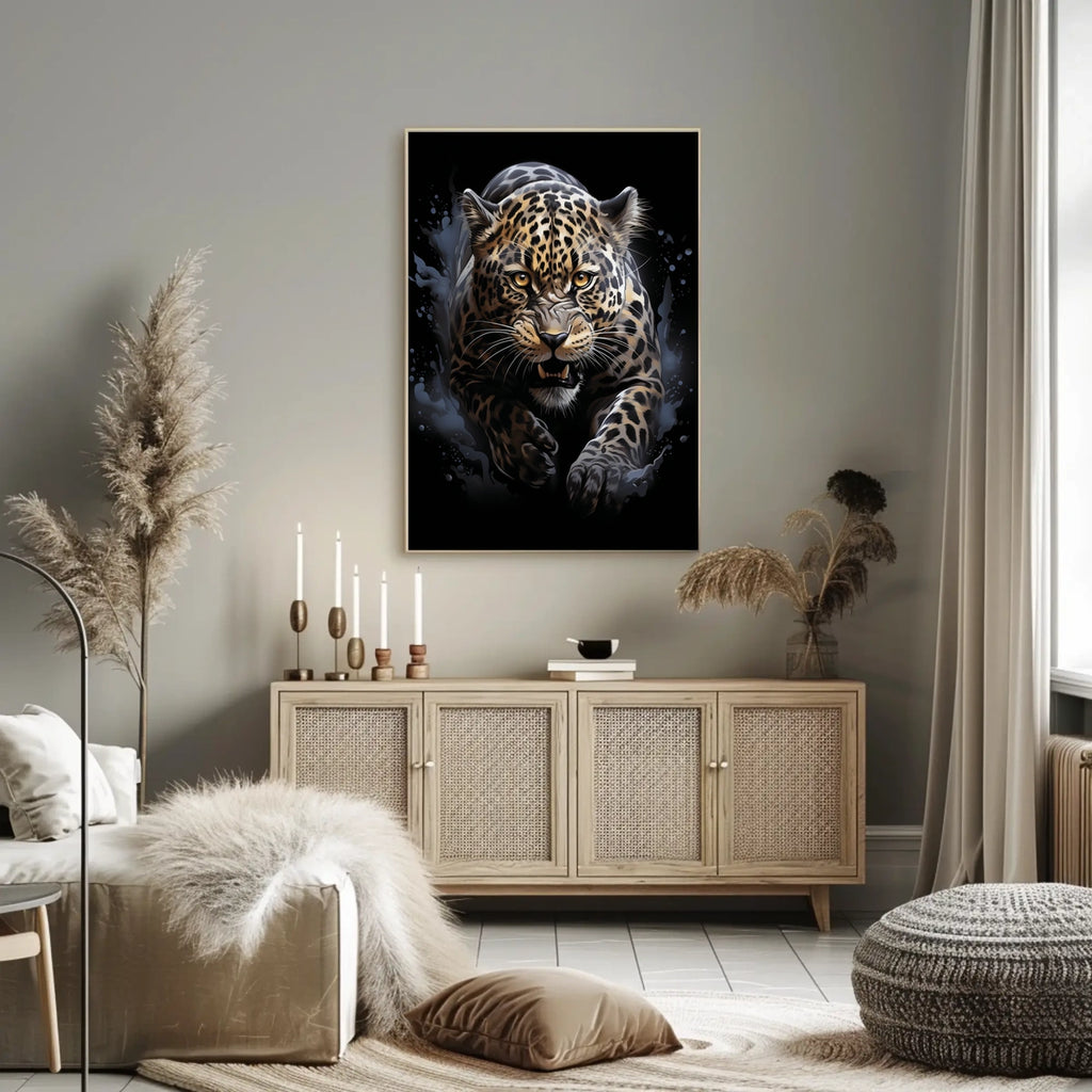 The leopard is sharply illustrated with meticulous attention to its fur patterns and fierce expression, highlighting its penetrating eyes and bared teeth. This travel poster uses a modern, photorealistic style, which brings a sense of vitality and movement to the composition. The background is a stark black, allowing the leopard to dominate the scene and emphasizing its predatory elegance. Splashes of abstract blue shapes around the leopard suggest movement and energy, enhancing the dramatic mood. Overall, the theme is powerful and immersive, capturing the untamed essence of wildlife.