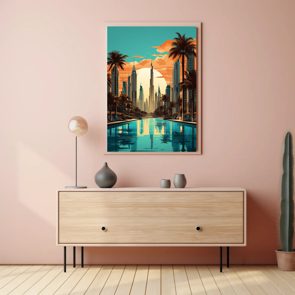 The artistic style is a blend of modern and retro, with clean, bold lines and vibrant, contrasting colors. The presence of palm trees and skyscrapers suggests a luxurious, metropolitan mood. The overall theme conveys a sense of innovation and prosperity, underscored by the urban, futuristic setting and the warm color palette that enhances the sense of modernity and elegance.. Designed for decor lovers and wanderlust spirits, this art print adds charm to any room with visuals inspired by real-world scenery.
