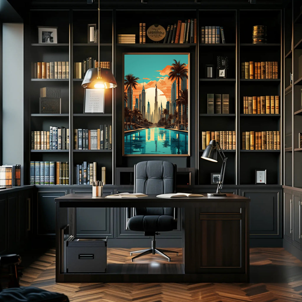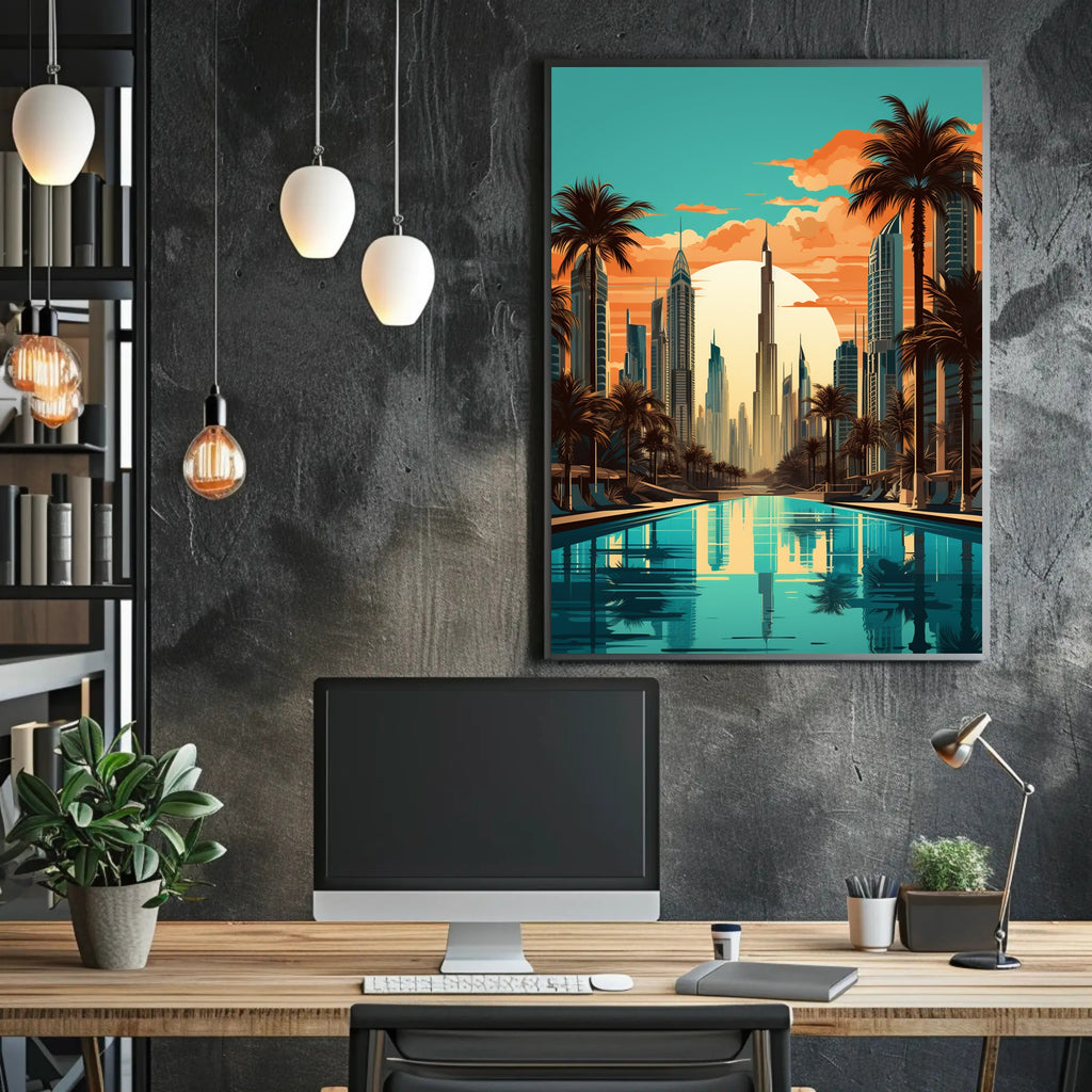 This travel poster captures the essence of The poster features a stylized cityscape with a focus on a futuristic environment, likely representing Dubai with its iconic skyline and palm trees. The central structure resembles the Burj Khalifa, marking it as a notable landmark. The scene is bathed in warm, sunset hues of orange and teal, reflecting dramatically on a calm water body in the foreground, evoking a serene yet dynamic atmosphere.