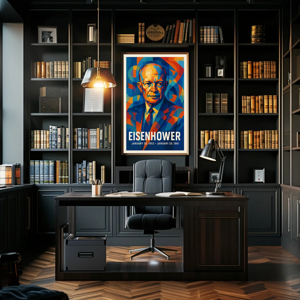 This travel poster captures the essence of a vintage-style illustration featuring a male figure dressed in formal attire. Bold, abstract colors in blues, oranges, and reds create a dynamic and eye-catching design, reminiscent of mid-20th century art styles. The text "EISENHOWER" along with the dates "JANUARY 20, 1953 - JANUARY 20, 1961" suggests a connection to a prominent American political leader who served during this period, conveying a patriotic theme. The geometric and abstract style evokes tradition and respect, suited for commemorating a significant era or leader in U.S. history. The overall mood is bold and celebratory, ideal for decor that honors history and leadership.
