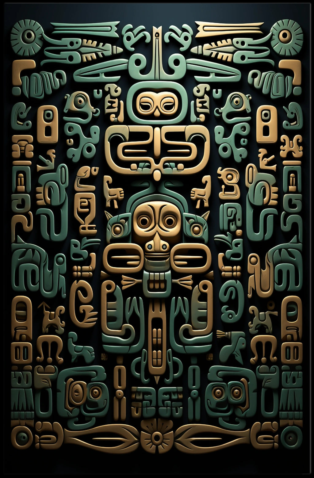 Detailed design highlighting intricate glyphs and a central deity motif, surrounded by abstract representations of animals and shapes