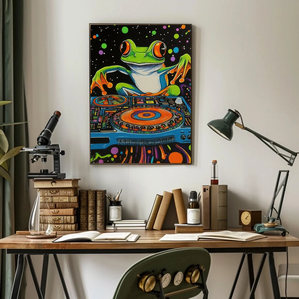 Printed with precision and made to inspire, this artwork is more than decoration—it’s a conversation piece that connects art, travel, and style. Bring the Psychedelic Frog DJ Travel Poster into your home, classroom, or office today and let your walls tell a powerful story.