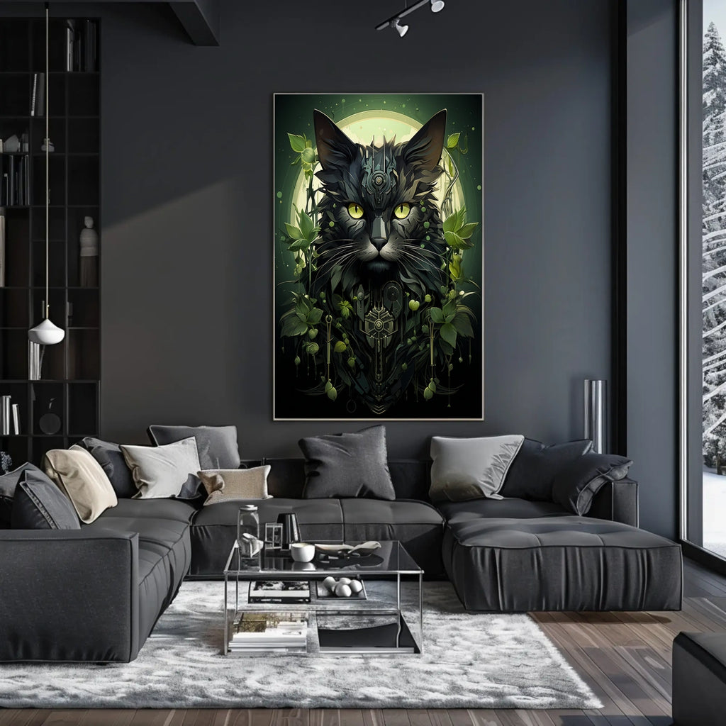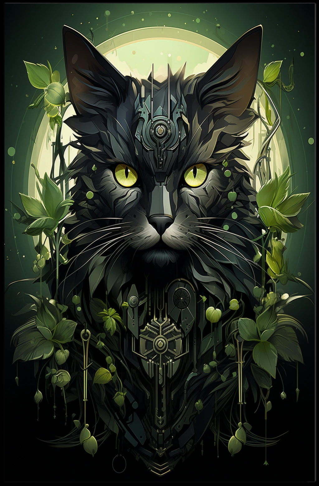 Designed to blend lush greenery with metallic accents, this art print channels a surreal, futuristic mood that balances natural and artificial elements. The cat’s vivid yellow eyes provide a striking focal point amid rich greens and metallic tones, inviting curiosity and conversation in any room.