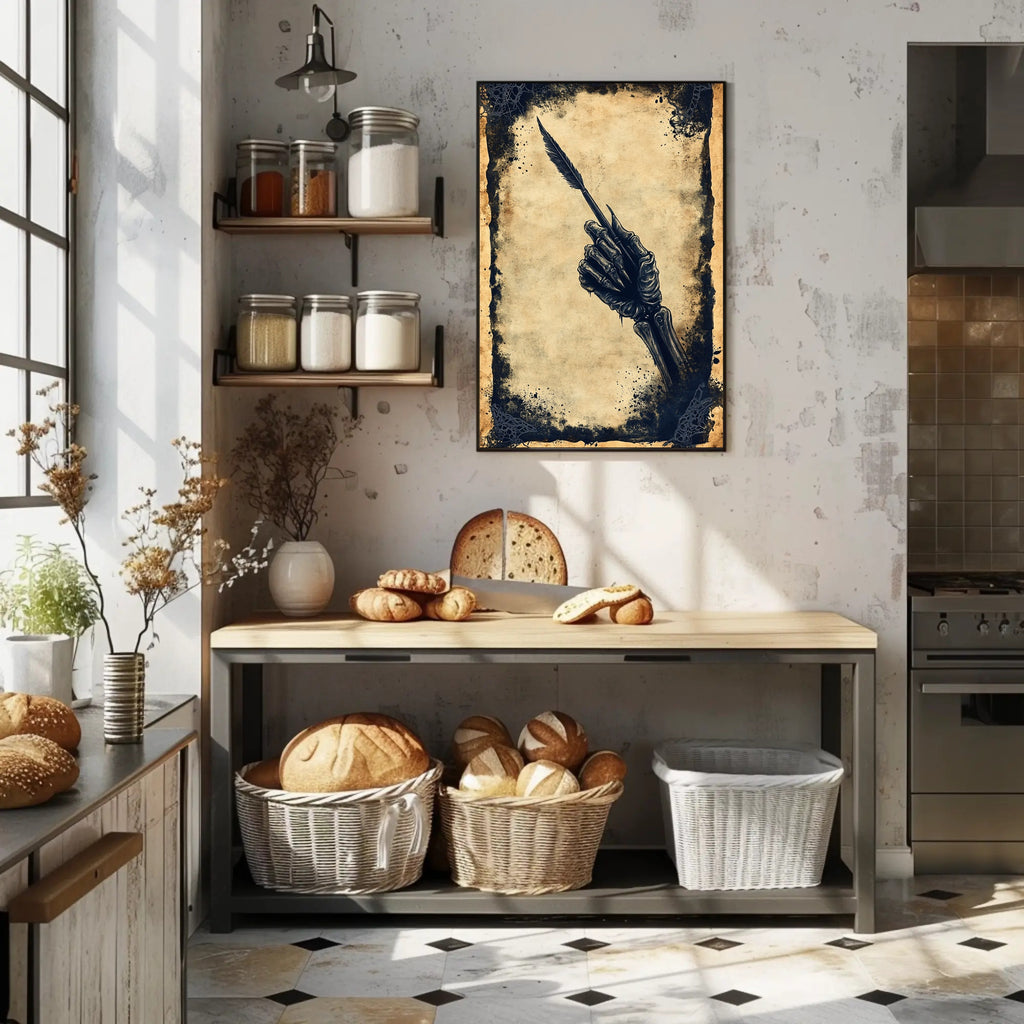 Distinctive design: Detailed, inky illustration of a bony hand holding a feather quill set against an aged, distressed background — a compelling focal point for Halloween displays or year-round statement decor.