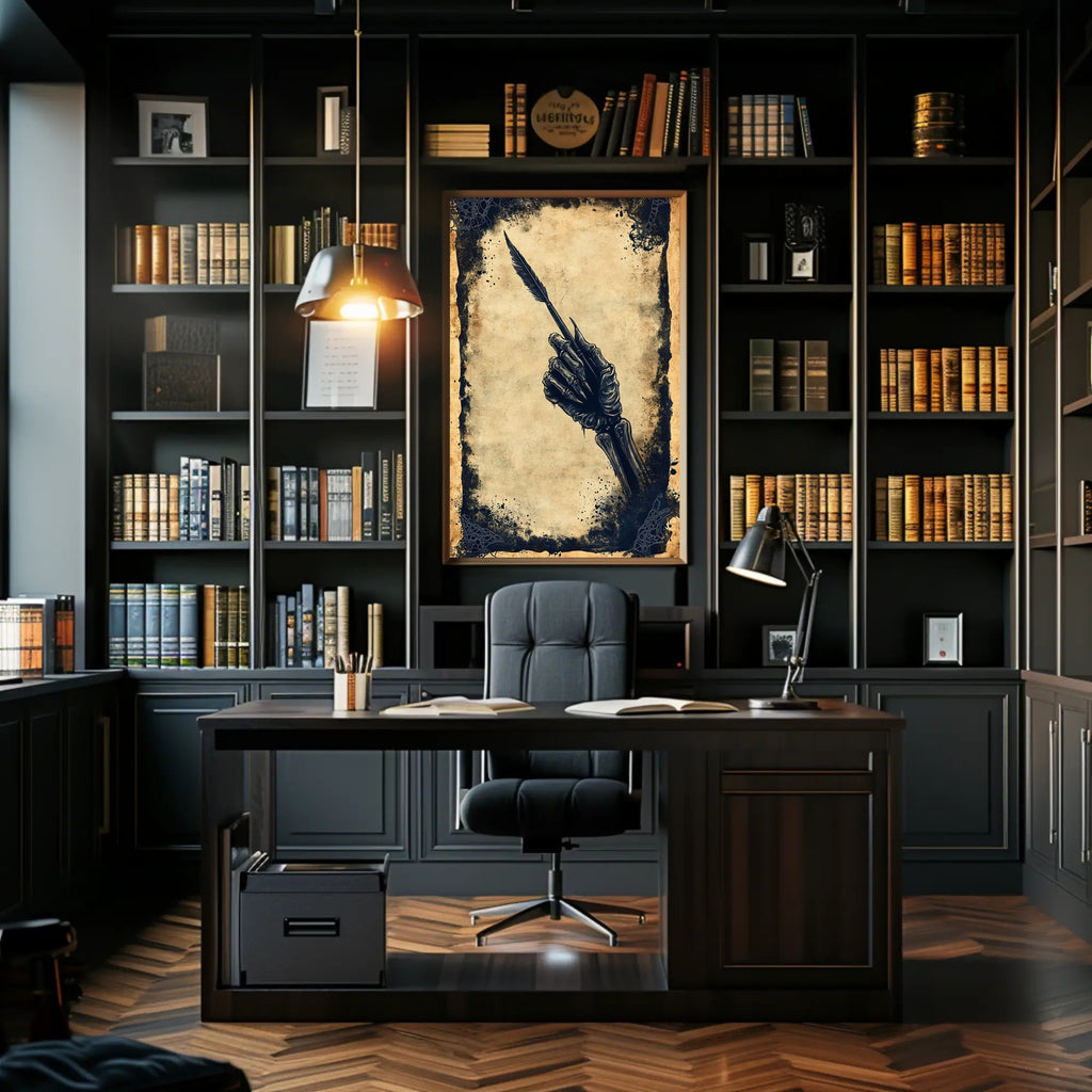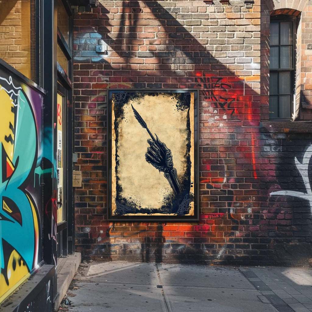 Evocative and haunting, The Quill Of Shadows Poster from PosterGoat blends vintage parchment texture with a striking skeletal hand clutching an ink quill — a minimal yet dramatic piece of wall art that commands attention in any room. Perfect for decor lovers, gothic enthusiasts, and anyone who appreciates moody, scenic artwork, this print brings an atmospheric touch of storytelling to living rooms, studios, or office spaces.