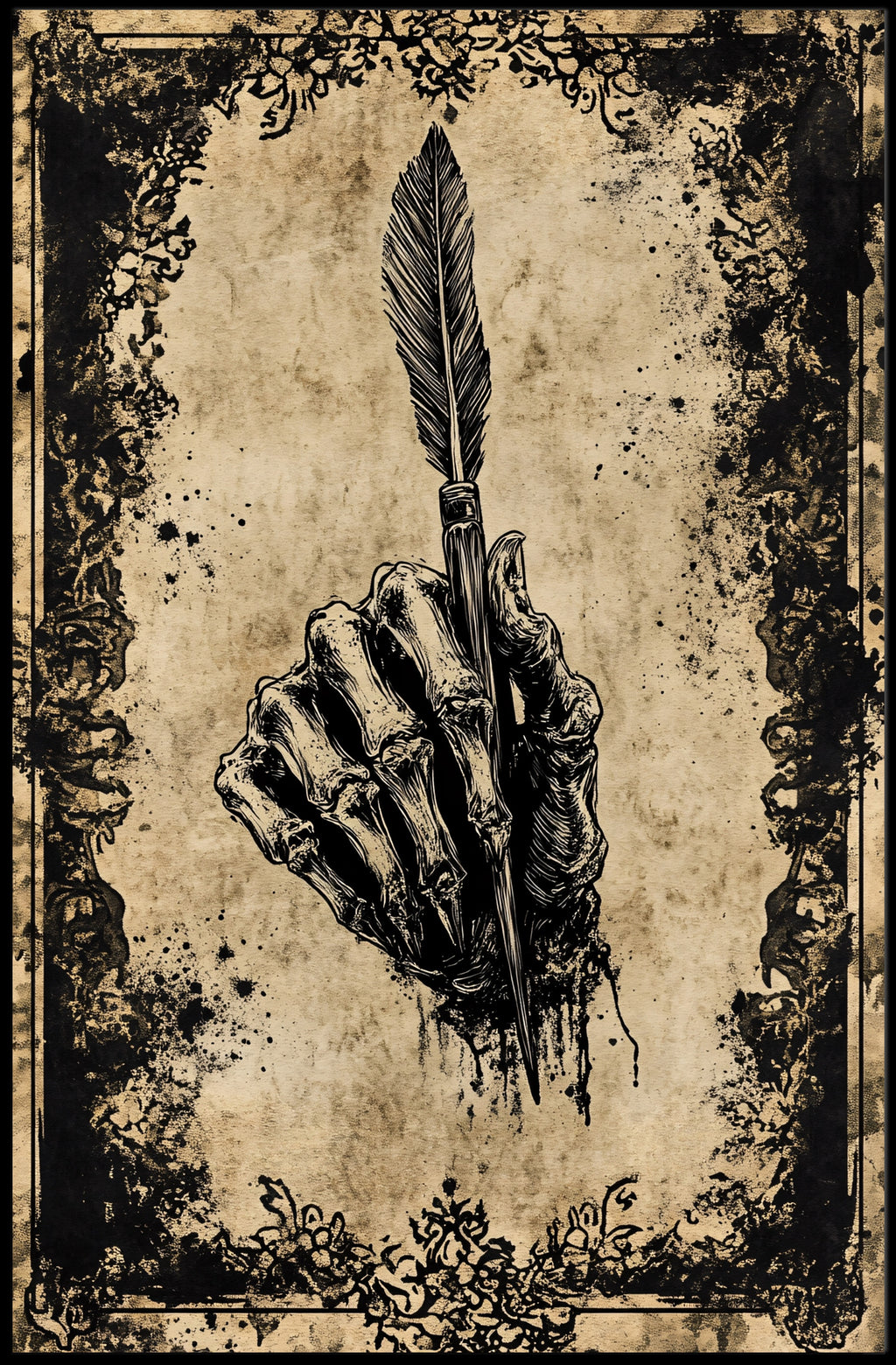 Distinctive artwork: Detailed skeletal hand holding a classic quill — evocative, moody, and instantly recognizable.