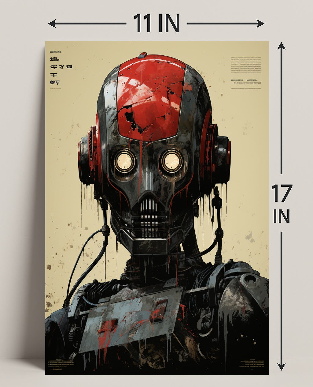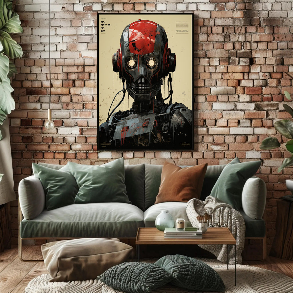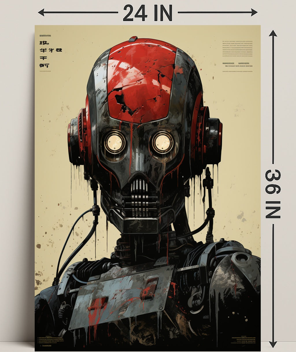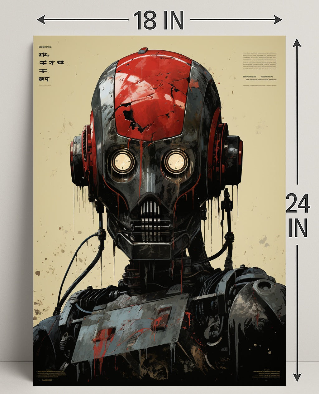 Bring bold, cinematic energy to your walls with The Red-Eyed Machine Poster from PosterGoat — a striking pop-art inspired print that fuses industrial grit with graphic beauty. This large-scale poster captures a weathered robot head: a scarred red helmet, luminous round eyes, and mechanical cables and plates dripping with paint and grime against a muted beige backdrop. The result is an unforgettable focal point for modern living rooms, studios, game rooms, or office spaces.