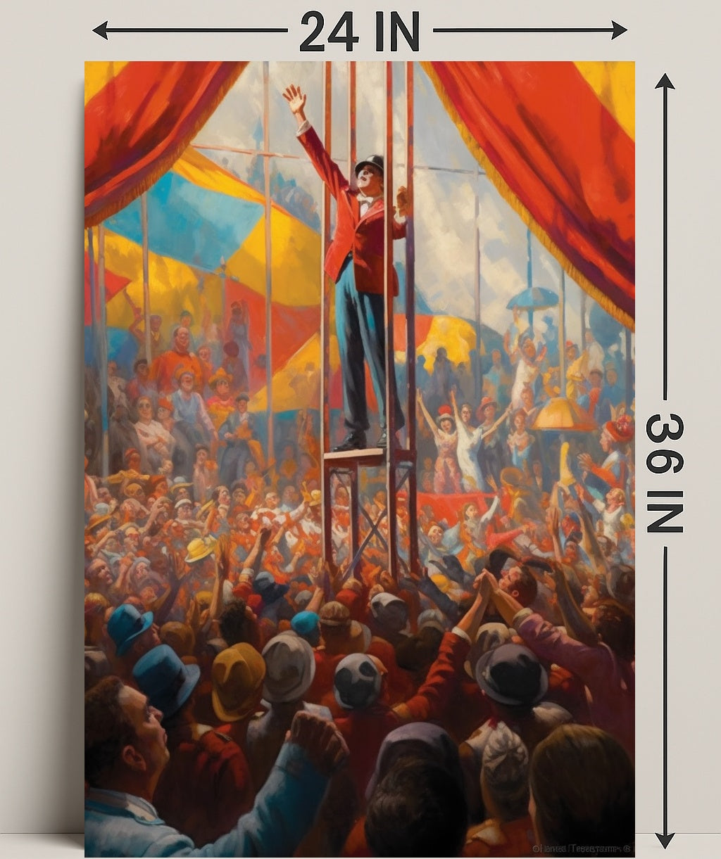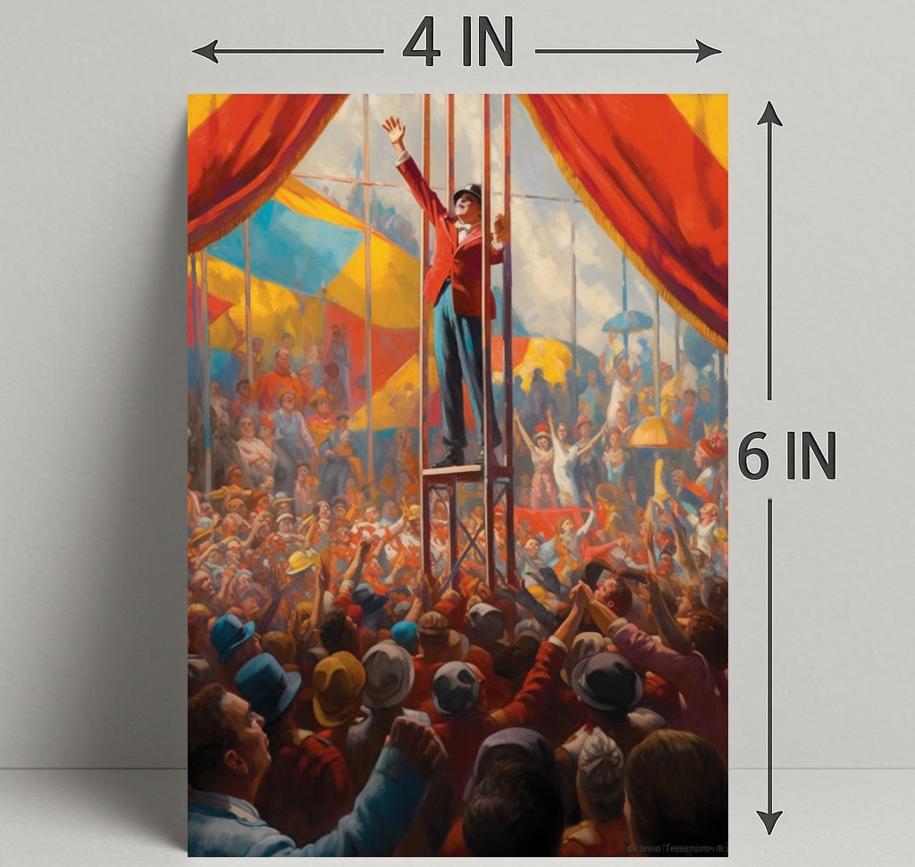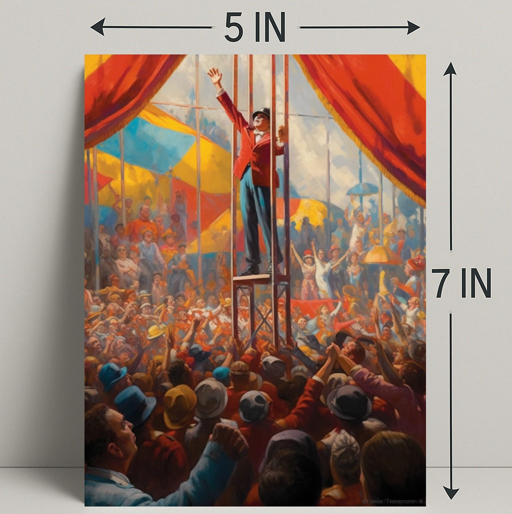 Perfect for homes, studios, and themed spaces, this poster blends scenic storytelling with decorative impact. Its energetic composition—crowds reaching up, flags and tents in the background, and the ringmaster’s uplifted arm—creates an instant focal point that sparks conversation and nostalgia.