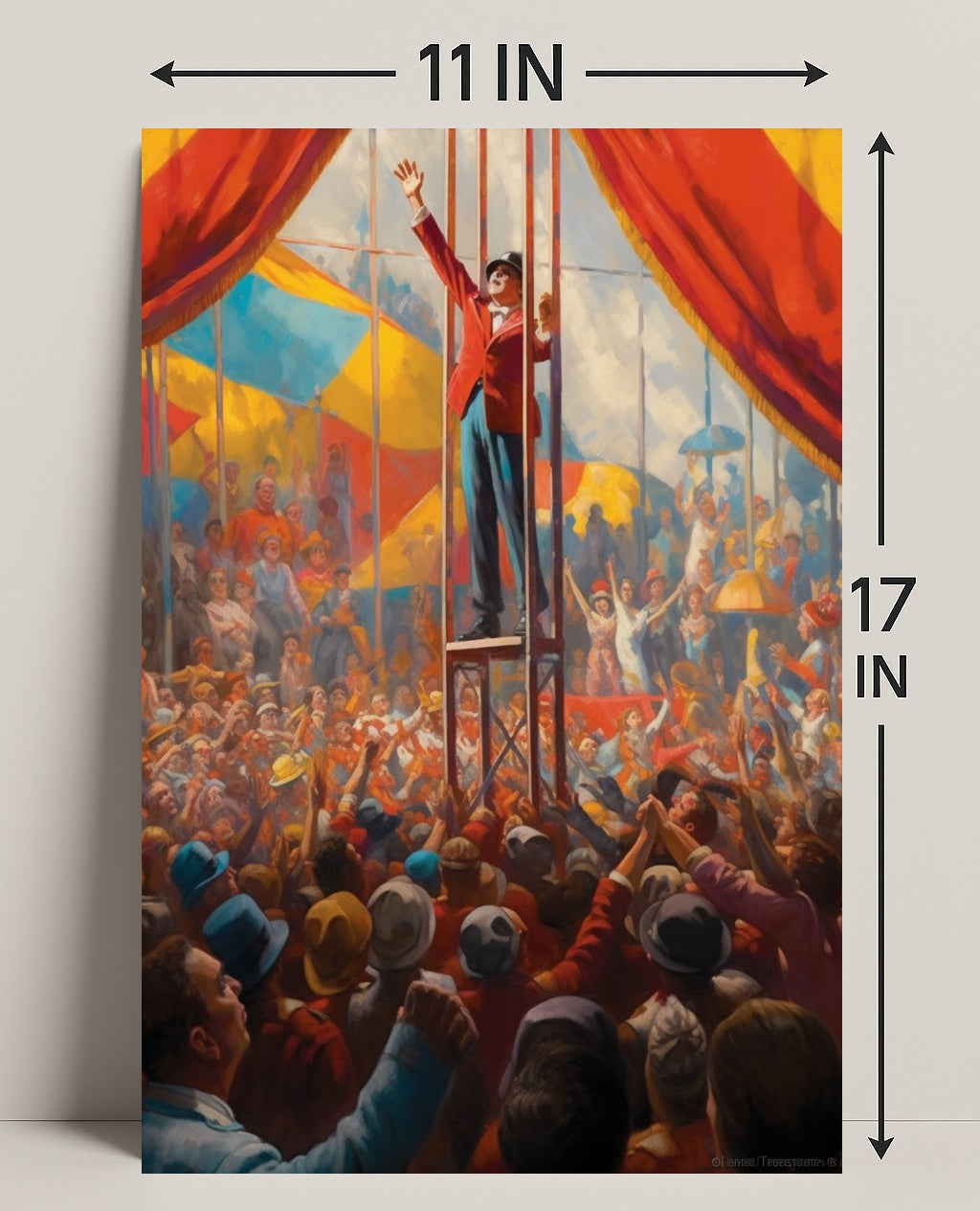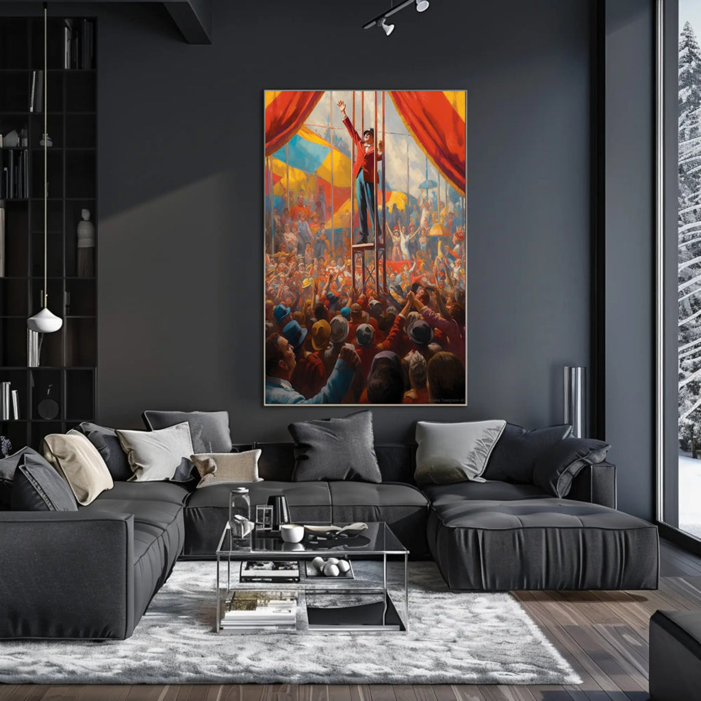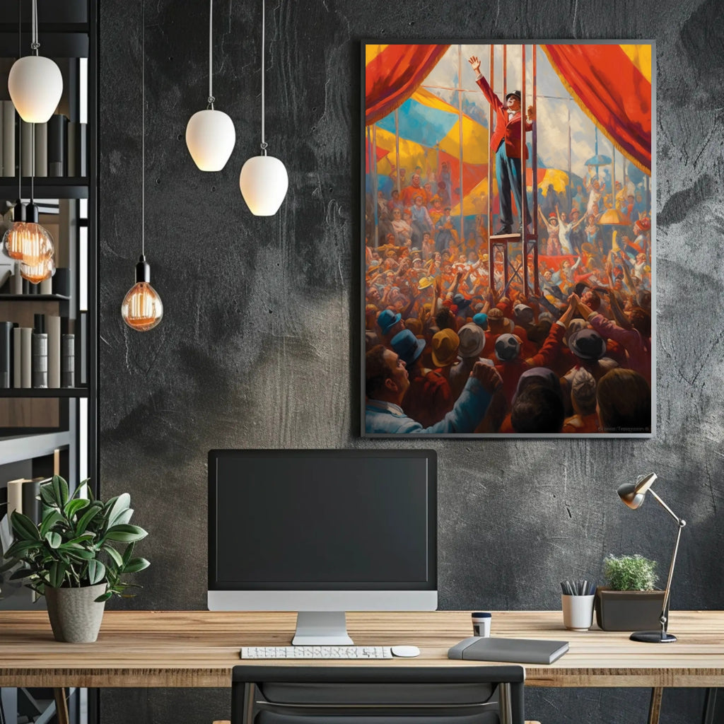 Perfect for homes, studios, and themed spaces, this poster blends scenic storytelling with decorative impact. Its energetic composition—crowds reaching up, flags and tents in the background, and the ringmaster’s uplifted arm—creates an instant focal point that sparks conversation and nostalgia.