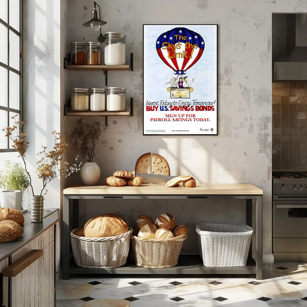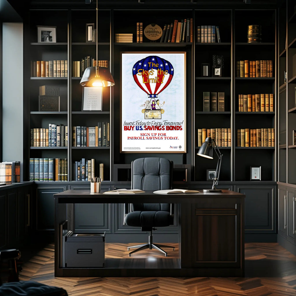 The Sky's the Limit! Poster from PosterGoat is an inspiring, vintage-style art print that brings wanderlust and optimism to any room. This scenic minimalist poster features a patriotic hot-air balloon emblazoned with stars and stripes carrying three symbolic figures — an astronaut, a graduate, and a professional — floating above a soft, clouded sky. Bold, hand-drawn lettering proclaims "The Sky's the Limit!" for an uplifting focal point that sparks conversation and motivation.
