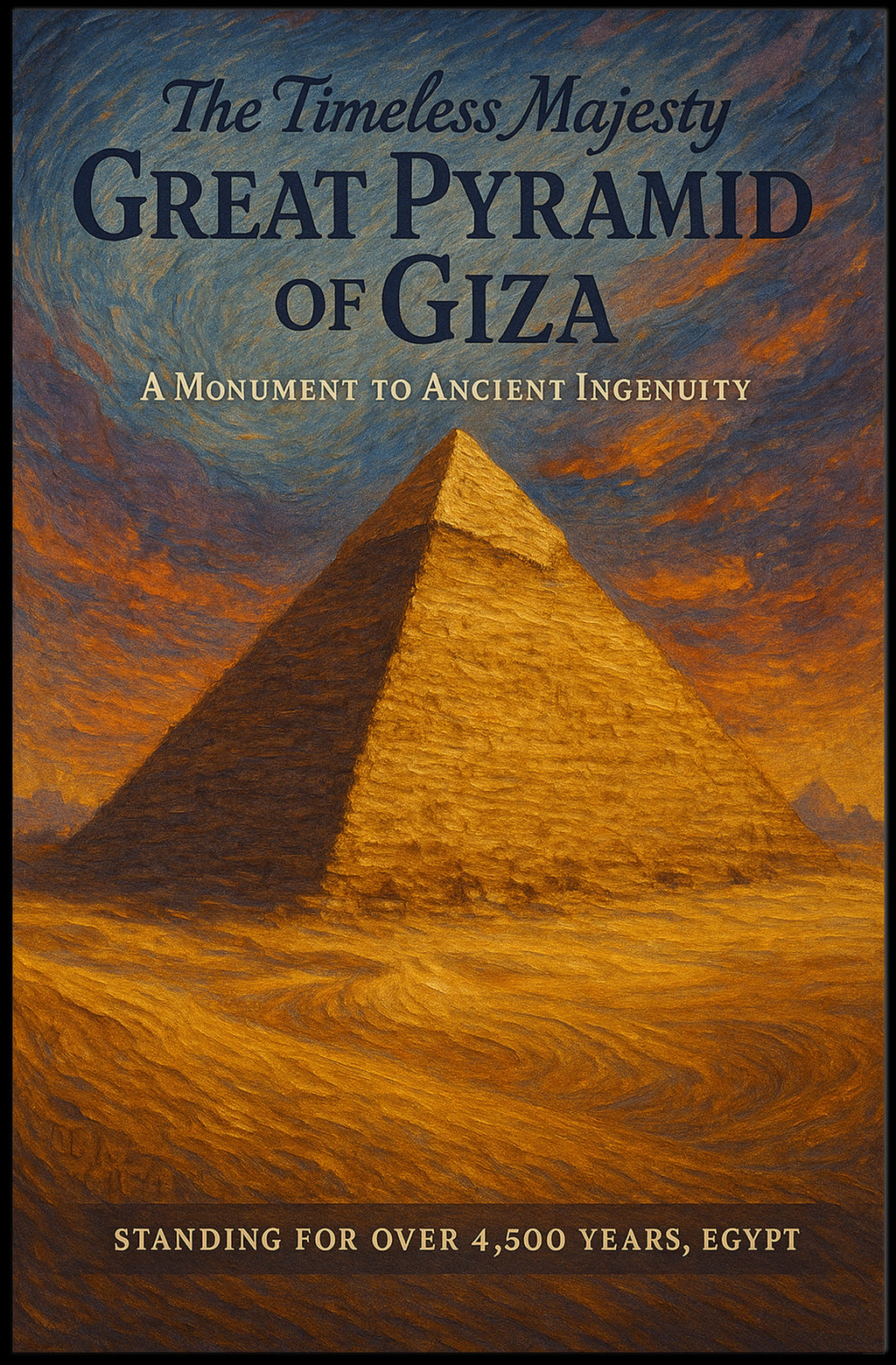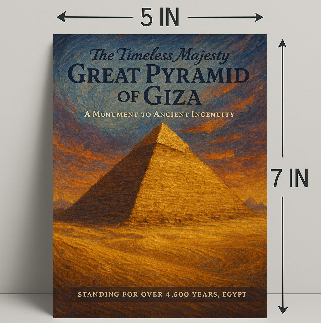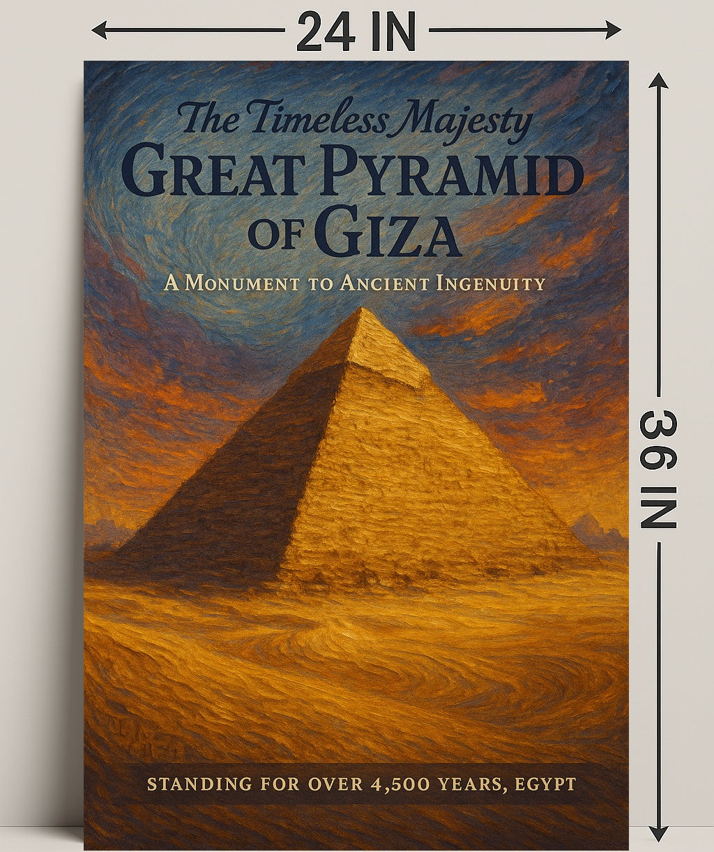 The Timeless Majesty Of The Great Poster from PosterGoat brings the Great Pyramid of Giza into your home as a dramatic, museum-quality poster that celebrates ancient ingenuity. Rendered in rich, textured brushstrokes, the warm golden pyramid rises against a swirling blue-and-amber sky—an evocative focal point for any room.